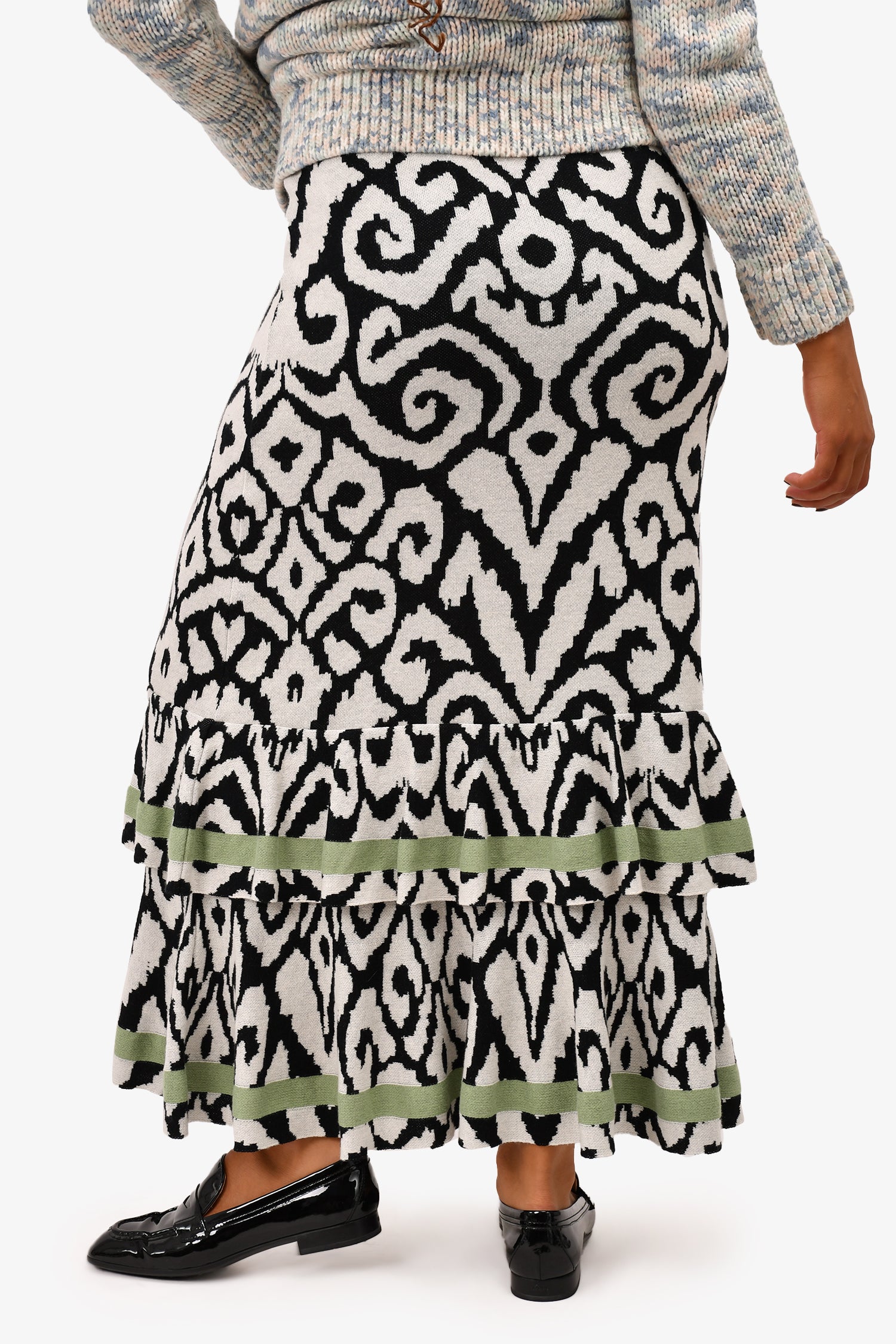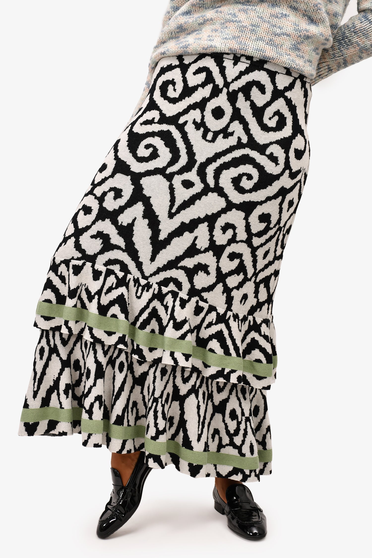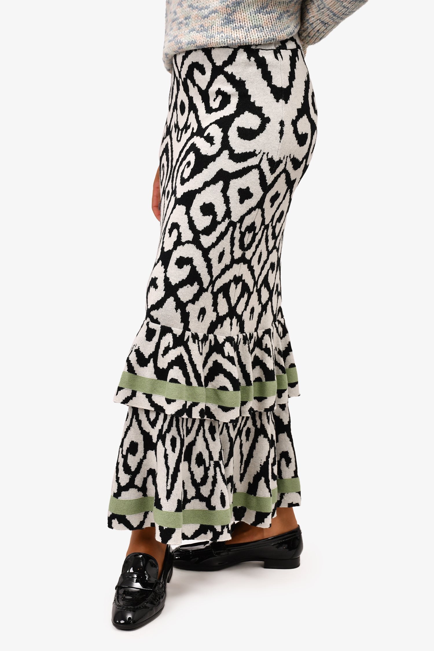 Refresh availabilityJohanna Ortiz Black/Cream Ruffle Detail Midi Skirt. Tonal stitching.