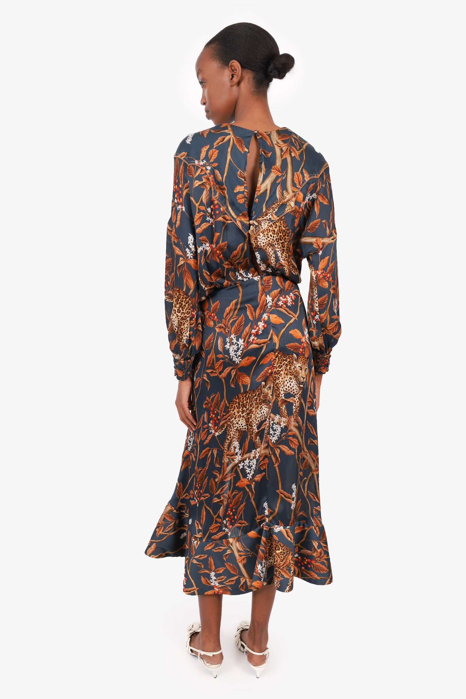 Refresh availabilityJohanna Ortiz Green/Brown Jaguar Printed Silky Maxi Dress. Rear button-up closure. Tonal stitching.