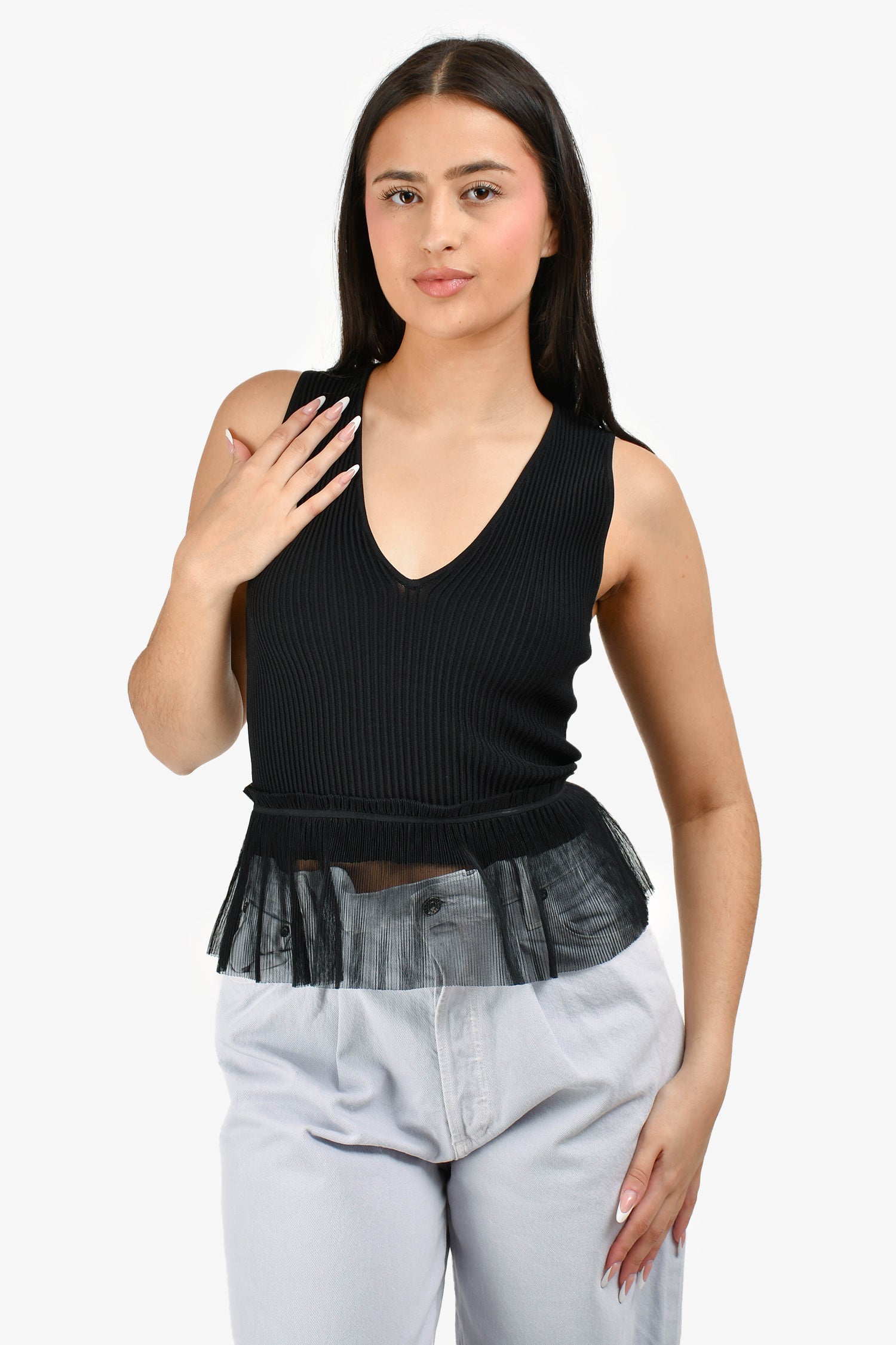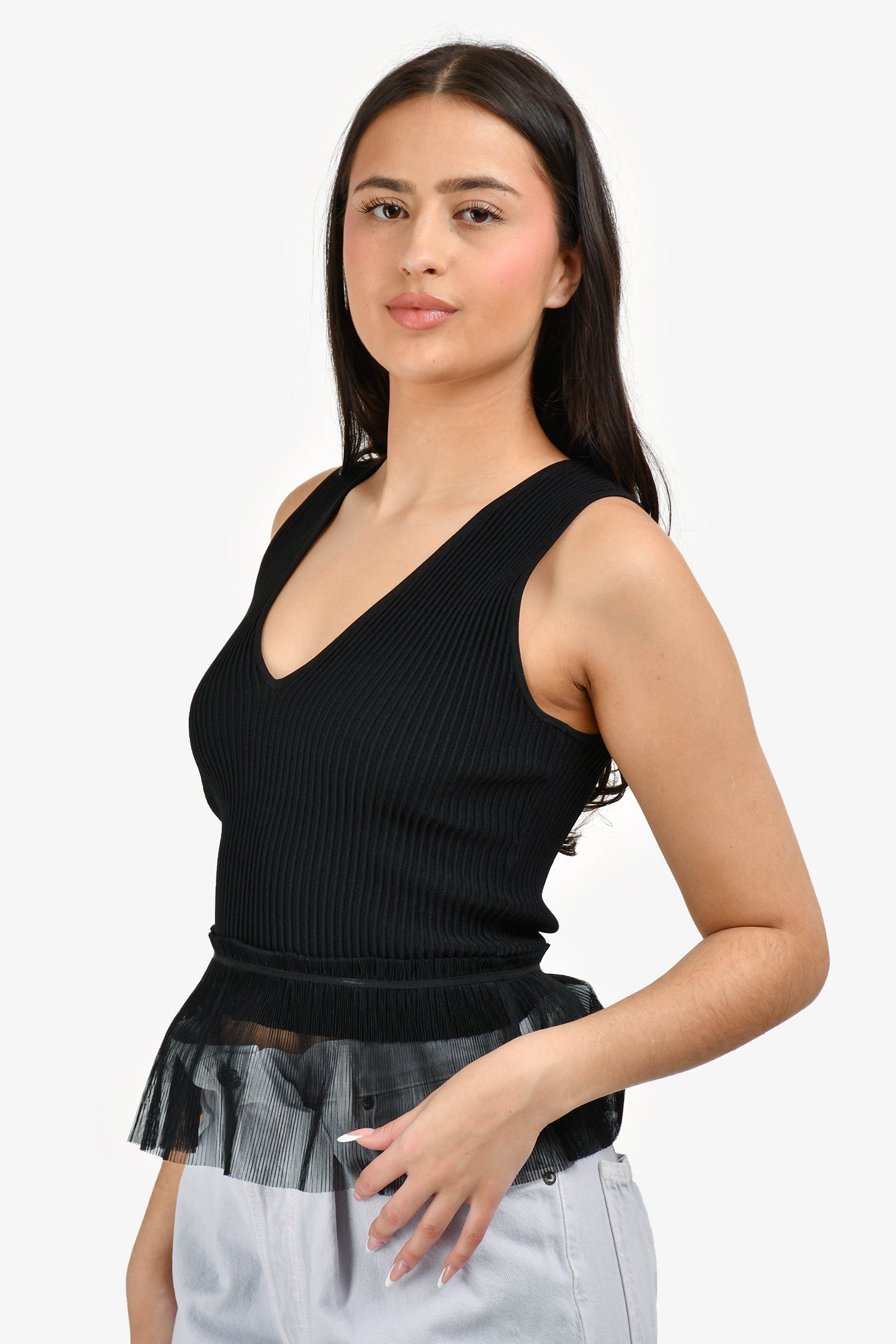 Refresh availabilityJonathan Simkhai Black Ribbed V Neck Peplum Top. Flowing fabric detail on the hem. Tonal stitching.