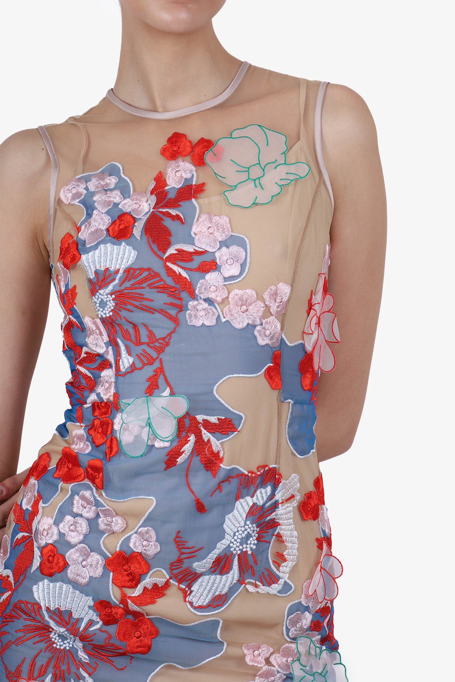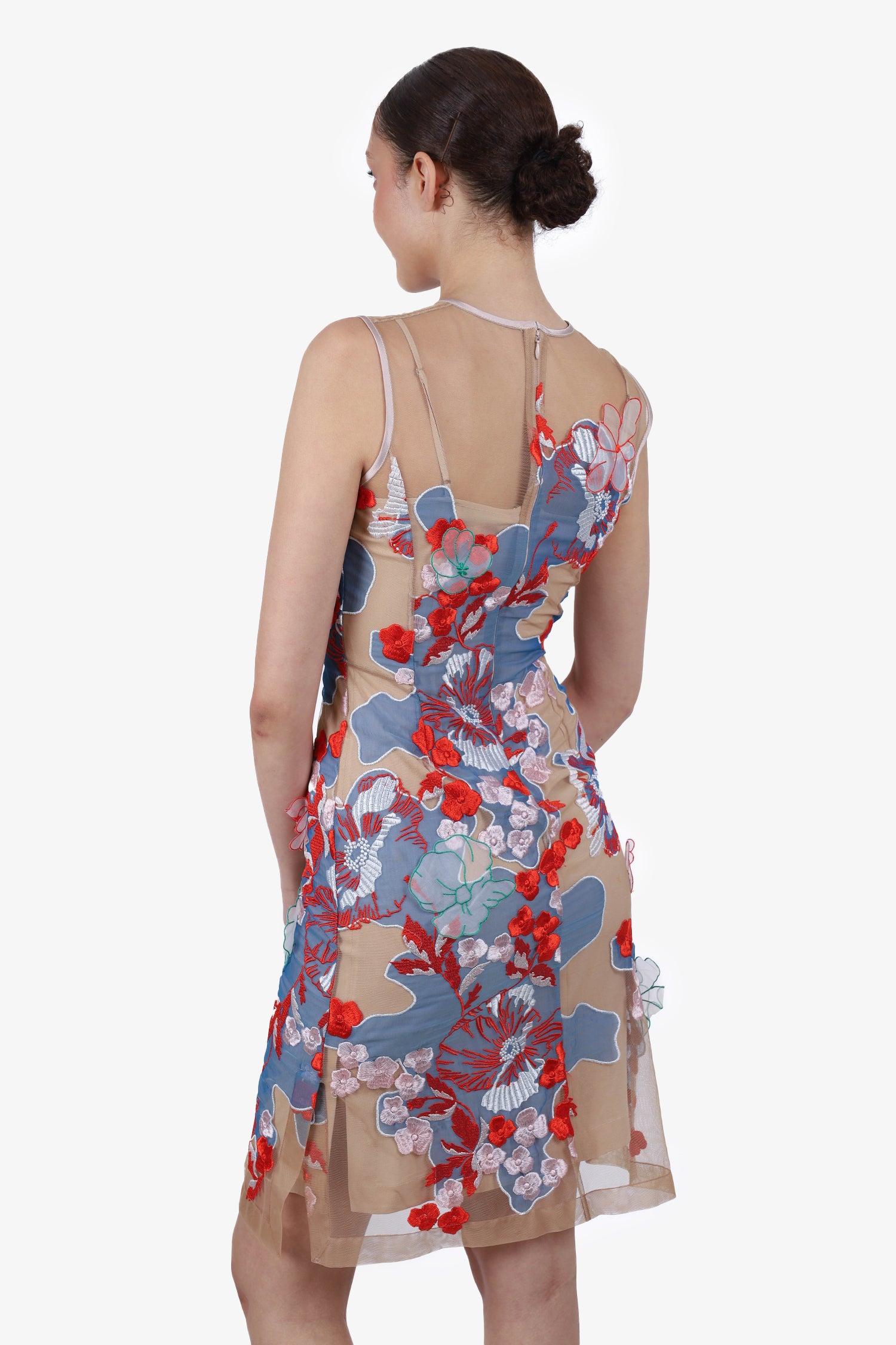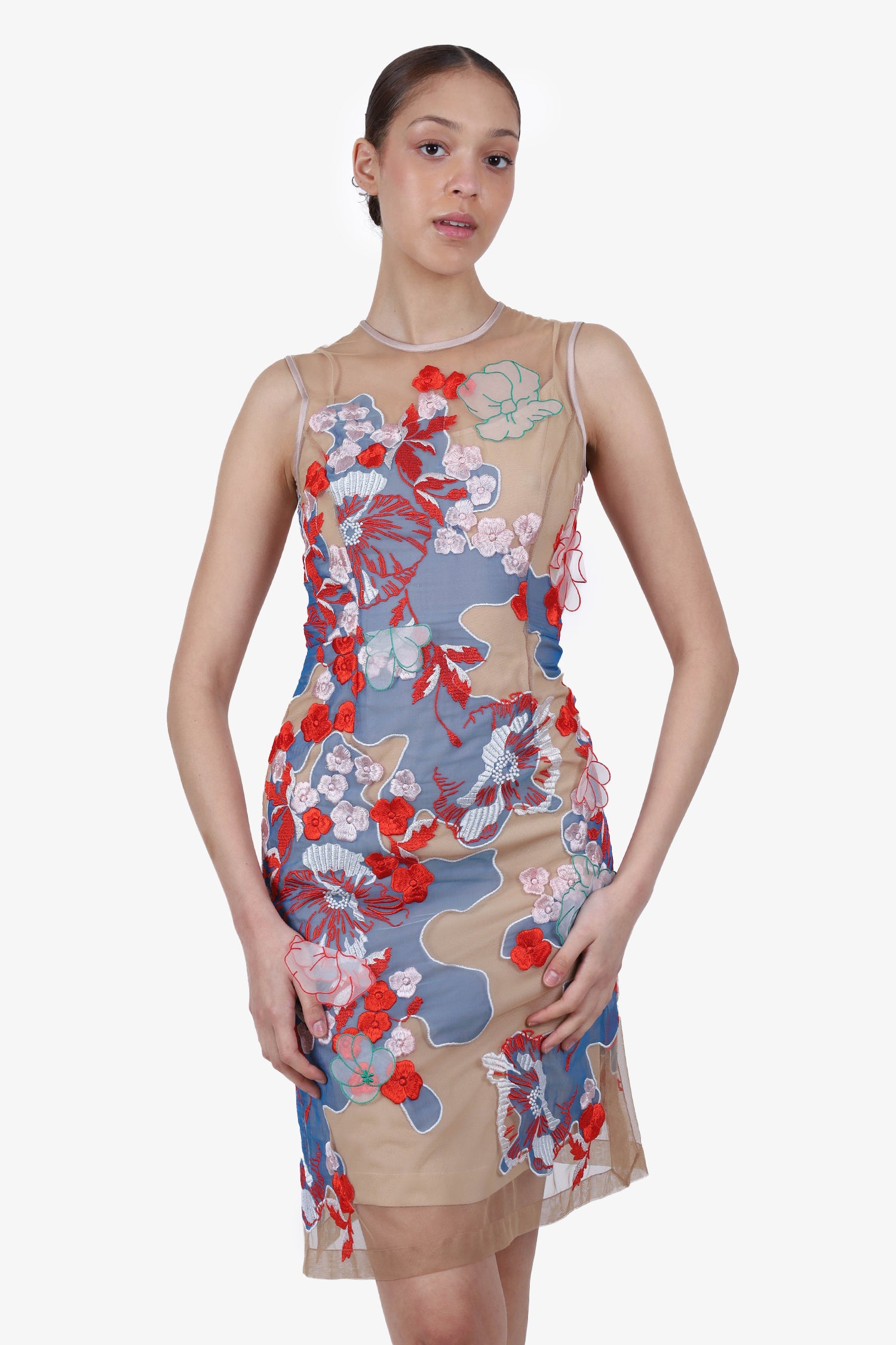 Refresh availabilityJonathan Saunders Beige/Multicolour Floral Appliqué Sleeveless Dress with Slip. Sheer nude collar. 3D floral appliqué throughout. Rear zipper at top and slit at hem. Nude slip.