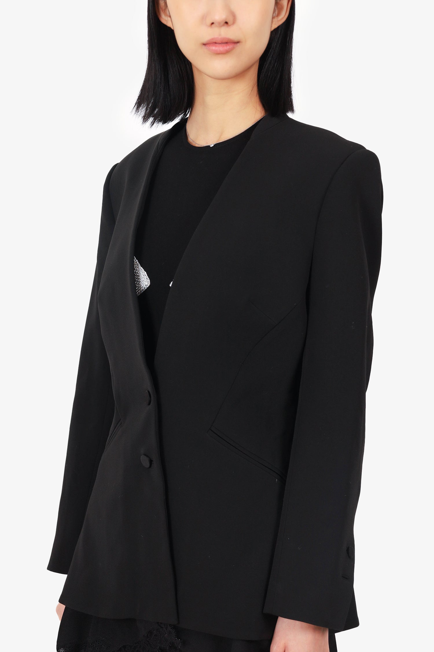 Refresh availabilityJonathan Simkhai Black Allie Lace-trim Blazer. Open front with button-up closure. Button-up sleeve cuff closure. 2 front slip pockets. Lined. Tonal stitching.