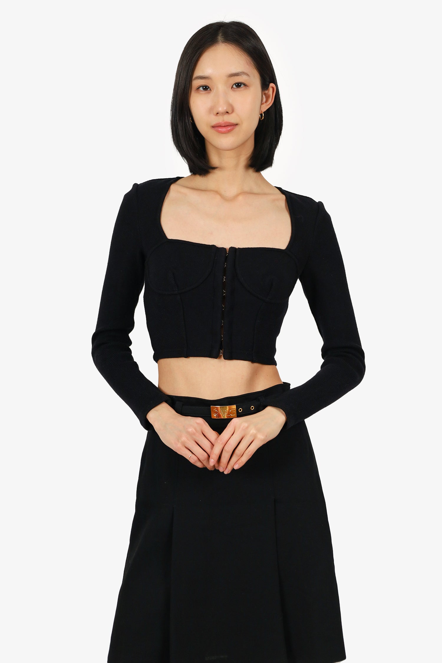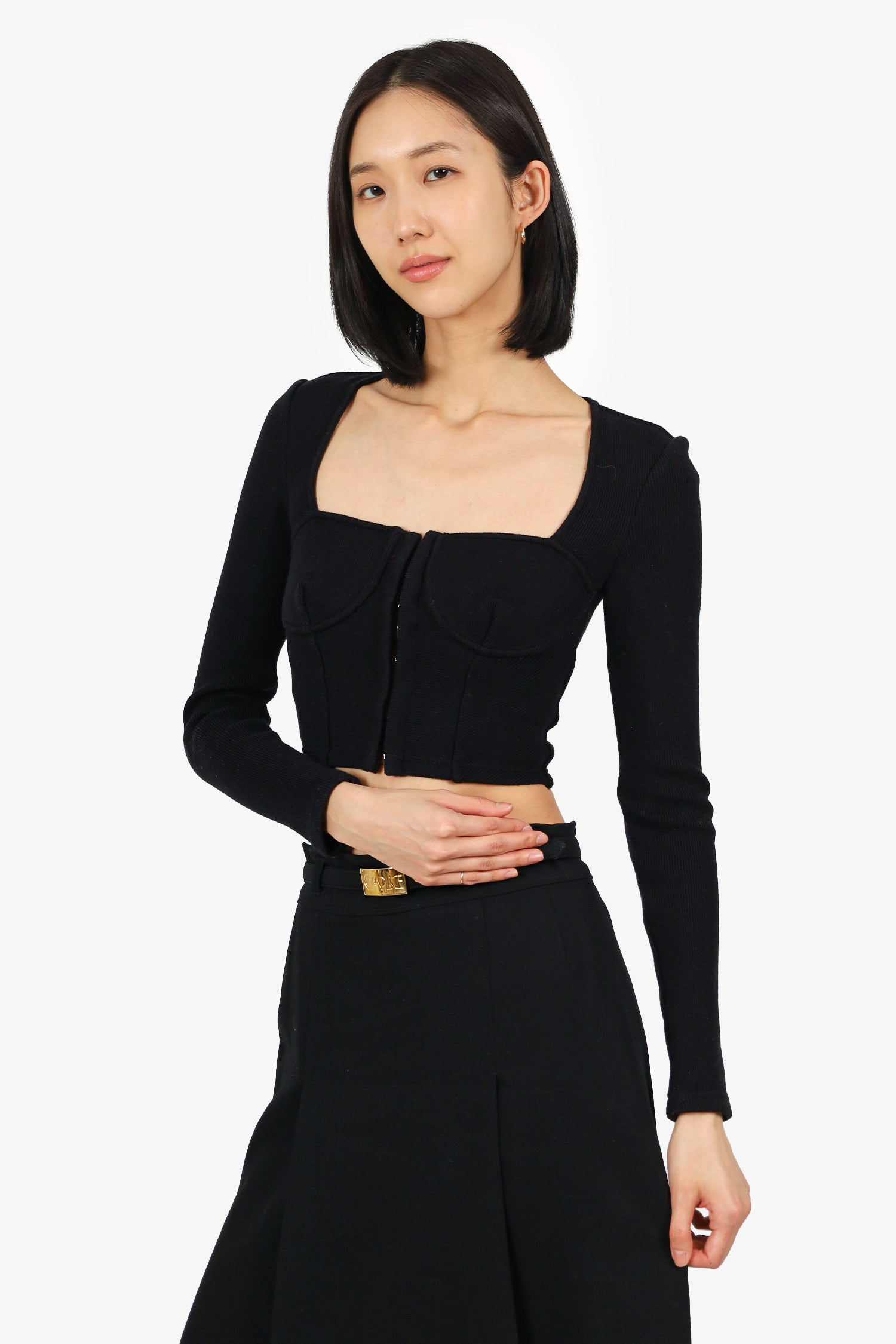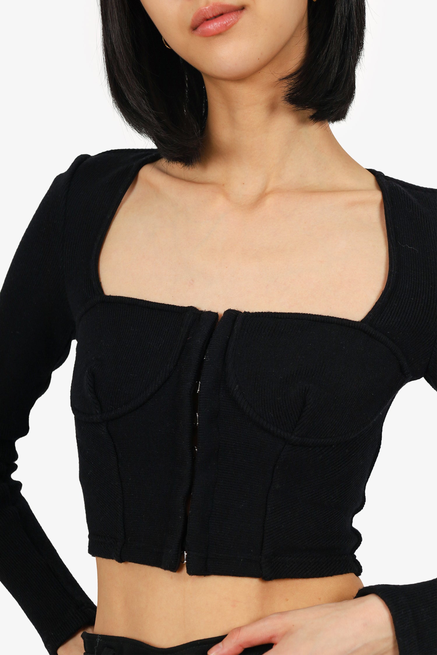 Refresh availabilityJonathan Simkhai Black Bustier Ribbed Knit Long Sleeve Top. Square-neckline. Front hook closure. Built-in under-cup wire. Silver-tone hardware. Tonal stitching.