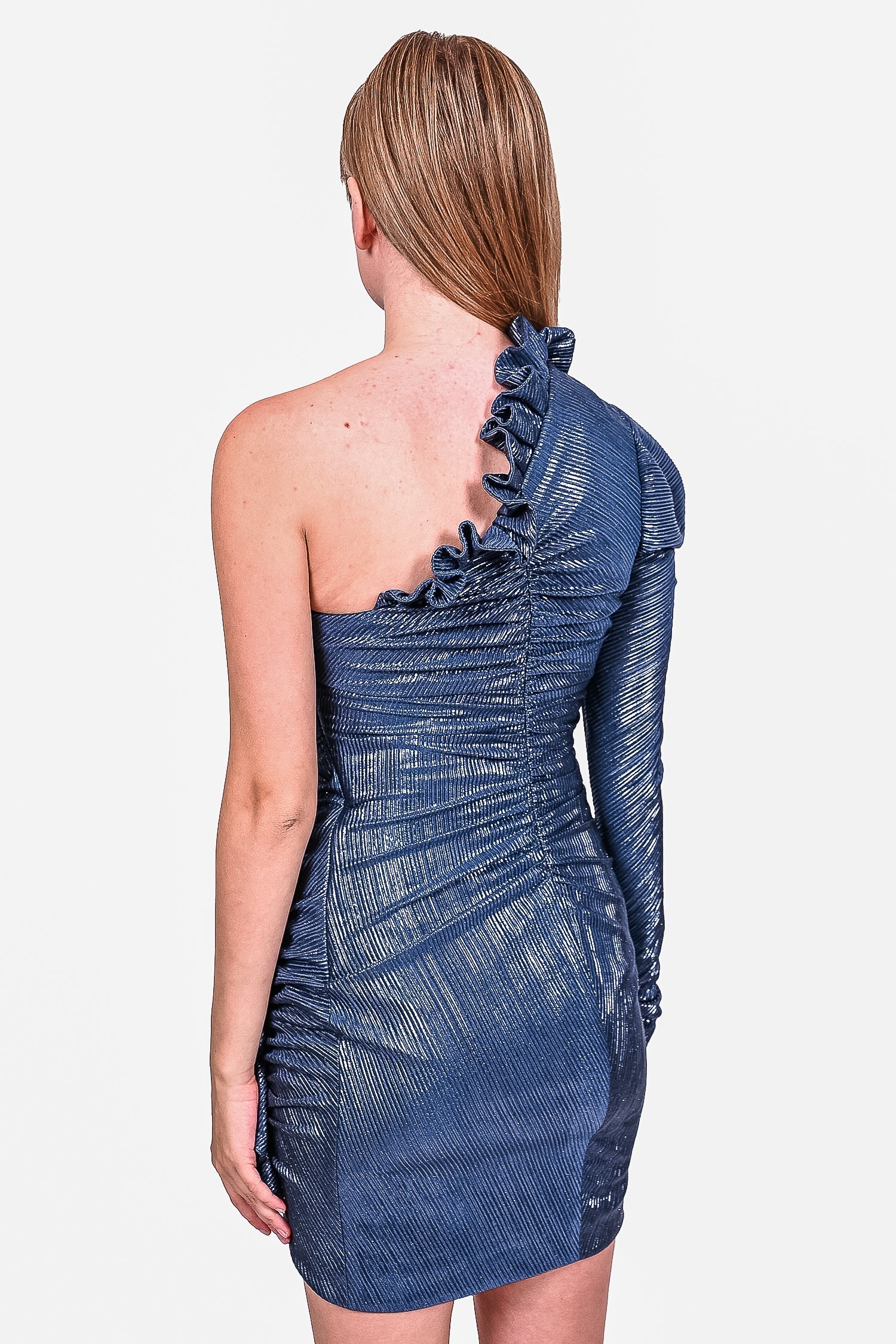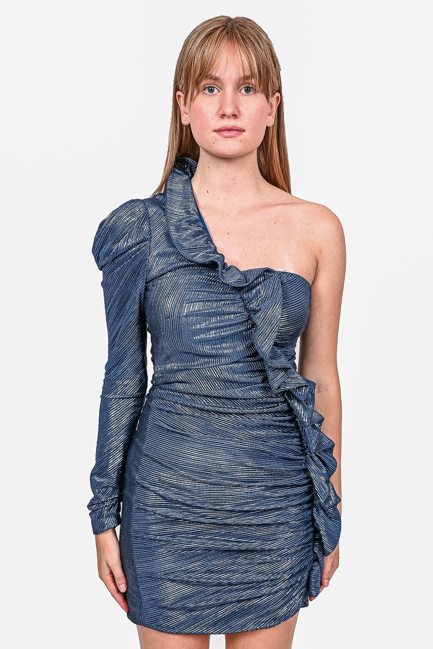 Refresh availabilityJonathan Simkhai Blue Foil Pleated One Shoulder Dress. Side zip closure. Lined. Tonal stitching.