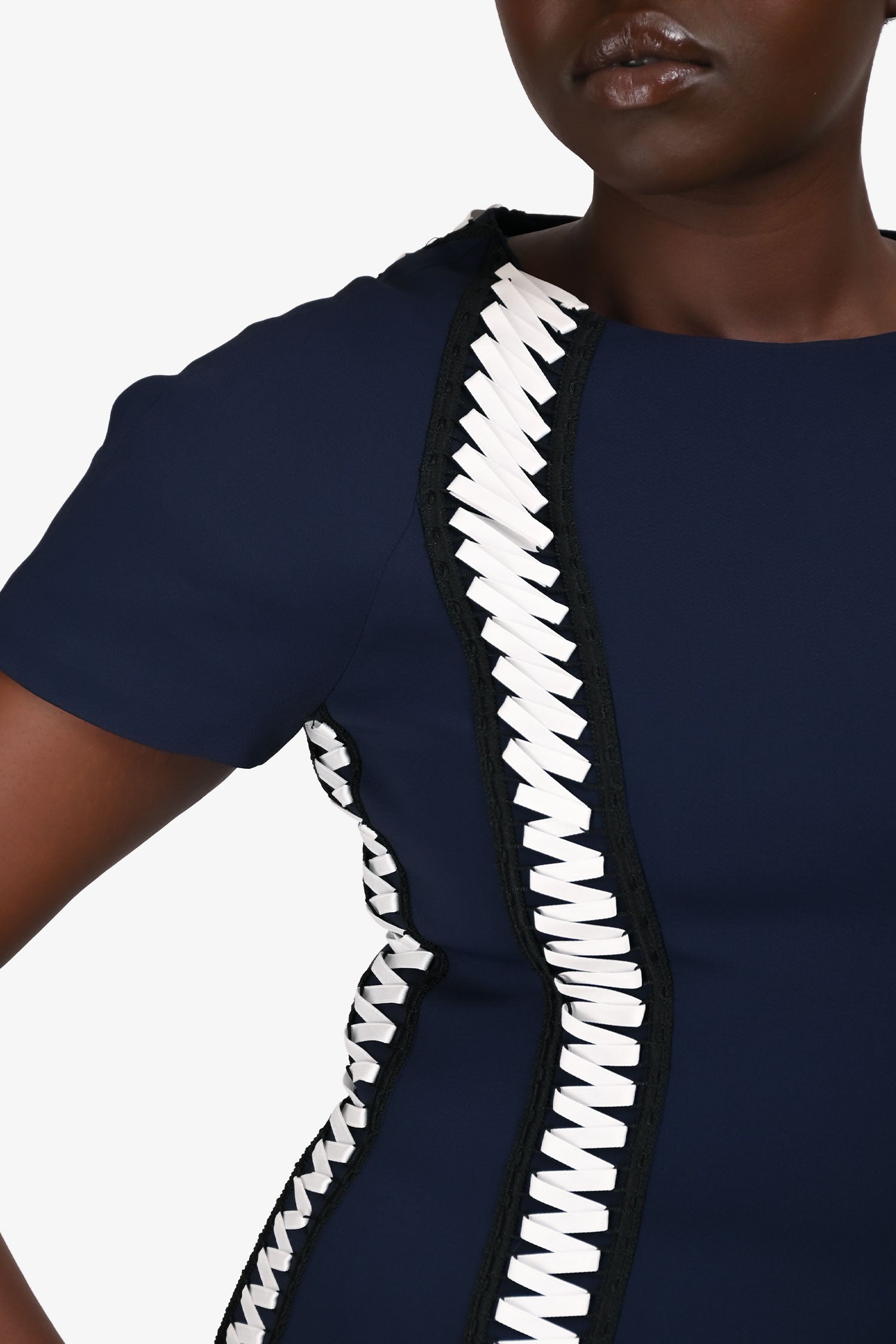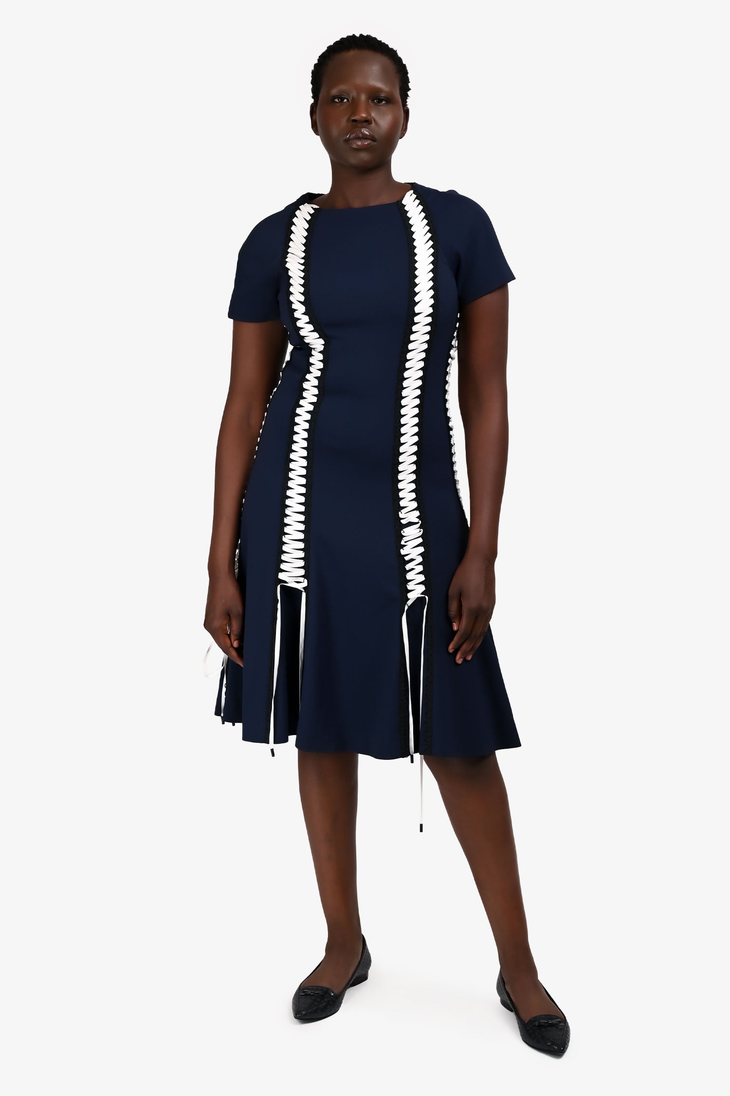 Refresh availabilityJonathan Simkhai Navy White Tie Detail Fitted Midi Dress. Round neck. Rear zip and hook closure. Lined.