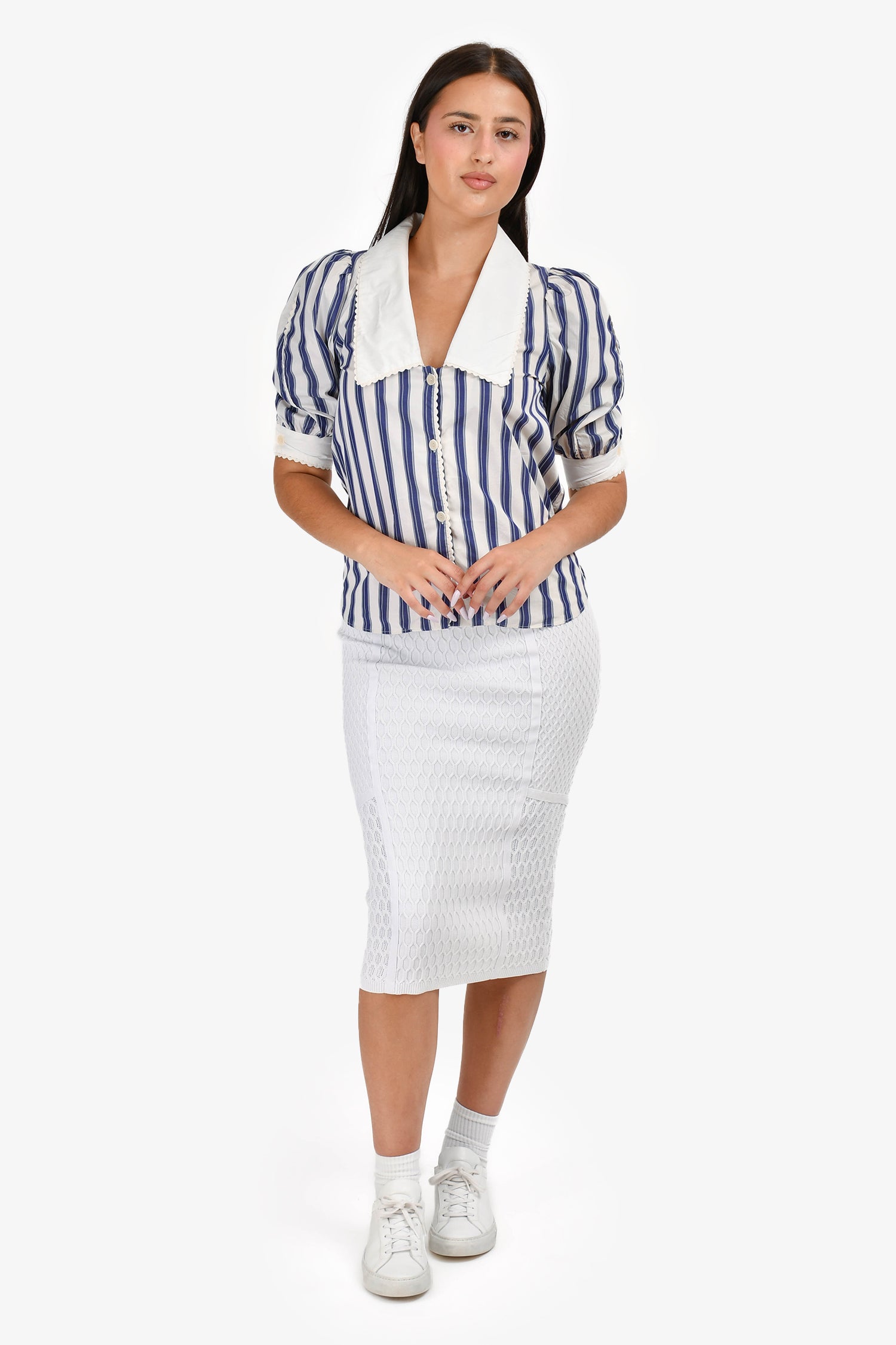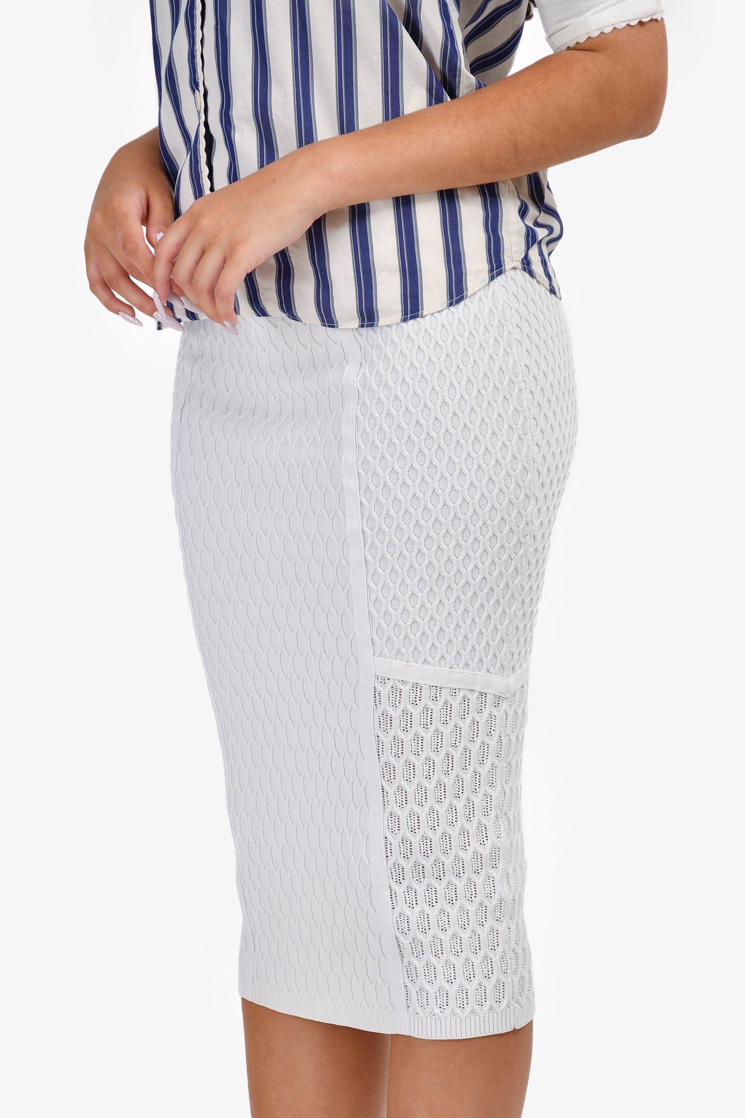 Refresh availabilityJonathan Simkhai White Knitted Midi Skirt. High-rise waist. Ribbed knit texture. Fitted silhouette with subtle flare at hem. Pull-on. Tonal stitching.