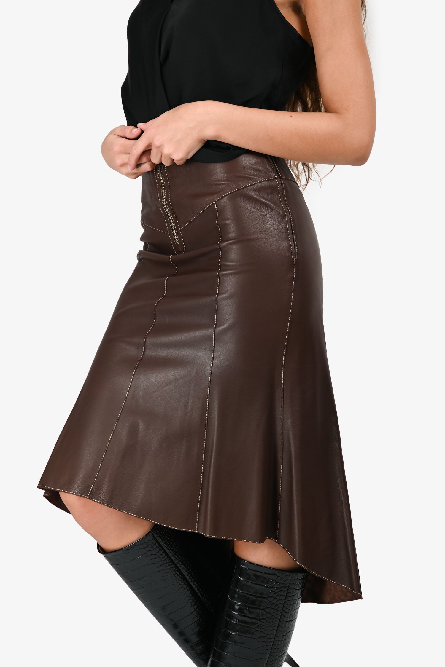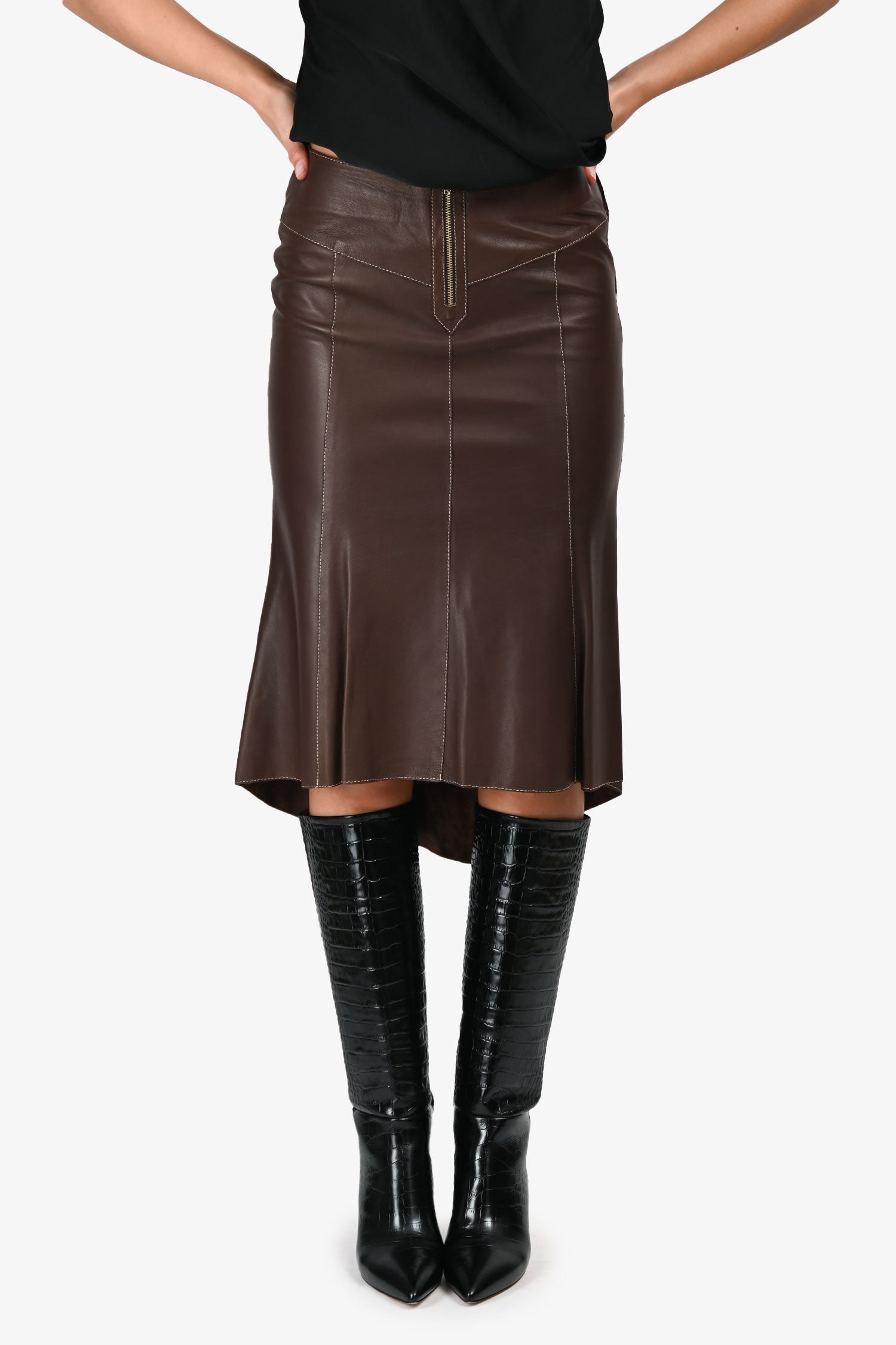 Refresh availabilityJose Sanchez Brown Leather Stitch Detail Midi Skirt. Pull-on. Hidden side zipper closure. Zipper detailing in the front. Silver-tone hardware. Contrast stitching.