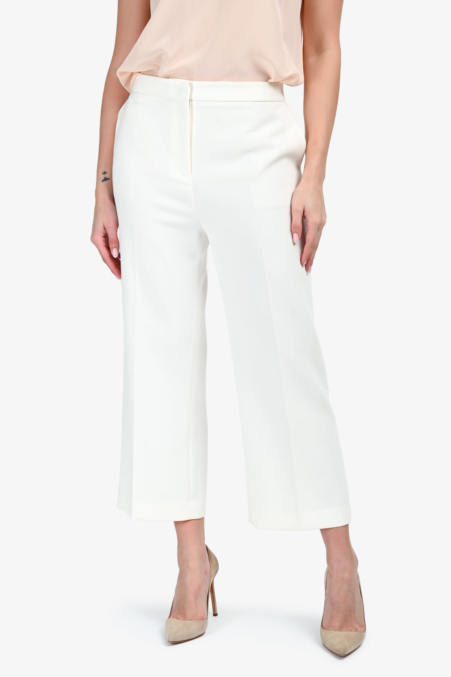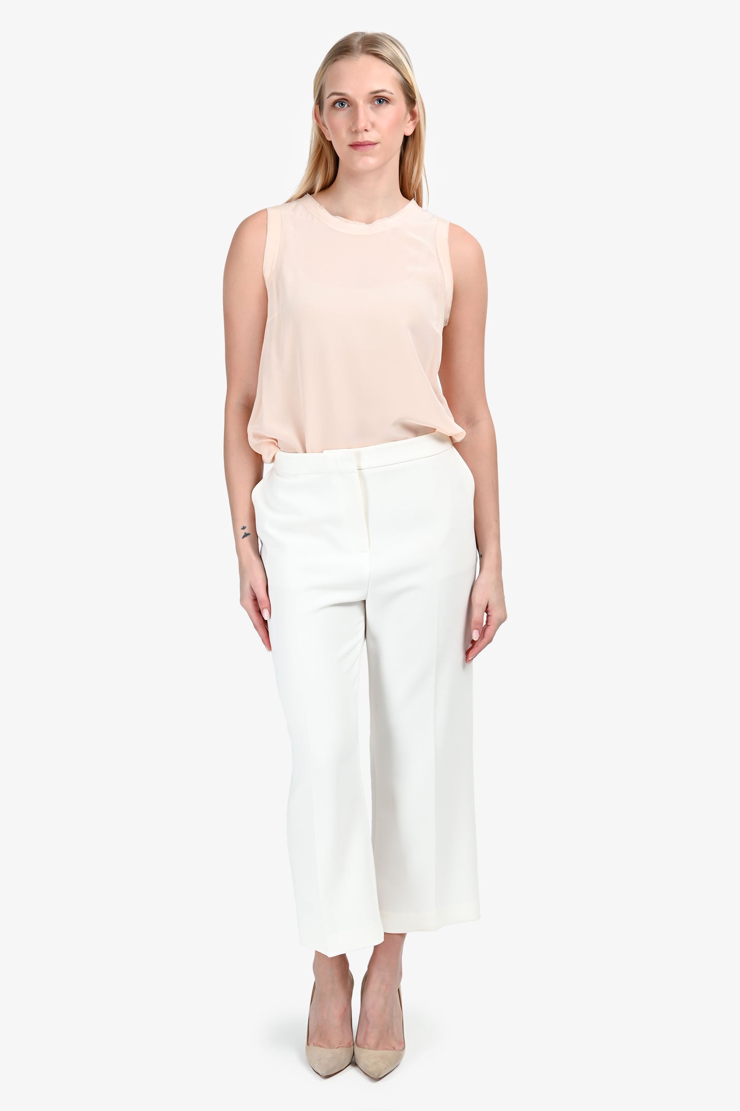 Refresh availabilityJudith & Charles Cream Straight Leg Trousers. Front zip and hook clasp closure. 2 exterior slip pockets; 2 rear welt pockets. Silver-tone hardware. Tonal stitching.