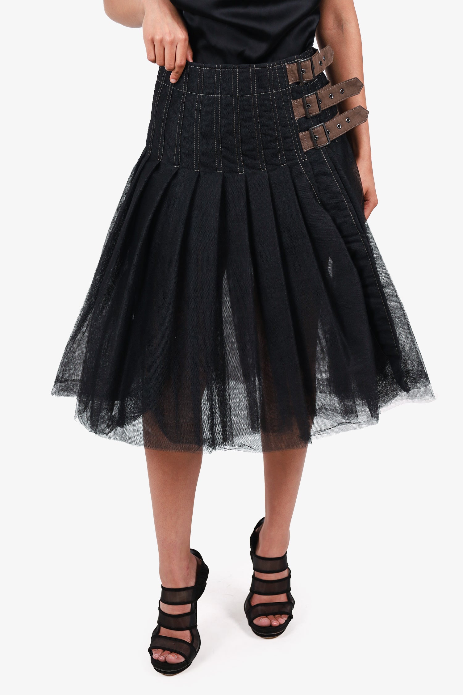 Refresh availabilityJunya Watanabe Comme des Garcons Black Tulle Pleated Kilt Skirt. Slip-on. Interior button-up closure. Side exterior straps with adjustable buckle closure. Contrast stitching.
