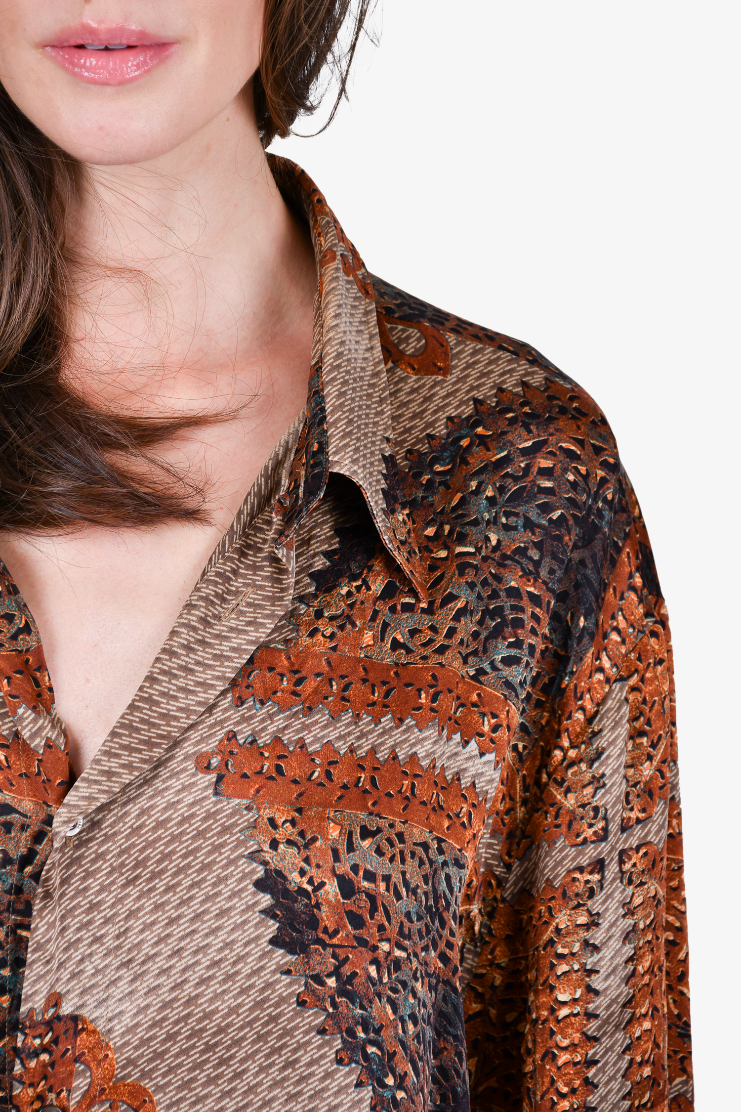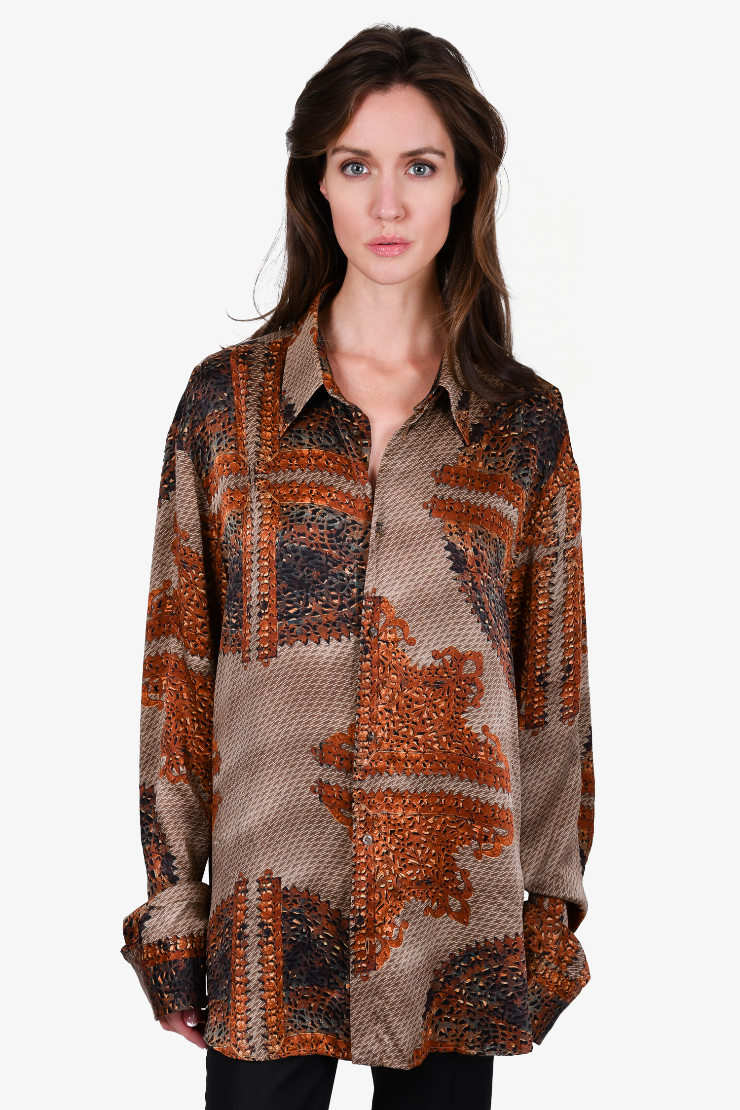 Refresh availabilityJust Cavalli Brown Silk Button Down Top. Button closure on the cuffs. Tonal stitching.