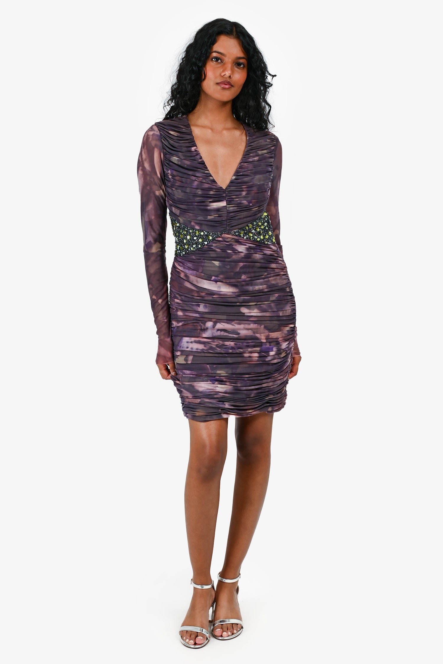 Refresh availabilityJust Cavalli Purple Crystal Embellished Ruched Long Sleeves Mini Dress. V-neckline. All-over ruching for a fitted silhouette. Crystal embellishments along the waist. Long sleeves. Side zip closure. Tonal stitching.