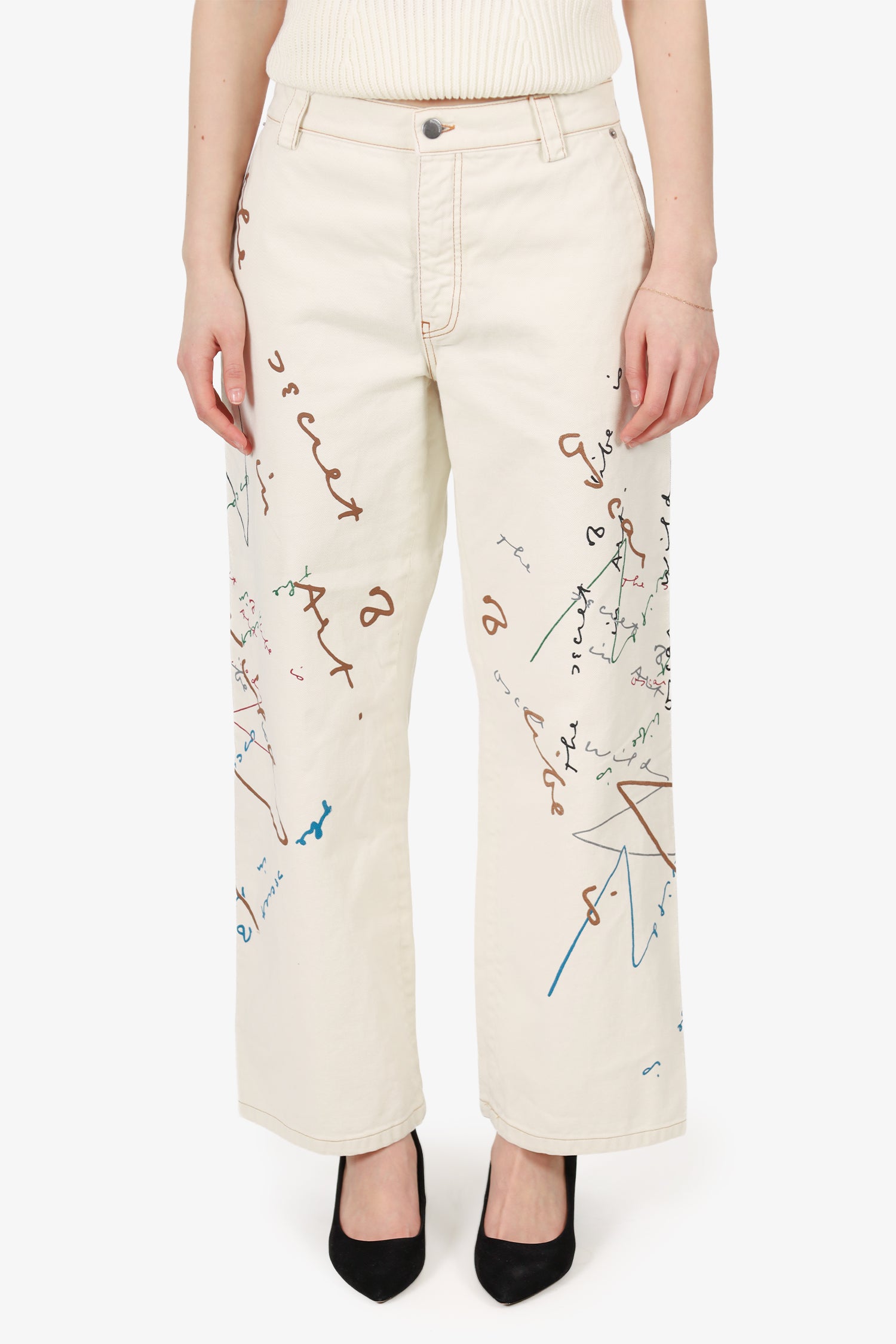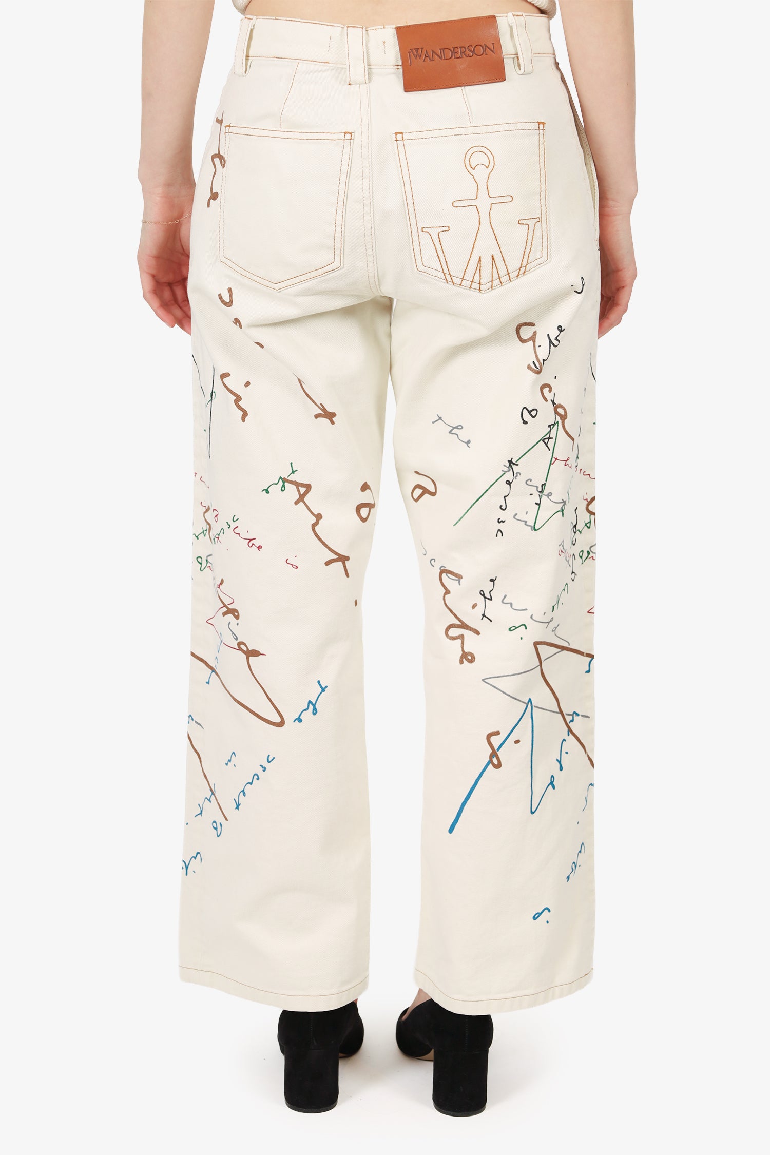 Refresh availabilityJW Anderson White/Multicolour Straight Leg Jeans. Front zip with button-up closure. Waistband belt-loops. 4 exterior slip pockets; 2 side, and 2 rear. Silver-tone hardware. Contrast and tonal stitching.