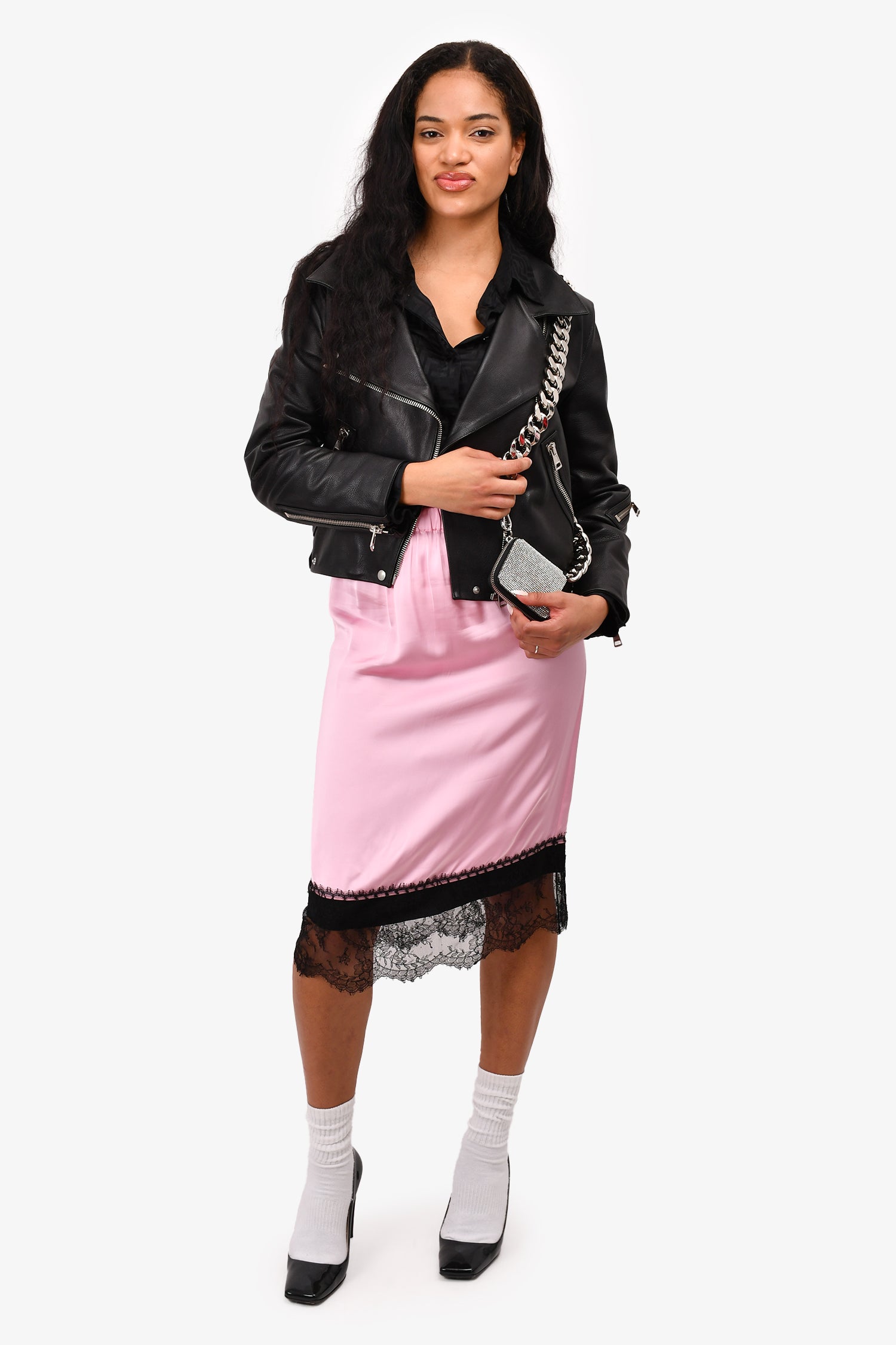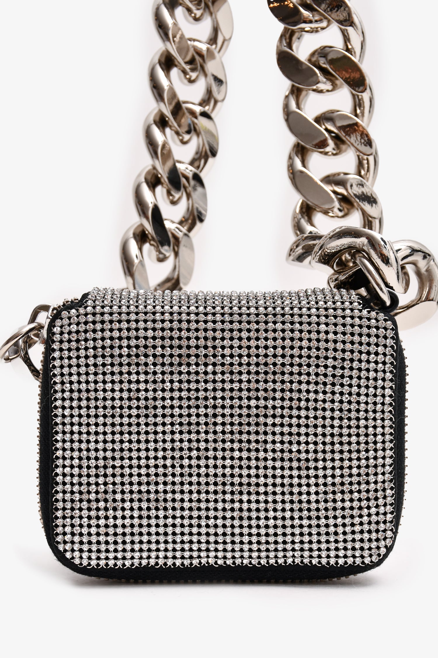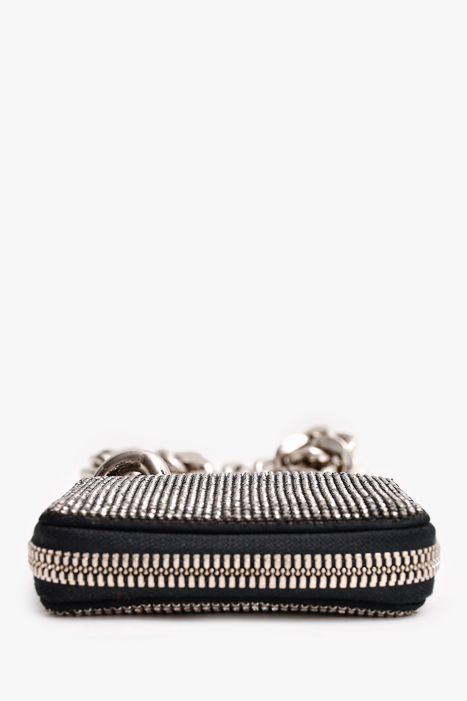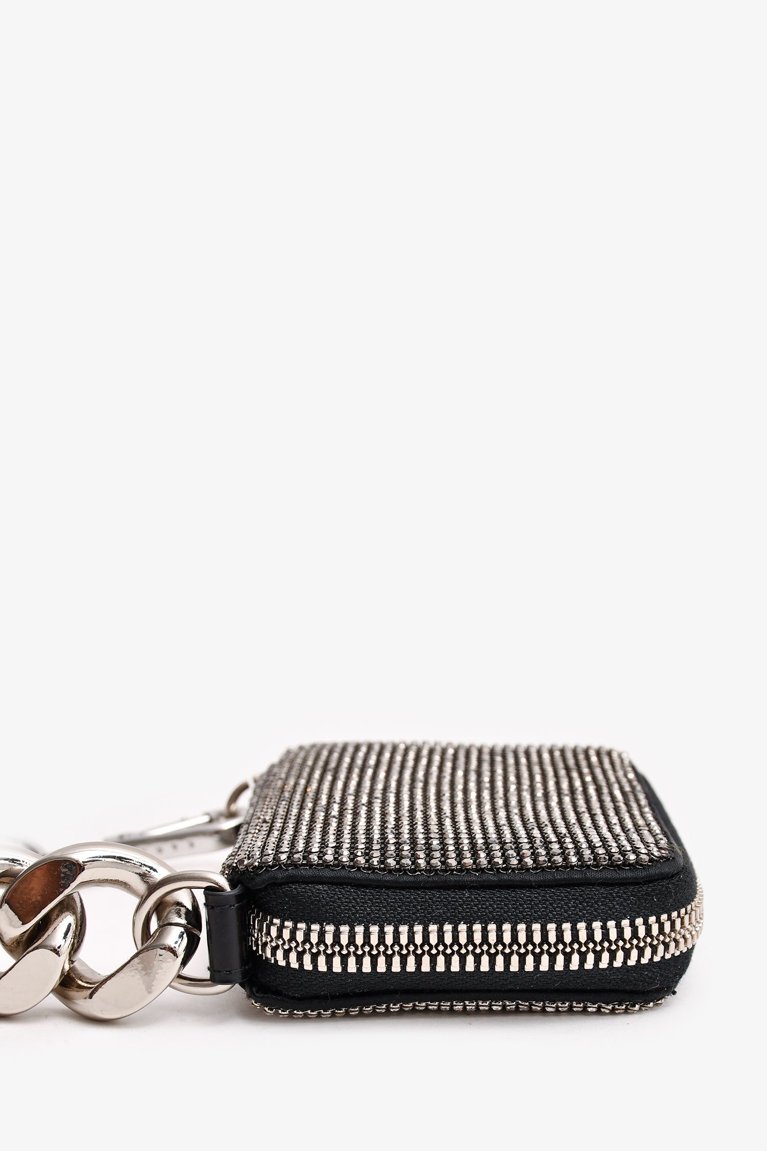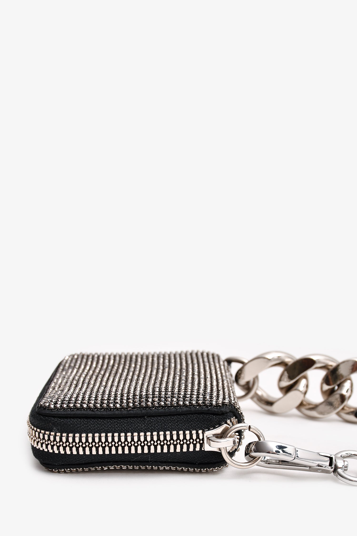 Refresh availabilityKara Silver/Black Crystal/Leather Chain Small Wallet With Tags. Silver-tone hardware. Three interior compartments. Two-tones crystals. Tonal stitching.