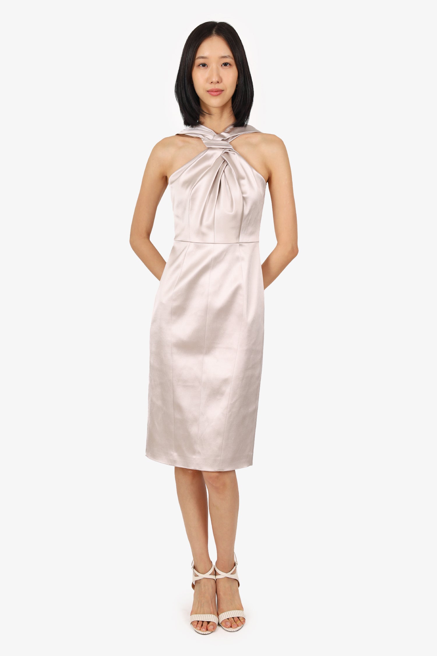 Refresh availabilityKaren Millen Champagne Satin Draped Crisscross Dress. Slip-on. Twist halter neckline. Rear zip closure. Rear centre split hem. Lined interior. Tonal stitching.