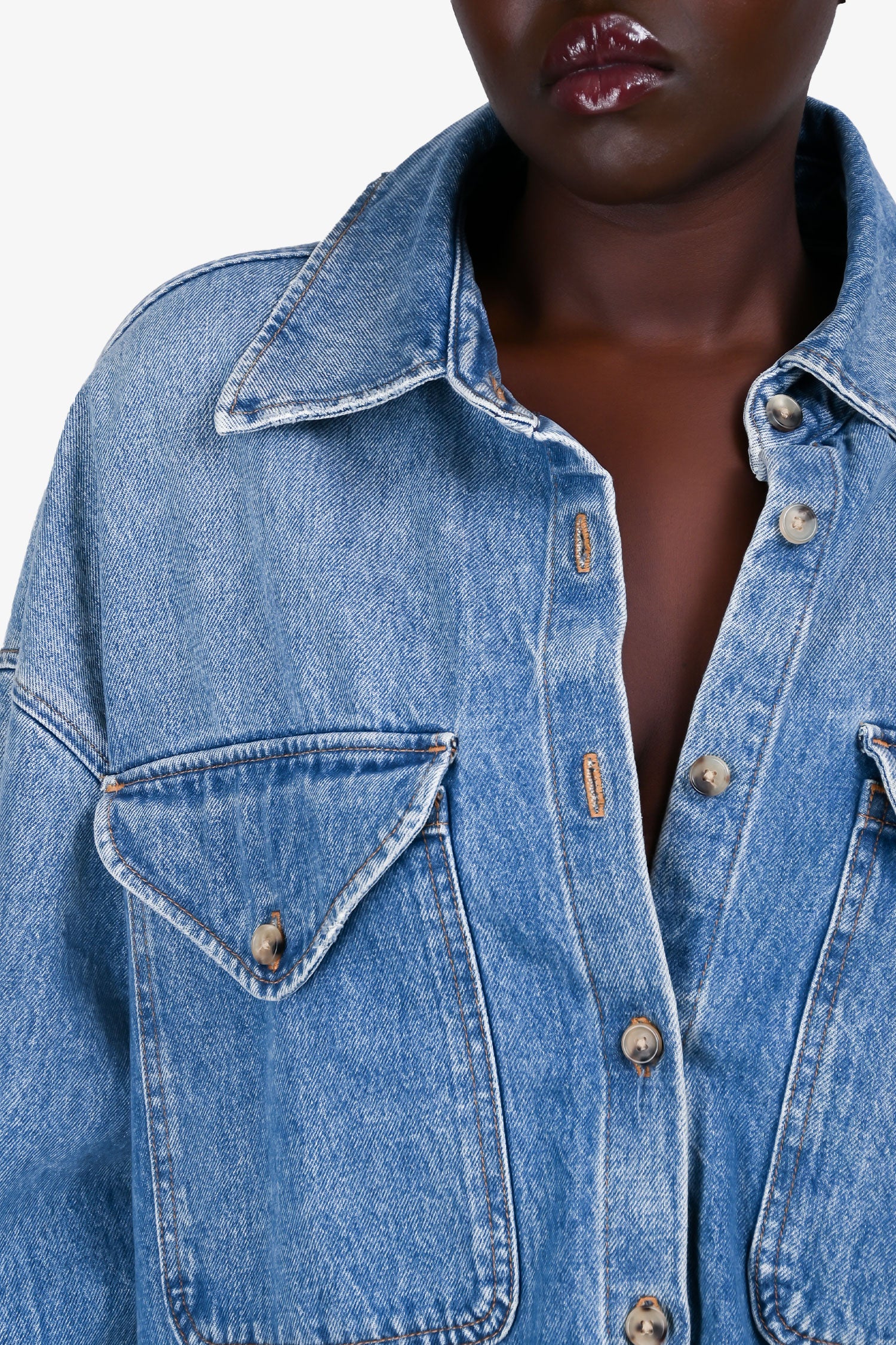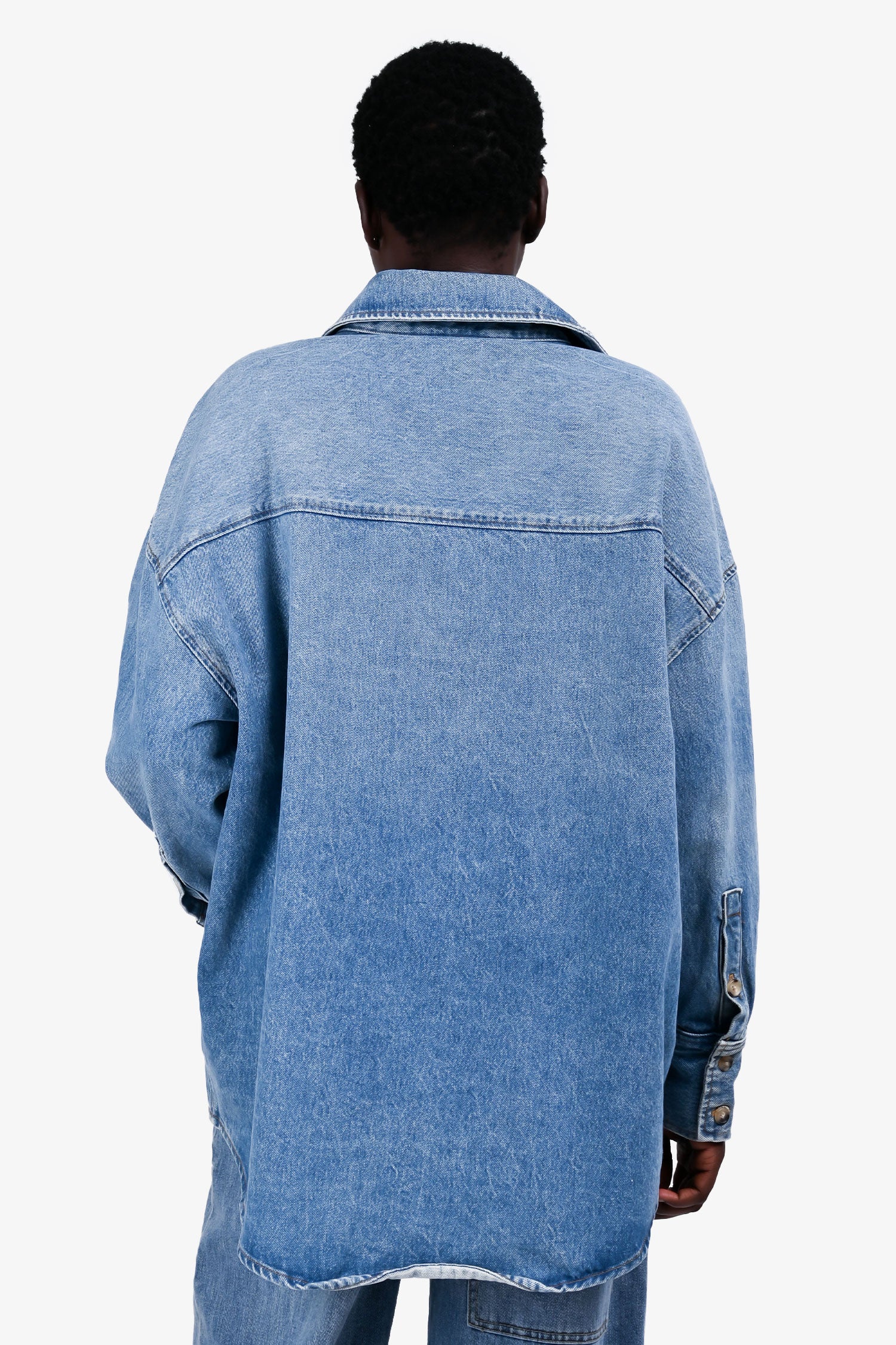 Refresh availabilityKhaite Blue Denim Button Down Oversized Jacket. Front chest pockets with button closure. Button closures on the cuffs.
