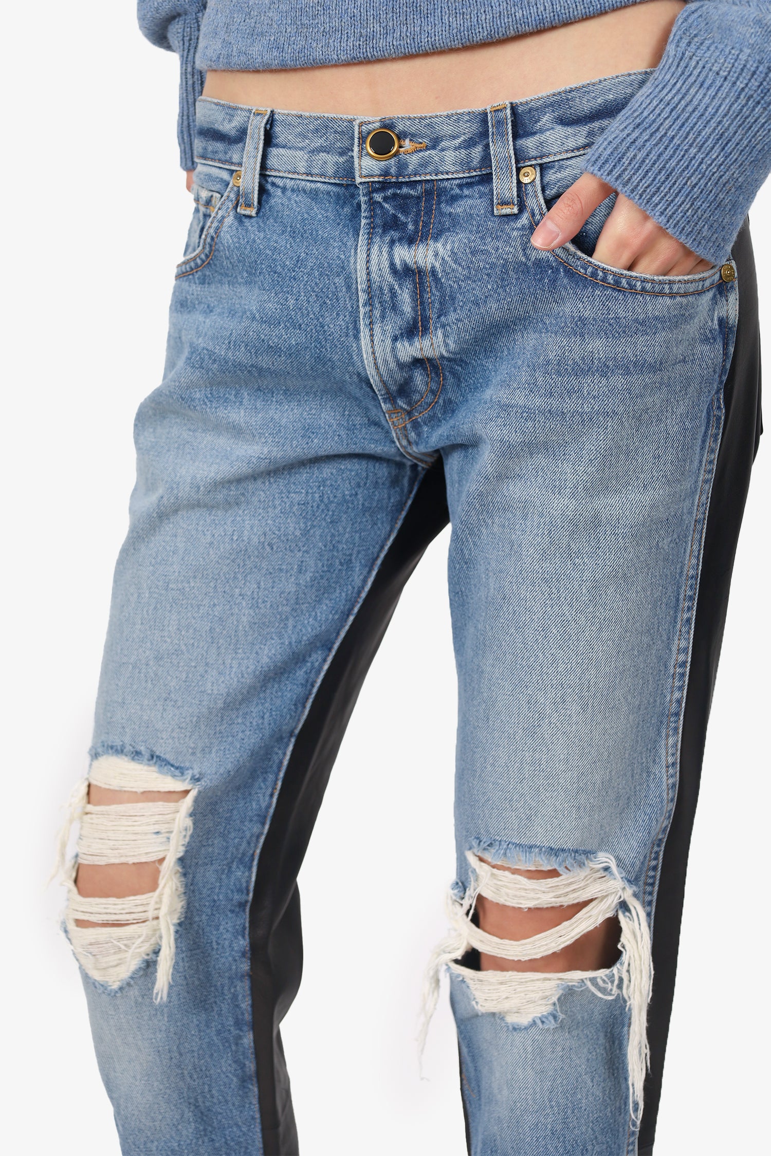 Refresh availabilityKhaite Blue/Black Denim/Leather Distressed Jeans. Slip on. Front zip with button-up closure. Waistband belt-loops. 5 exterior pockets; 2 front slip, 1 mini compartment, and 2 rear slip. Gold-tone hardware. Contrast stitching.