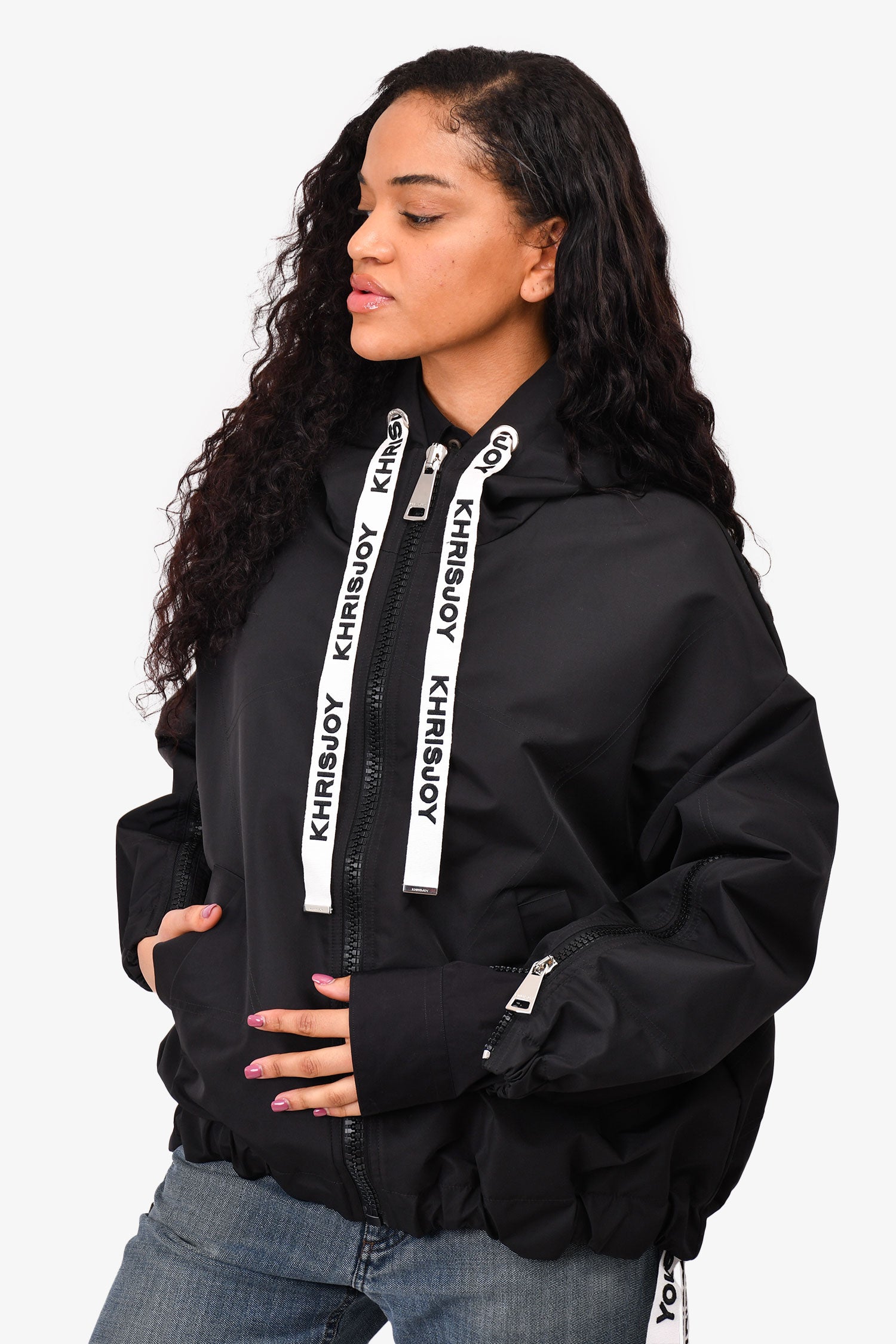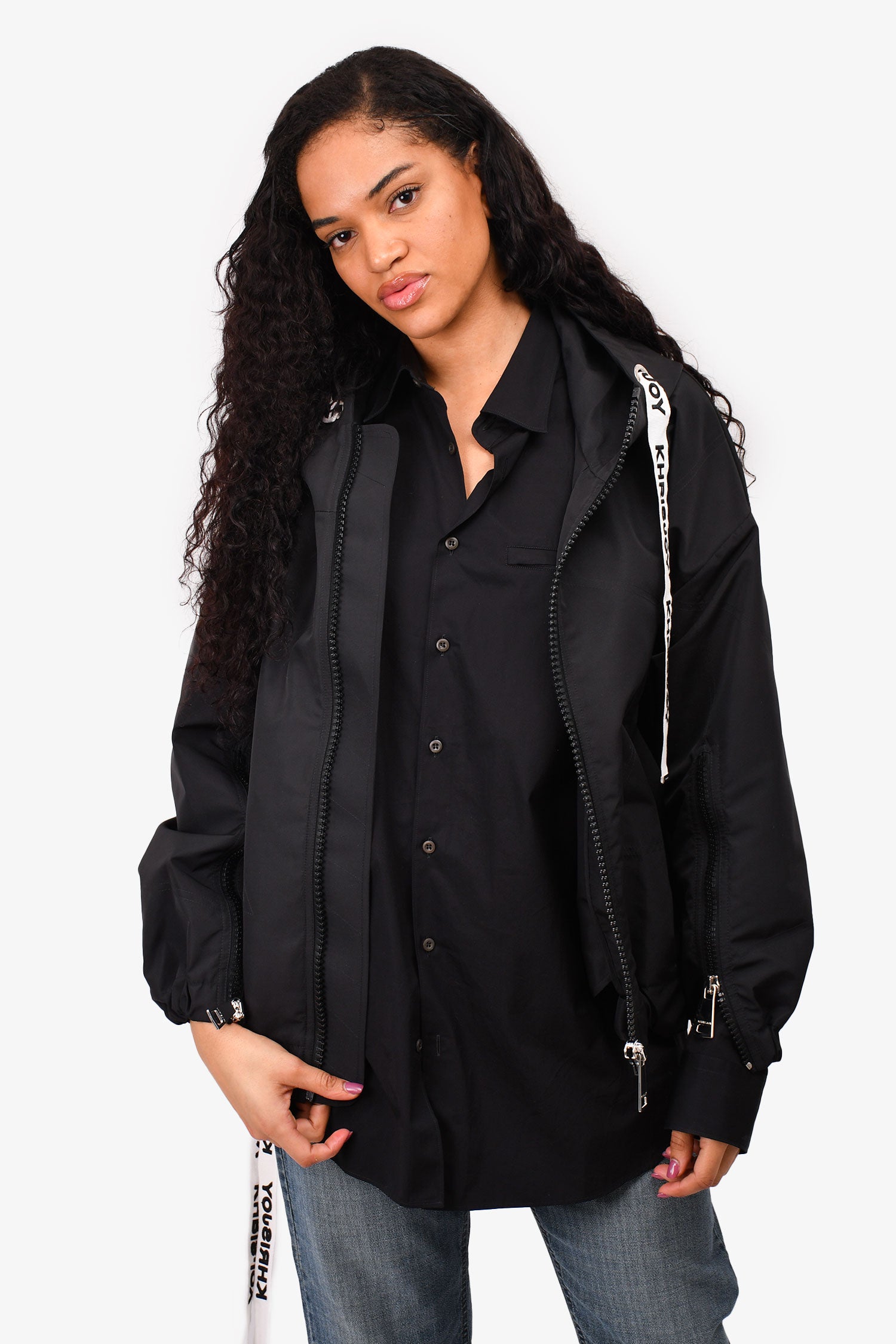 Refresh availabilityKhrisjoy Black Oversized Windbreaker Jacket with Logo Drawstring. Front zip closure. Front pockets. Zipper details on the sleeves.
