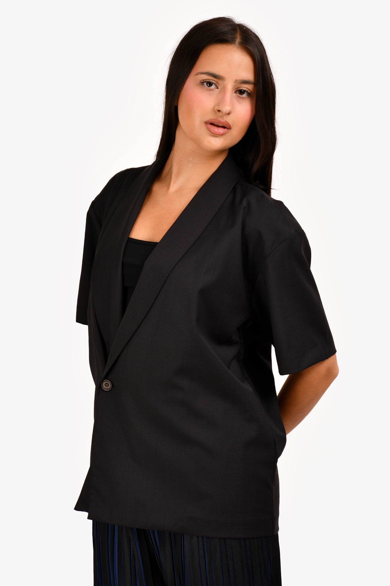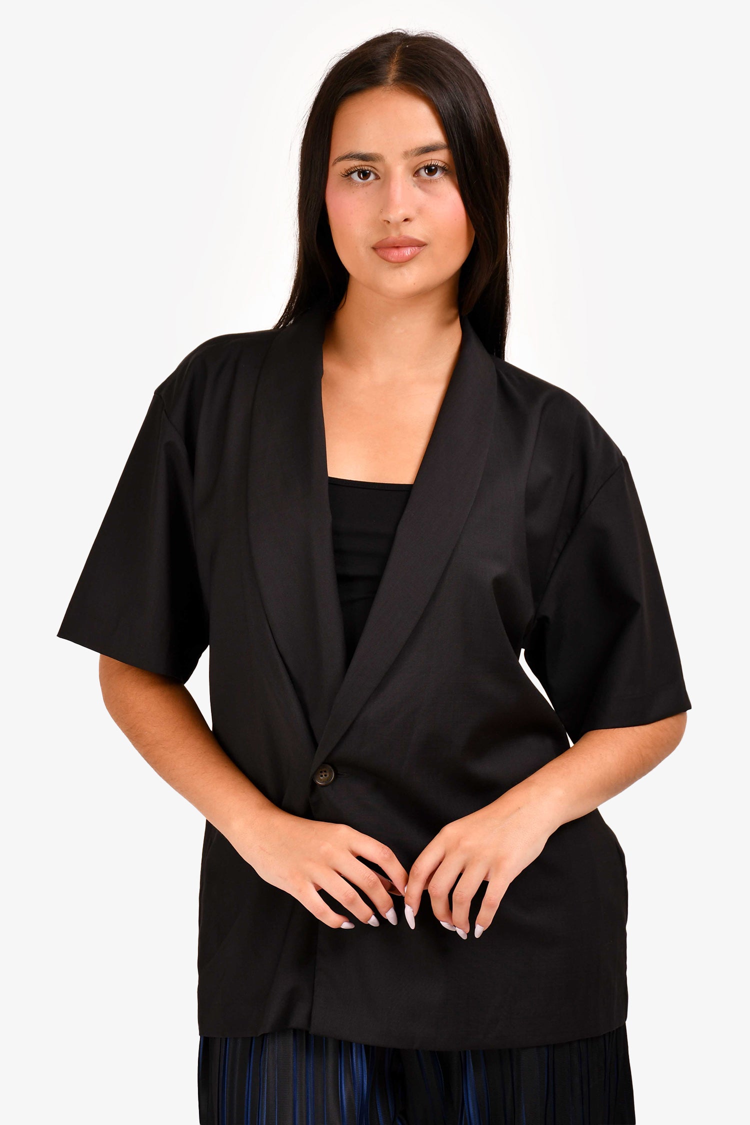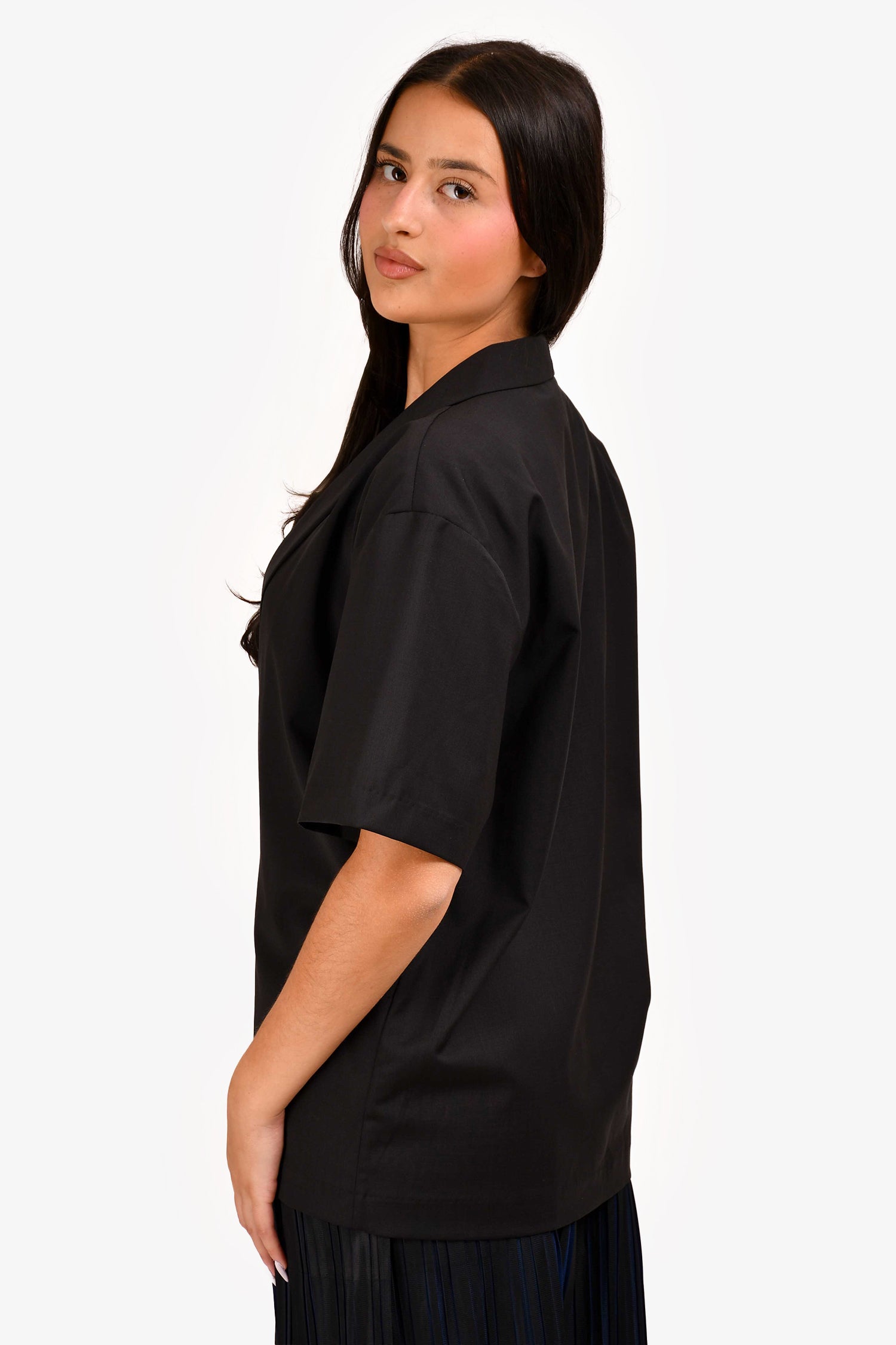 Refresh availabilityKith Black Wool Blend Airy Short Sleeve Button Down Shirt. Camp collar. Short sleeves. Front single button closure. Tonal stitching.