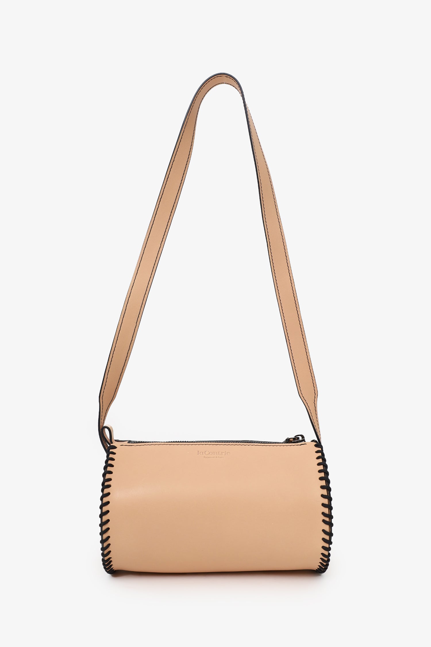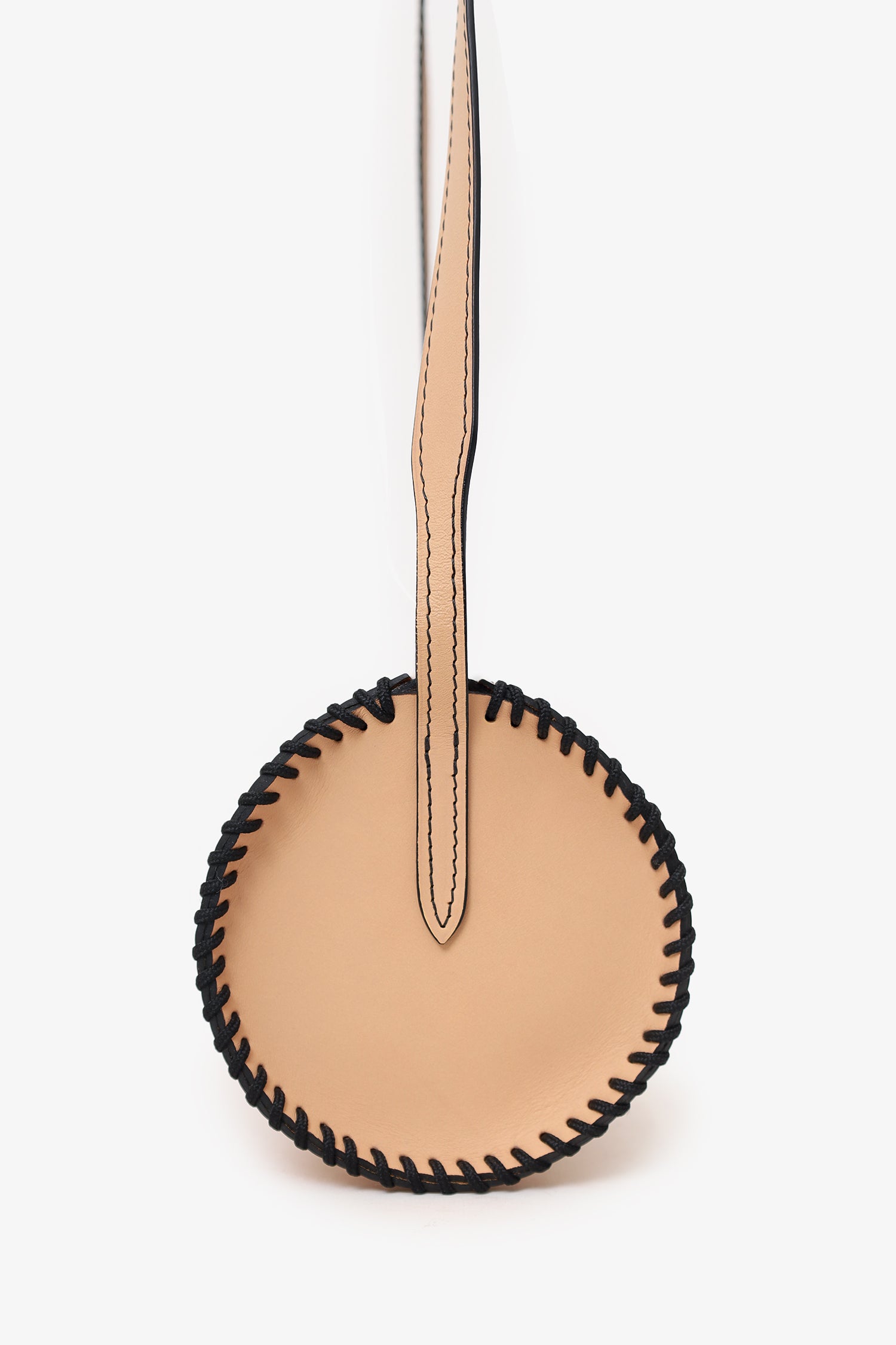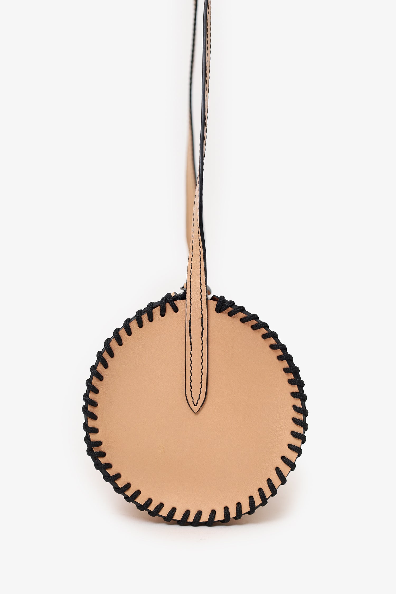 Refresh availabilityLa Contrie Beige Round Bag. Top zip closure. Crossbody strap. Open unlined interior. Tonal stitching.