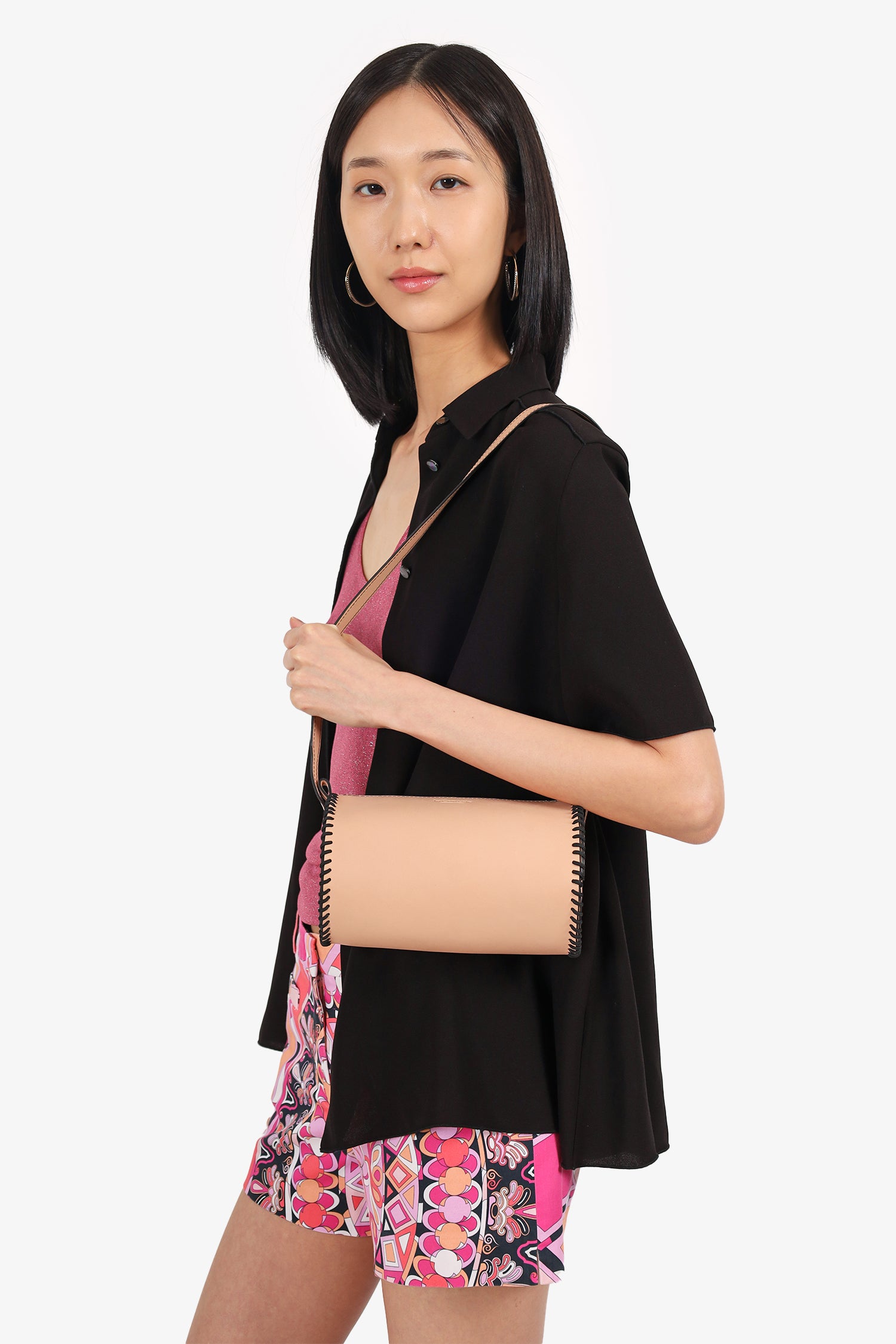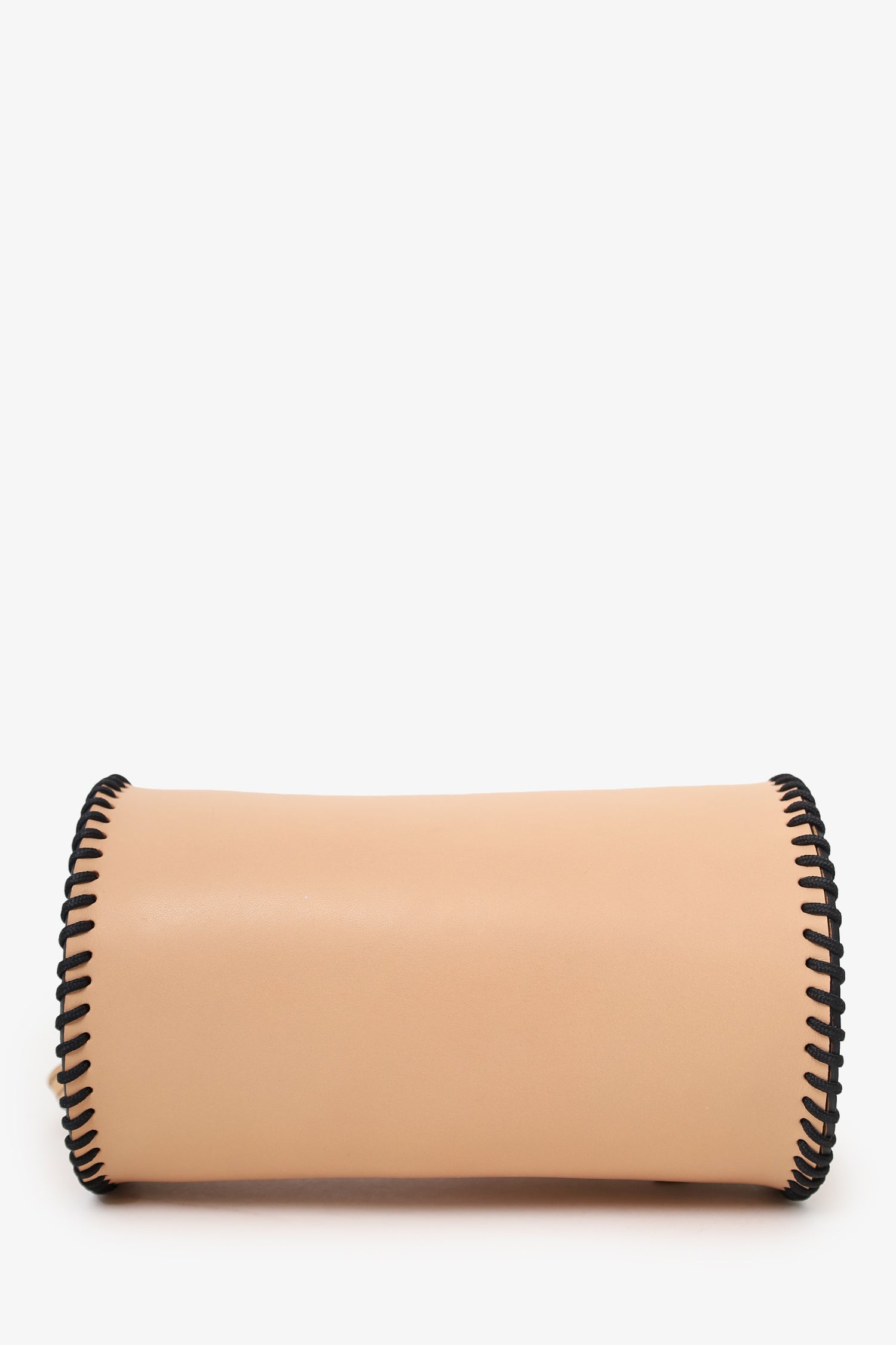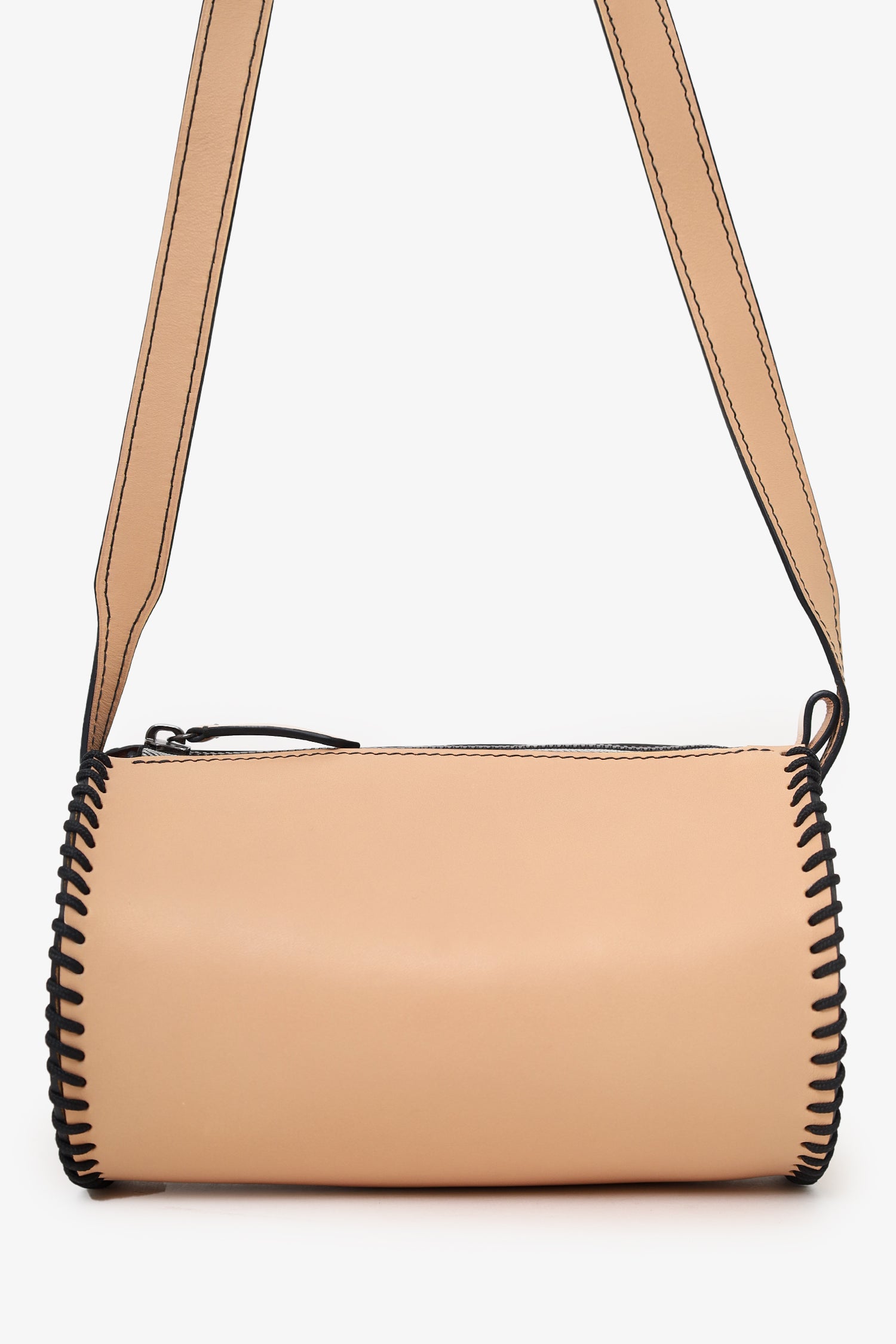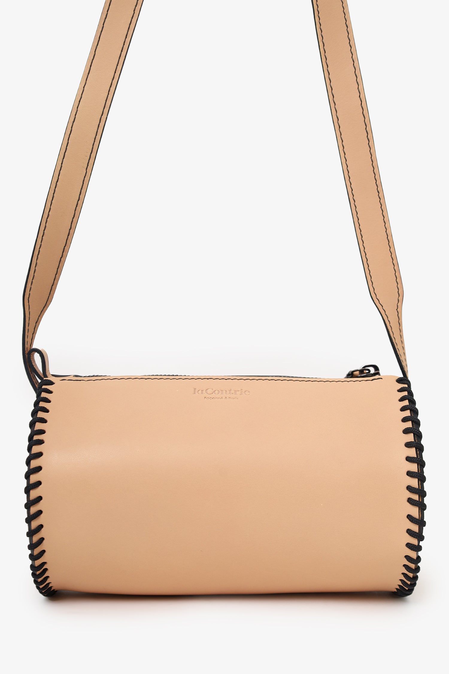 Refresh availabilityLa Contrie Beige Round Bag. Top zip closure. Crossbody strap. Open unlined interior. Tonal stitching.