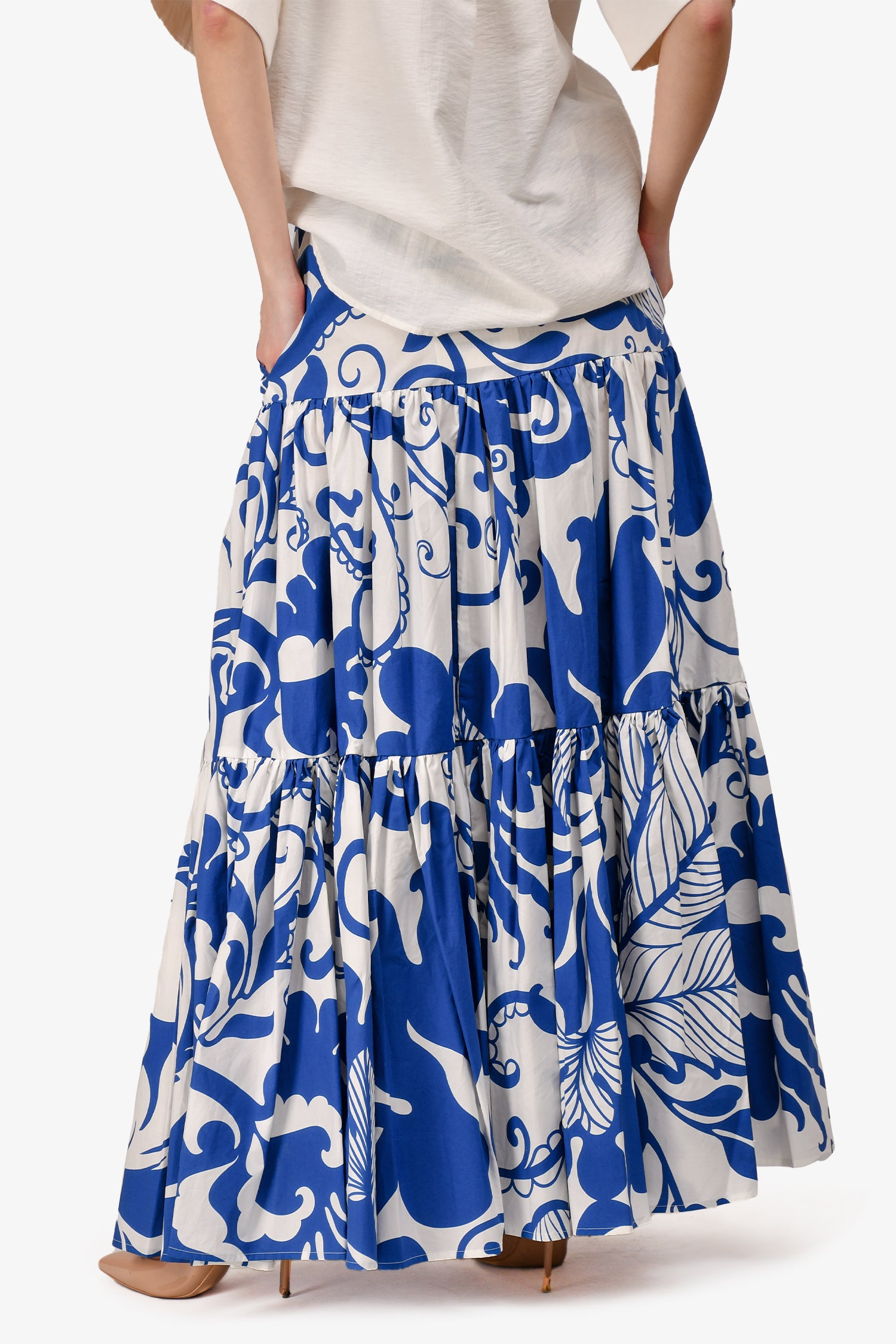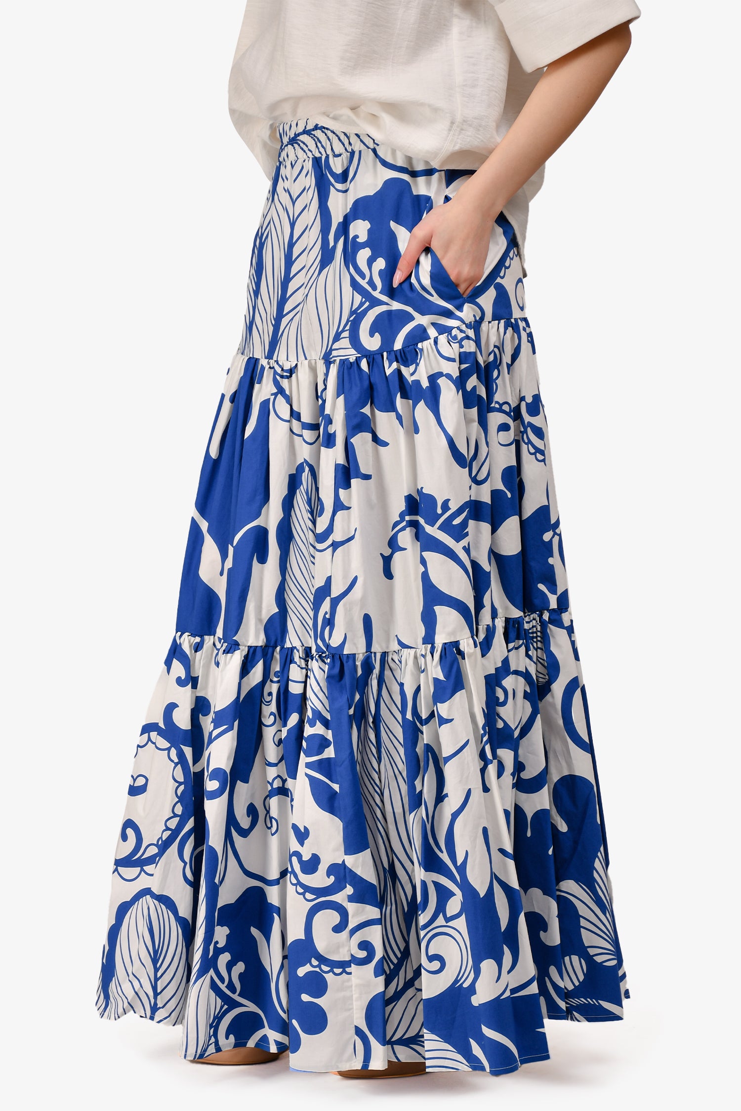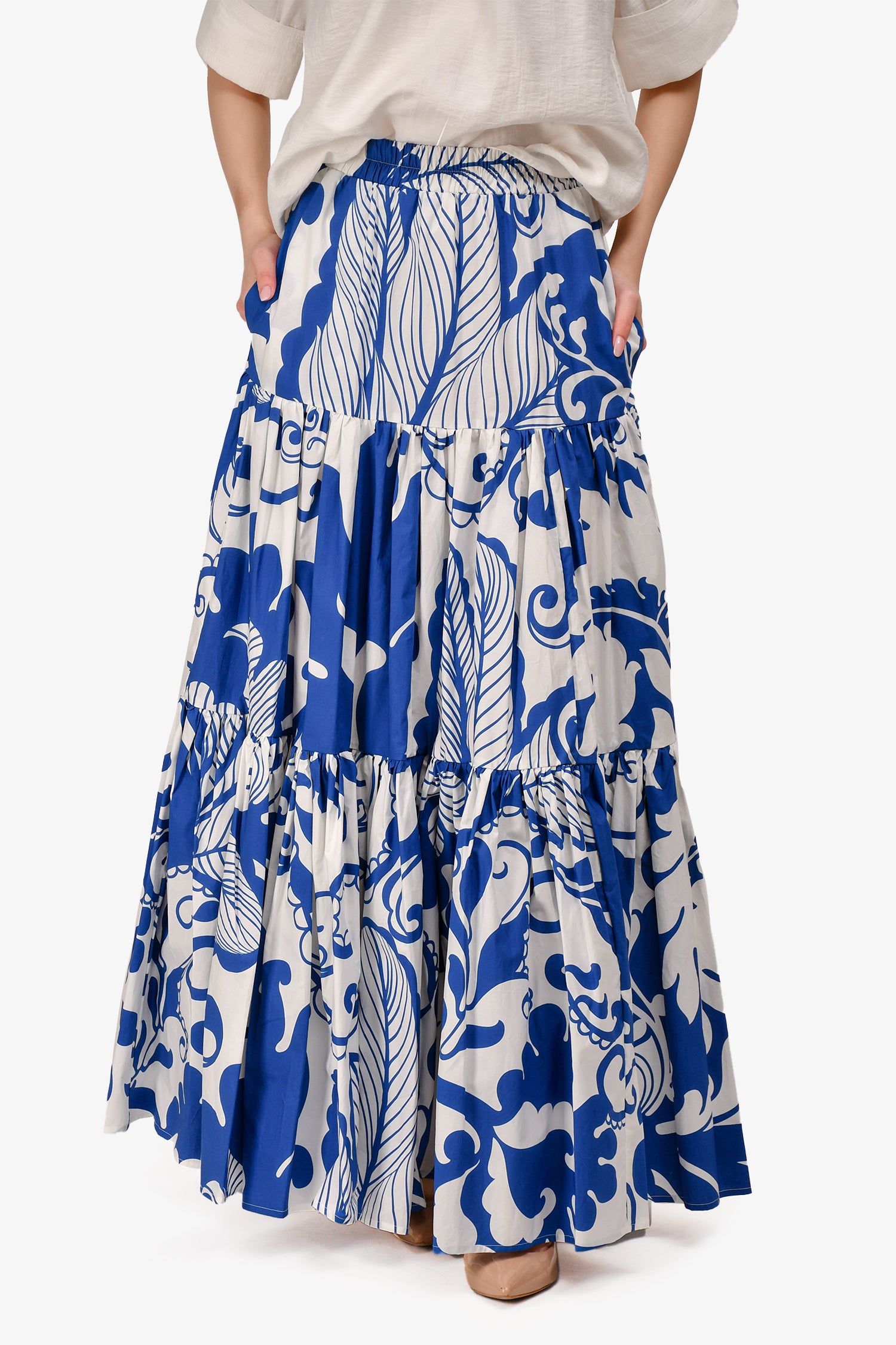 Refresh availabilityLa Double J's Blue/White Patterned Popeline Tiered Maxi Skirt. Front pockets. Ruched at the waist. Tonal stitching.