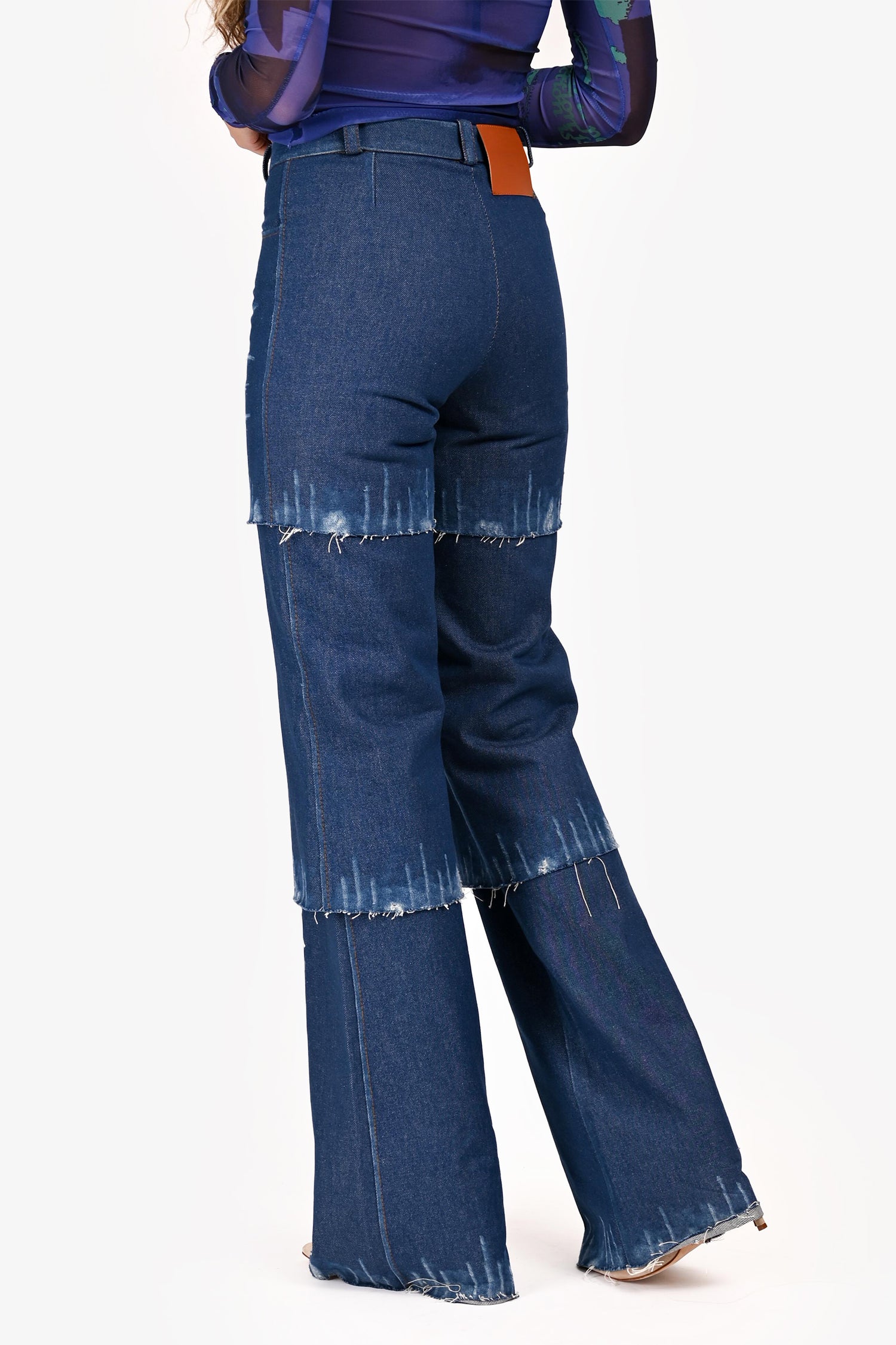 Refresh availabilityLado Bokuchava Blue Denim Tiered Paneled Jeans. Slip-on. Front zip with button closure. Waistband belt loops. 2 exterior front slip pockets. Silver-tone hardware. Contrast stitching.