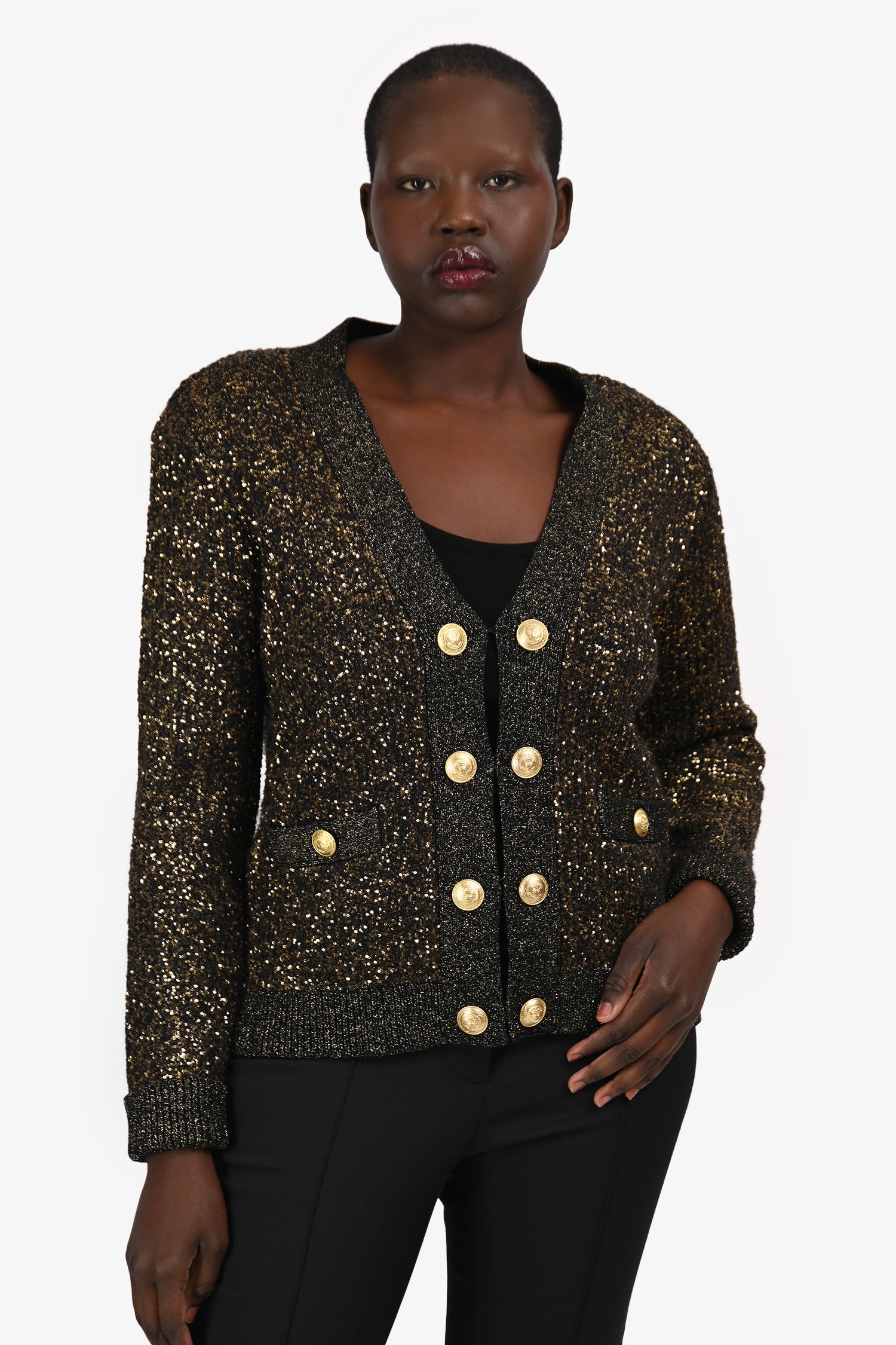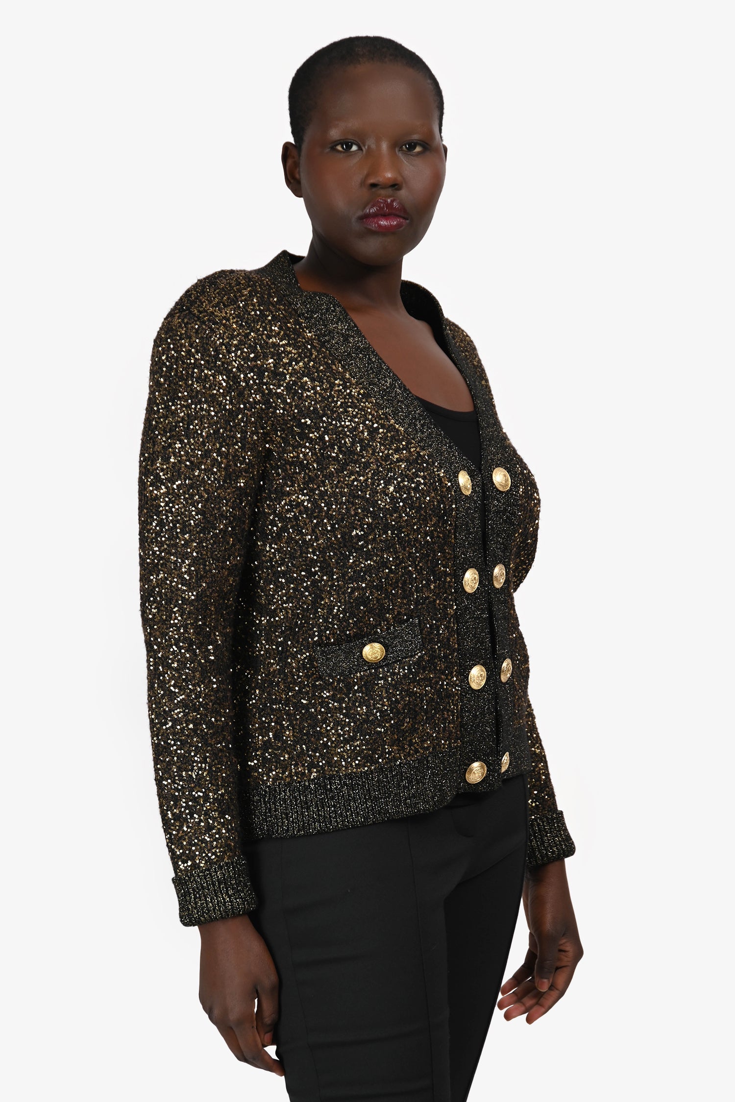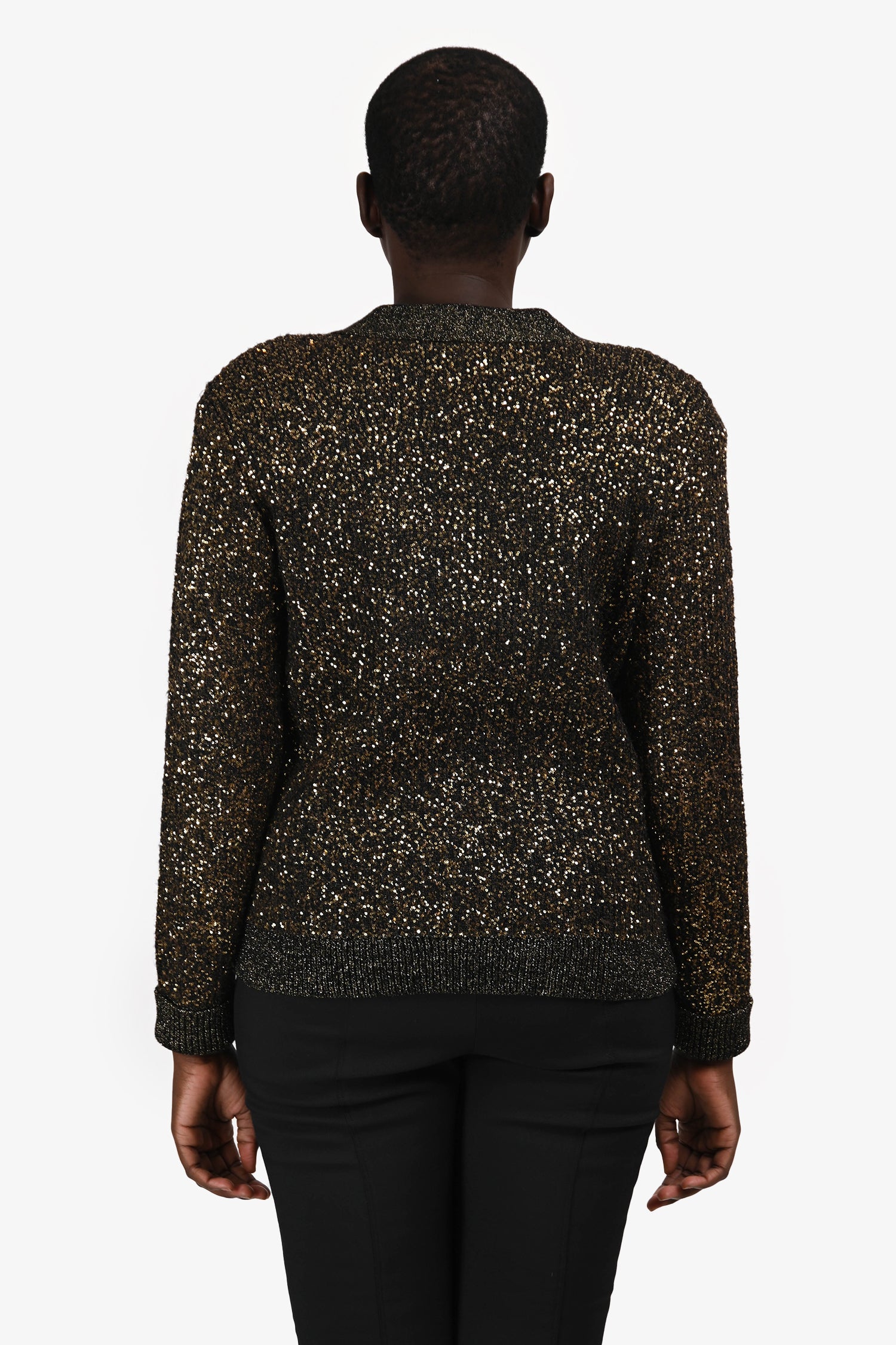 Refresh availabilityL’Agence Black/Gold Sequin Knit Cardigan. Slip-on. V-neckline. Front hook closure with button detail. Unlined. Gold-tone hardware. Tonal stitching.