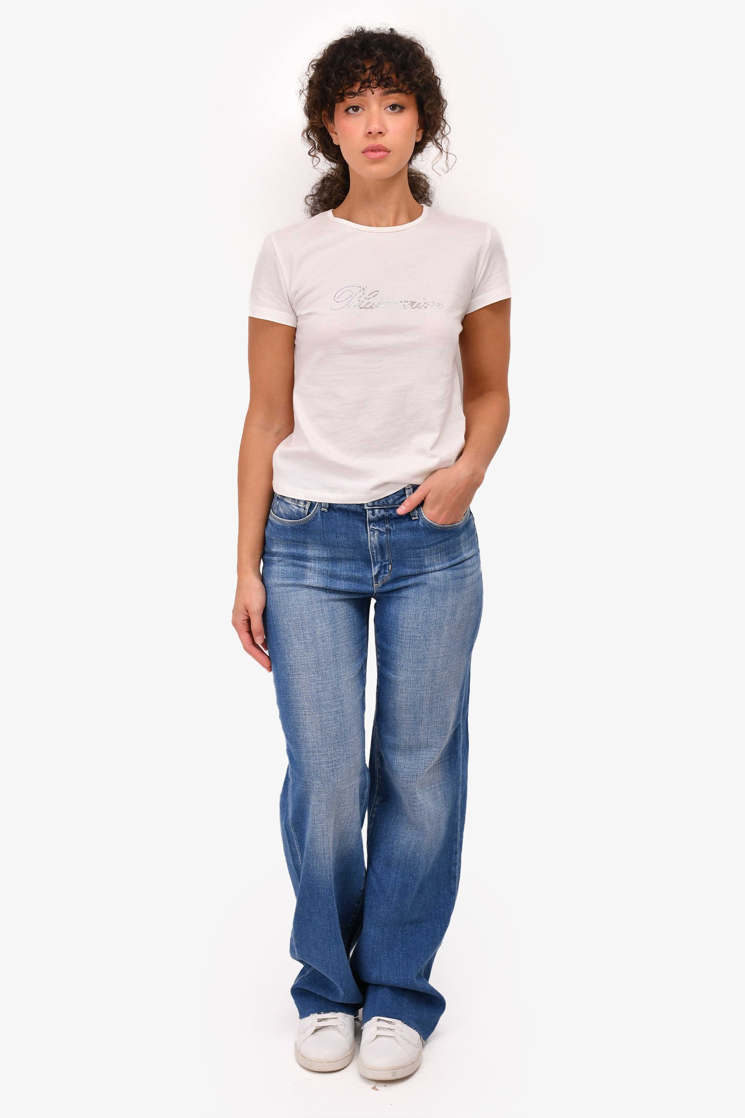 Refresh availabilityL'Agence Blue Denim High Rise Wide Leg Scottie Jeans. Silver-tone hardware. Five-pocket design. Contrast stitching.