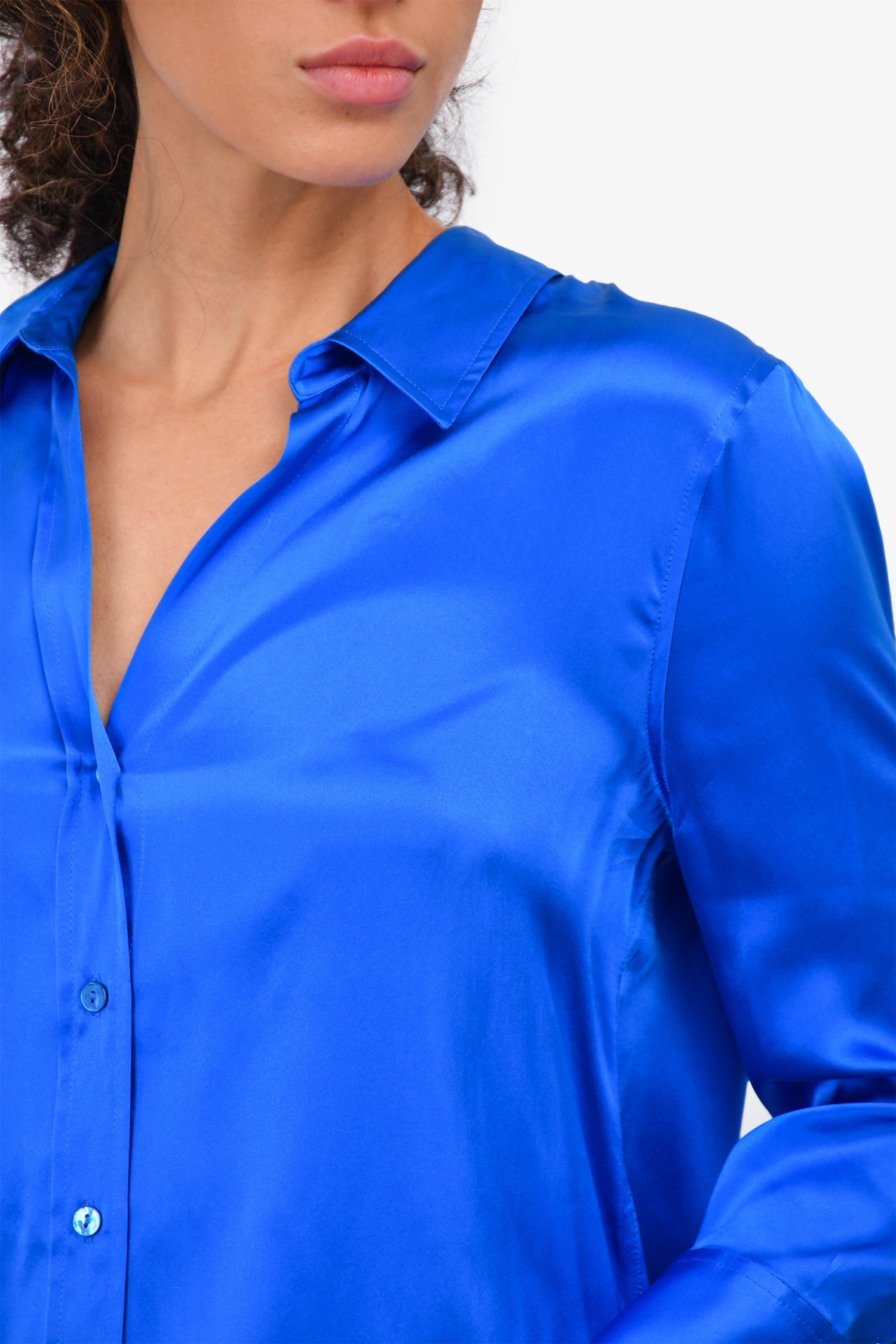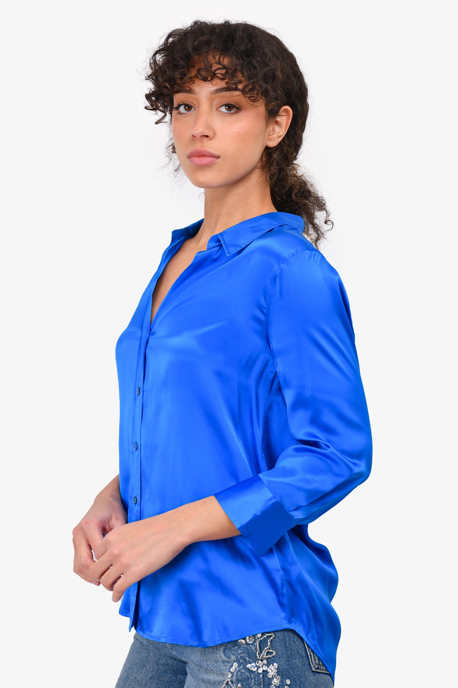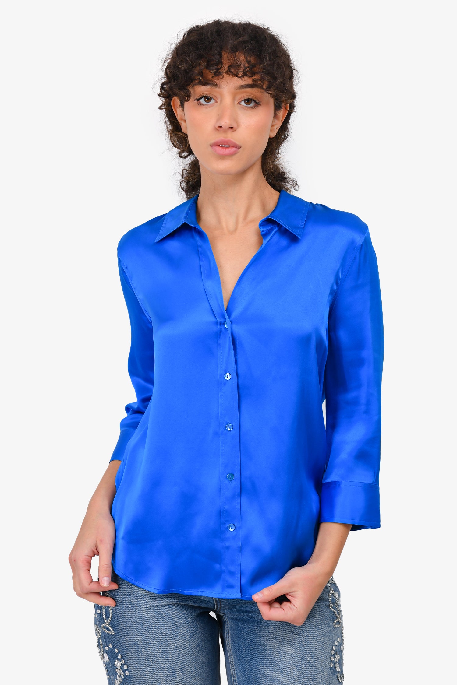 Refresh availabilityL'Agence Blue Silk Button-Up Blouse. Front button closure. Tonal stitching.