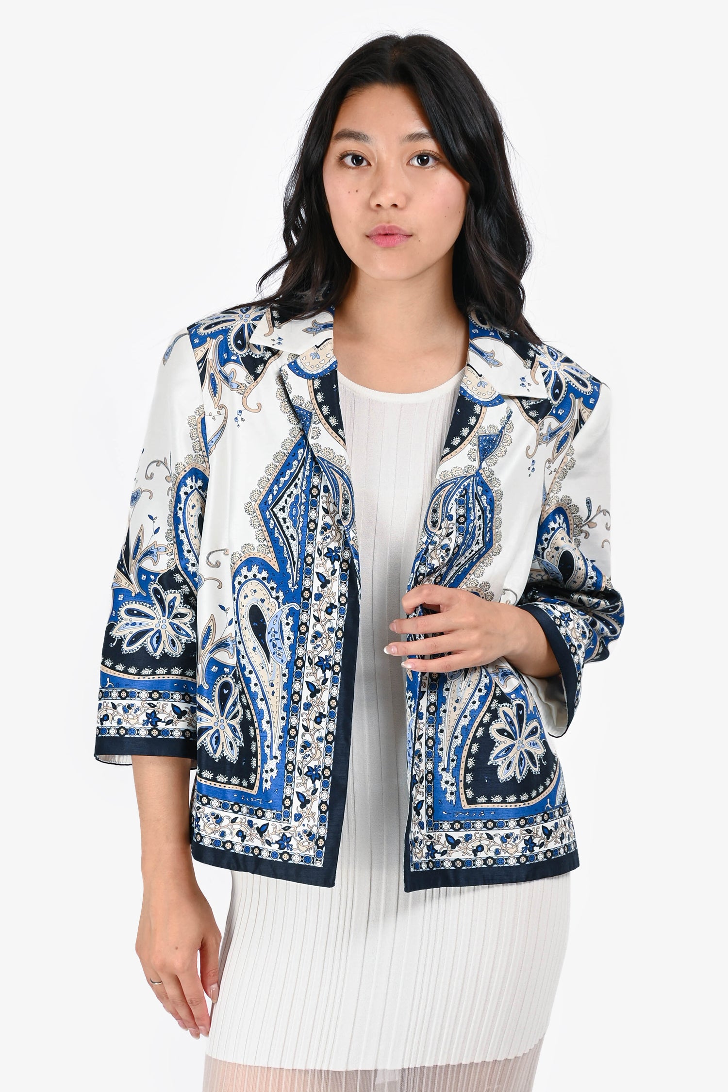 Refresh availabilityL'Agence Blue/White Paisley Jacket. Open front. Long sleeves. Fully lined. Tonal stitching.