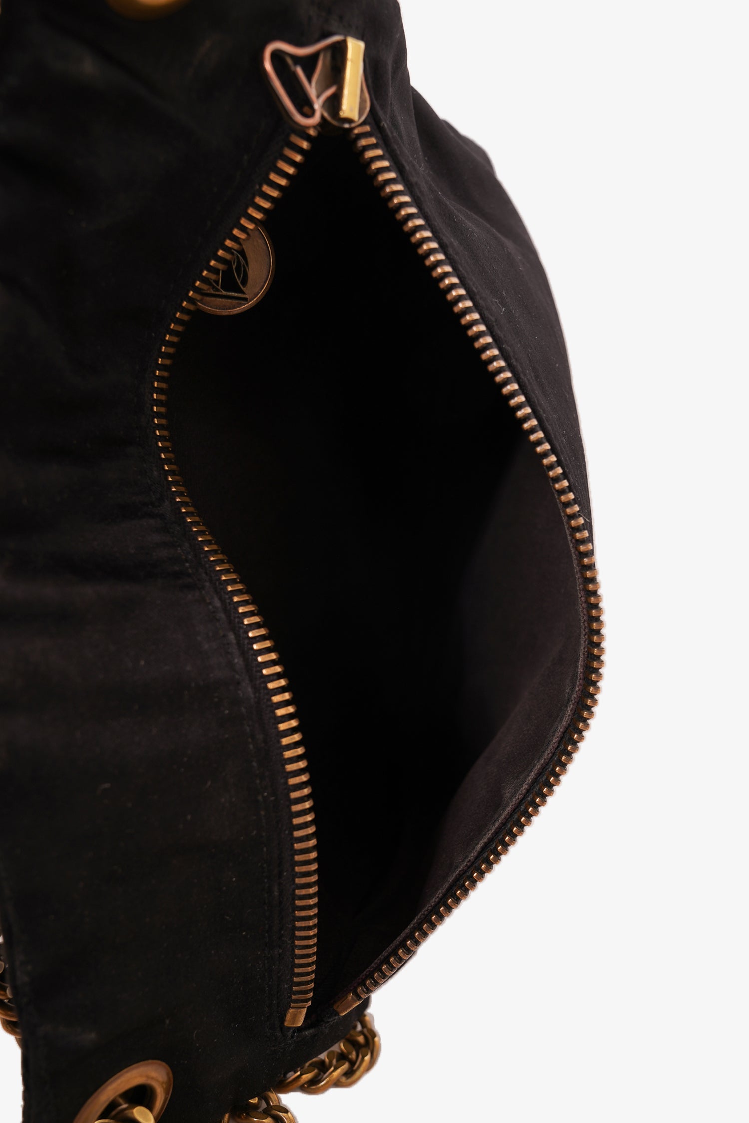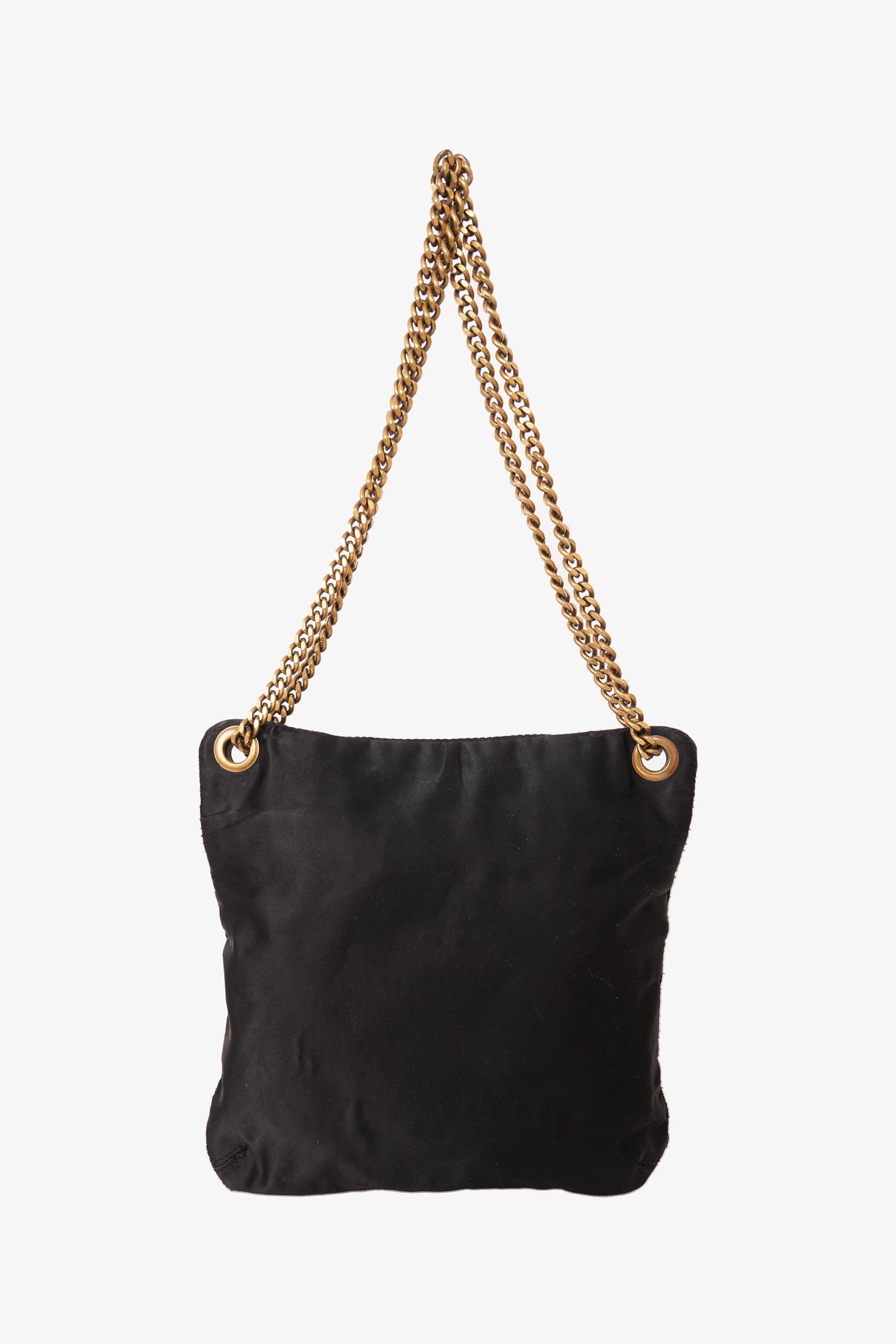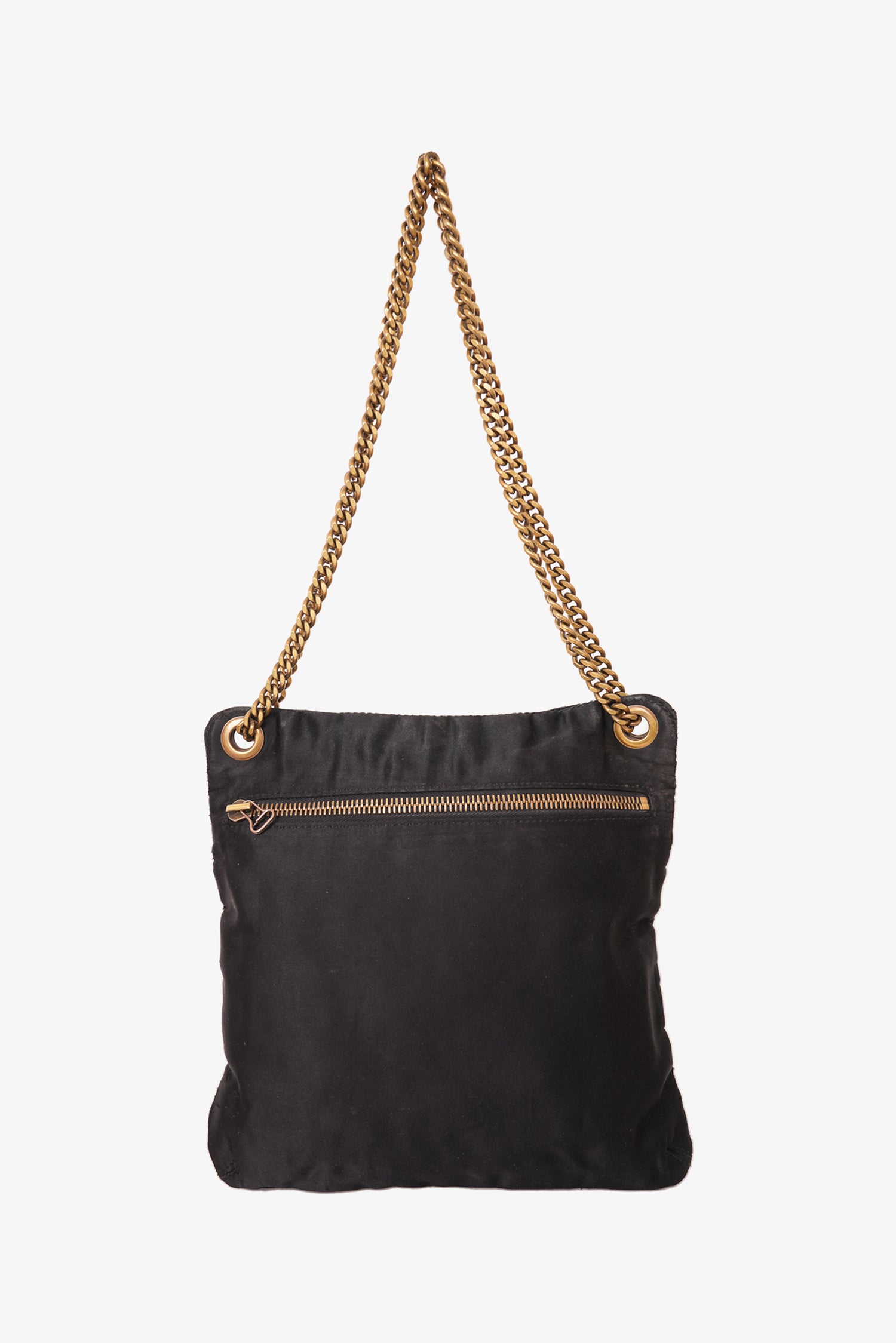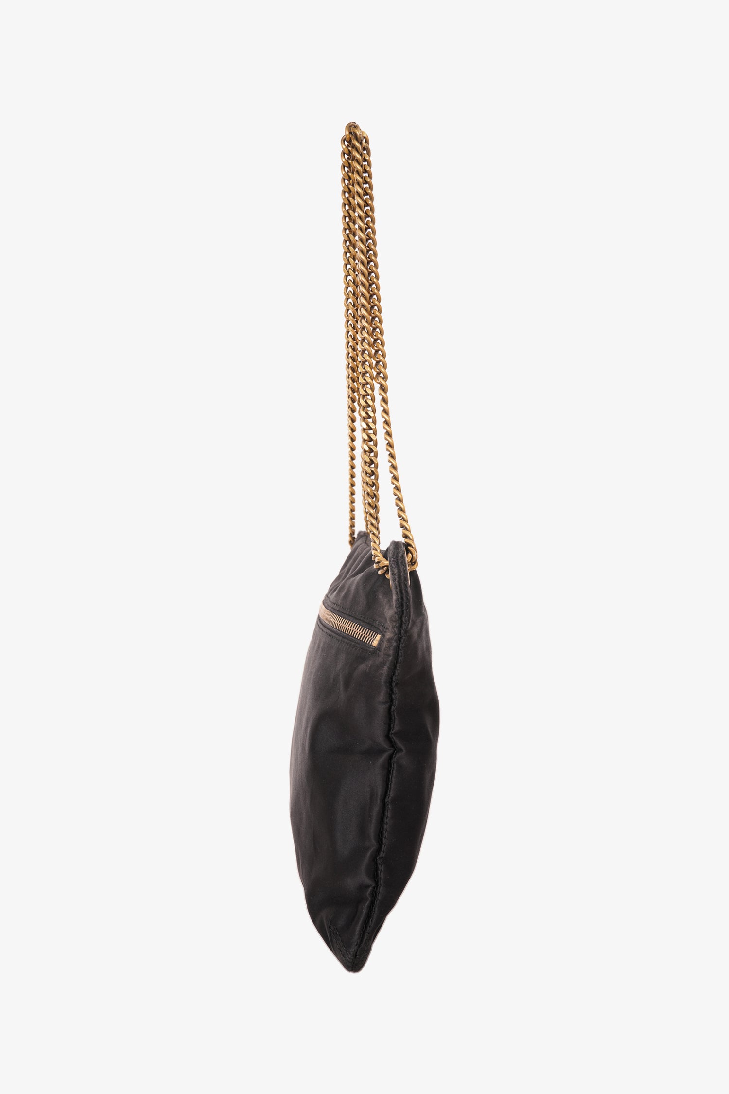 Refresh availabilityLanvin Black Satin Shoulder Bag Gold Chain Handle. Slide-around chain strap. Top zip closure. 1 interior zip pocket. Gold-toned hardware. Tonal stitching.