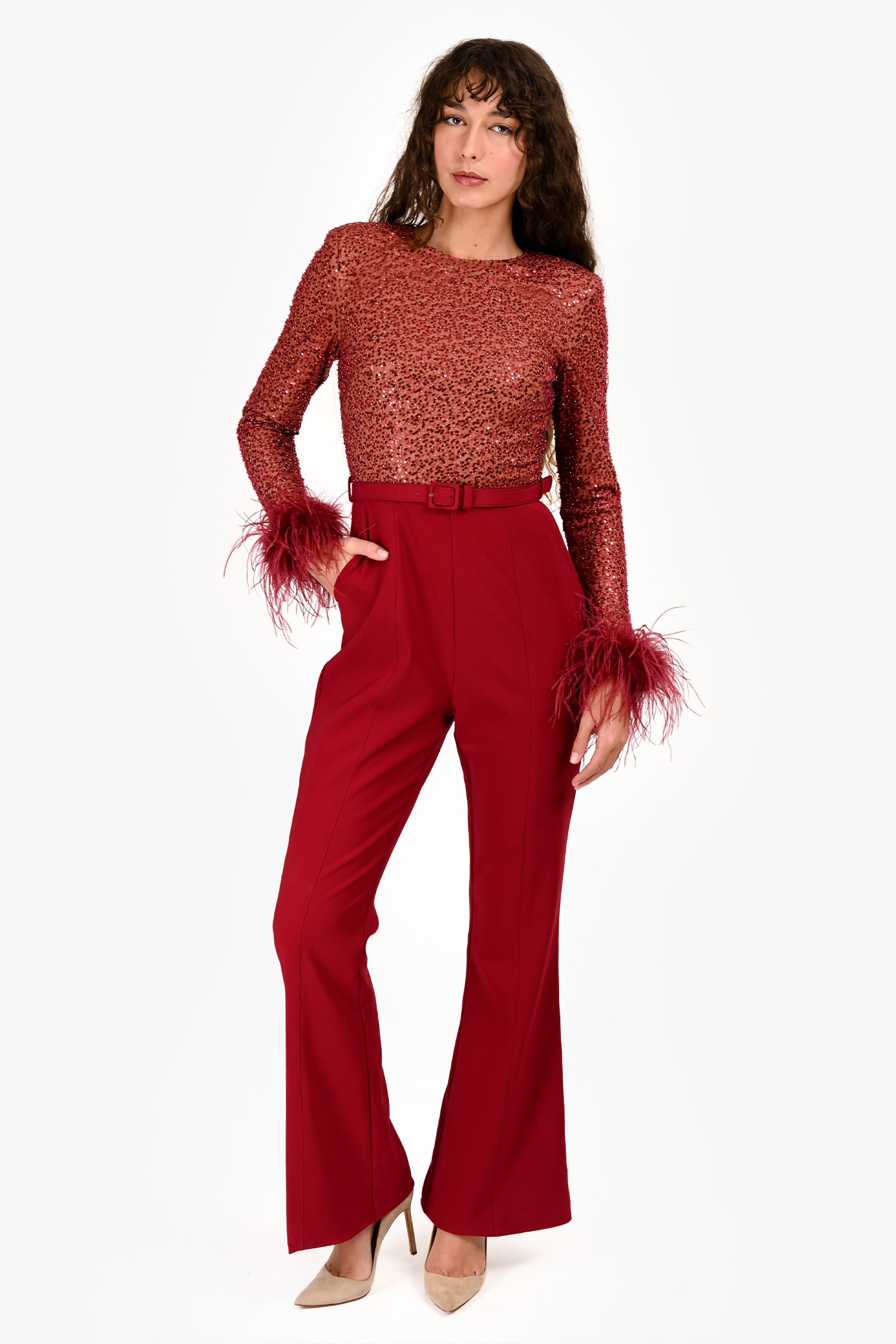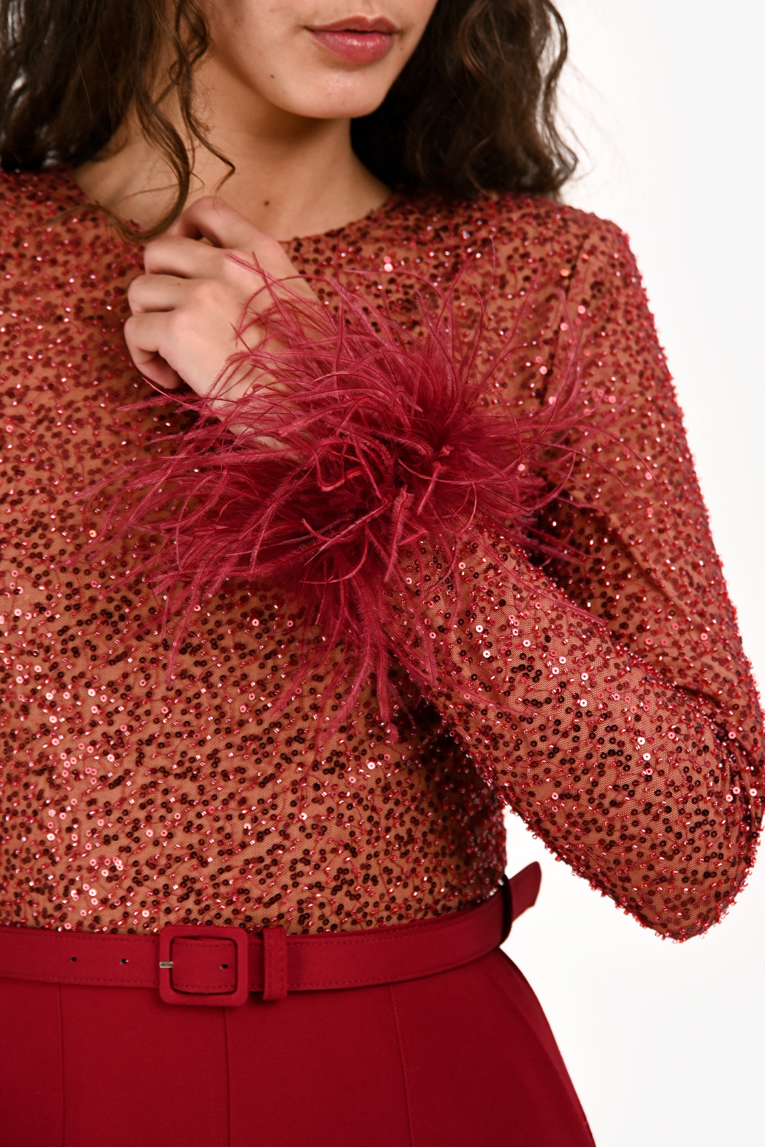 Refresh availabilityLavish Alice Red 'Isabel' Sequin/Feather Belted Romper. Pull-on. Round neckline. Hidden zipper and hook-and-eye closure in the back. Detachable belt. 2 exterior slip pockets on the side. Lined. Tonal hardware. Tonal stitching.