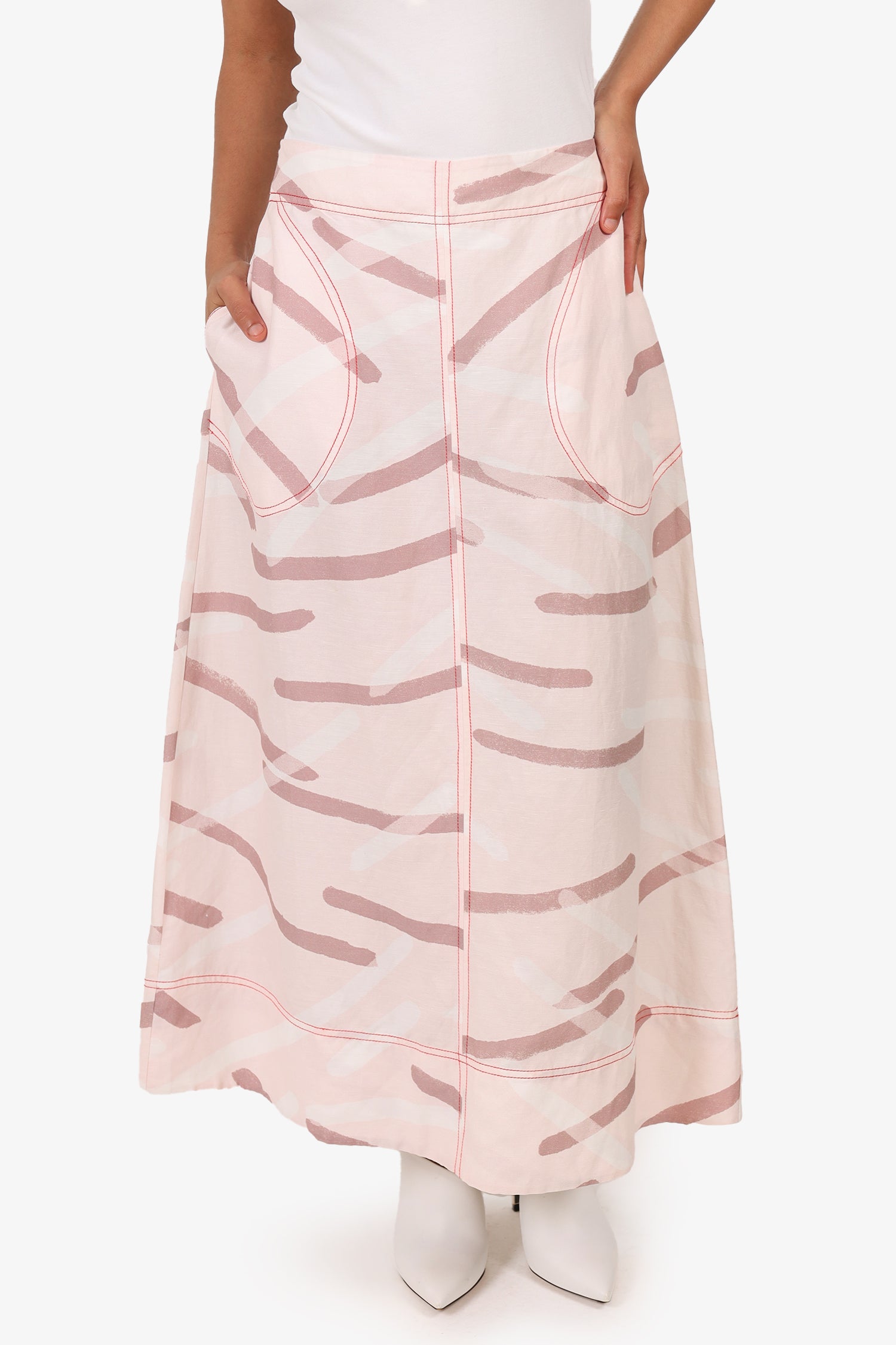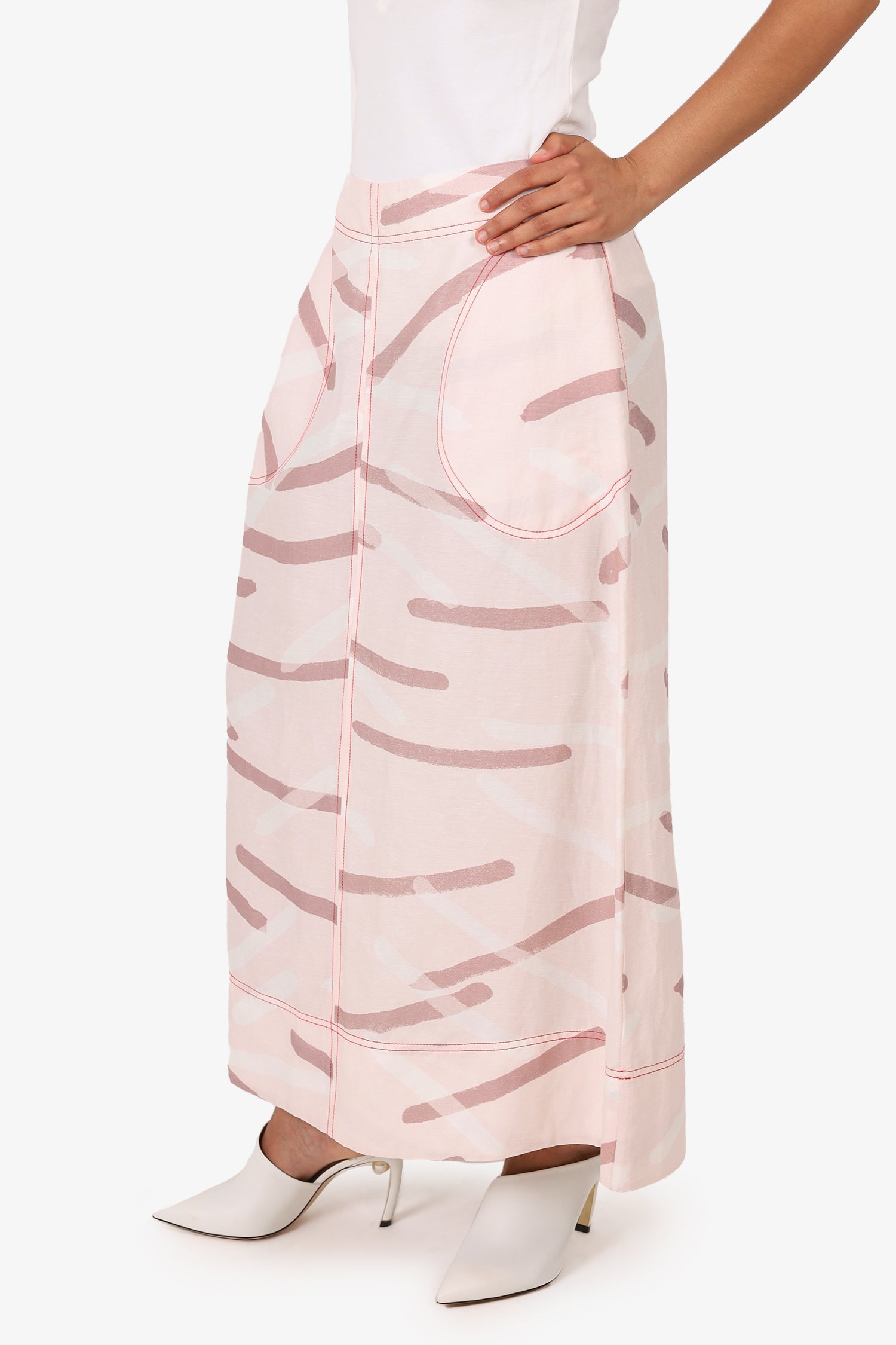 Refresh availabilityLee Mathews Blush Printed Linen Midi Skirt. Slip-on. Rear zip and hook closure. 2 exterior side slip pockets. Tonal stitching.