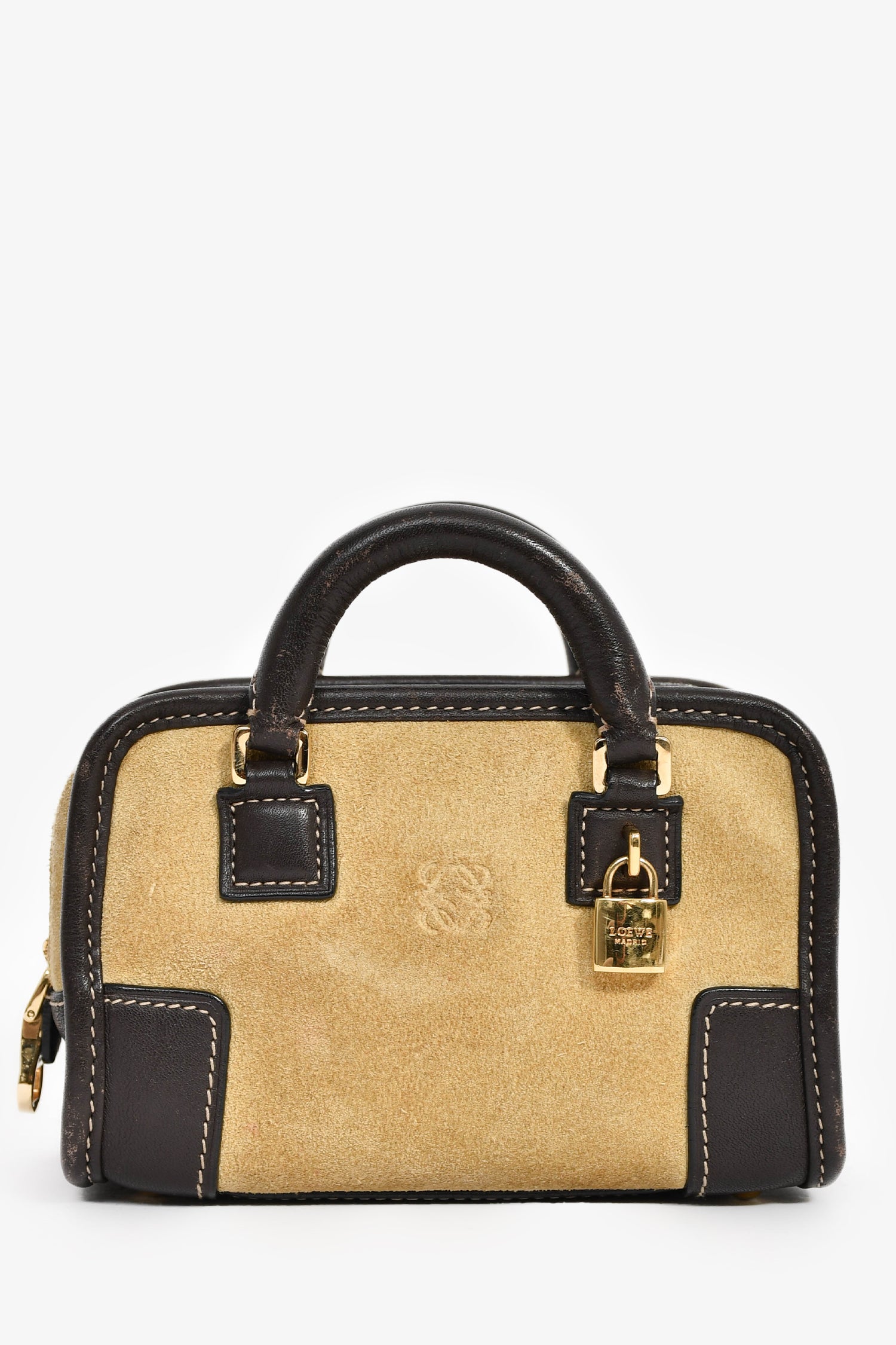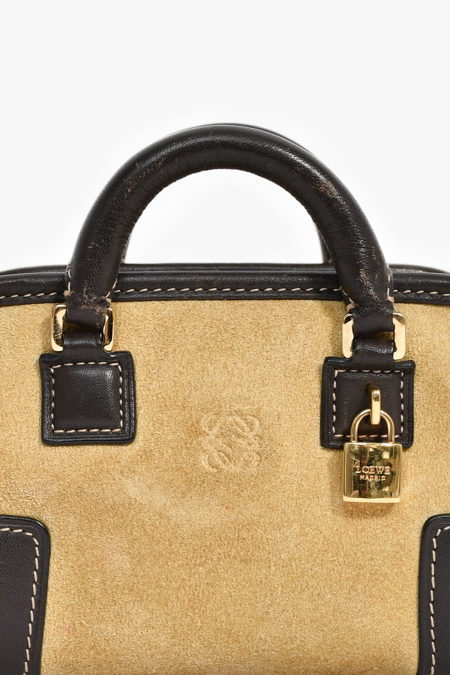 Refresh availabilityLoewe 2010 Beige/Brown Suede 'Mini Amazona' Crossbody Bag. Top zip closure. Twin top handles. Detachable strap. Single interior compartment with 2 wall slip pocket. Protective base studs. Leather-lined interior. Gold-tone hardware. Contrast stitching.