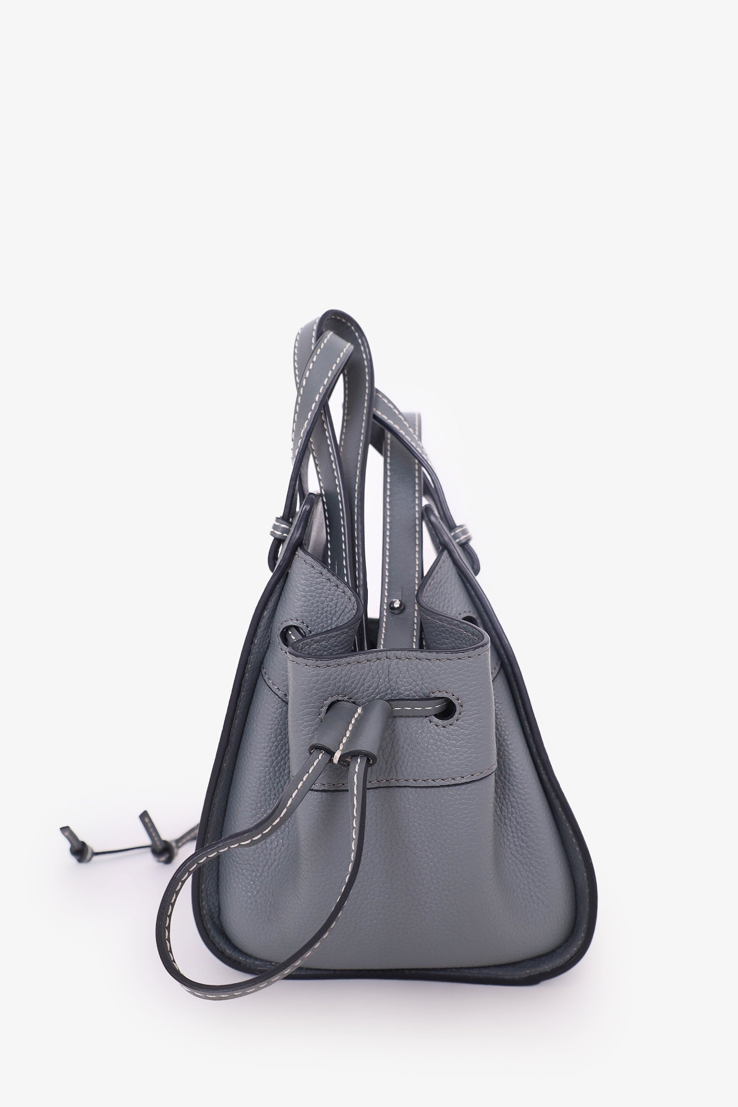 Loewe 2018 Grey Leather Mini Hammock Crossbody. Top handles with adjustable/removable cross body strap. Open top and interior. Two wall sip pockets inside. Adjustable cinch on sides. Contrast stitching. Silver-tone hardware.