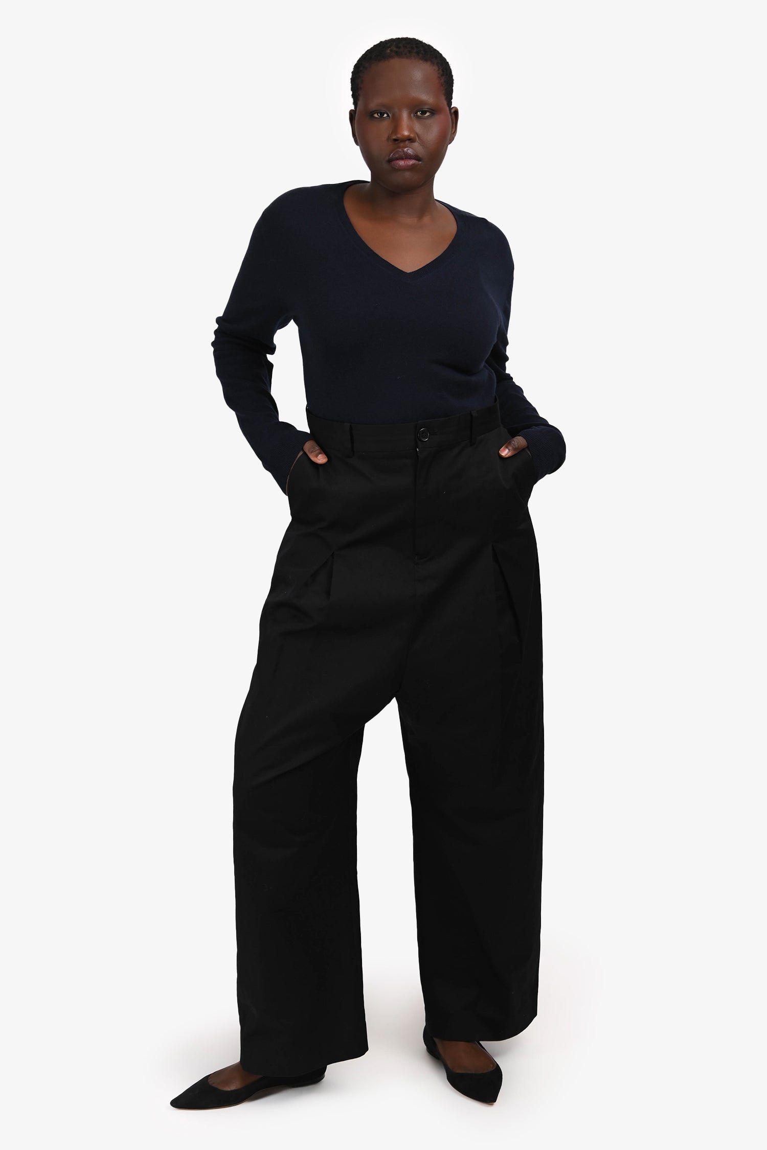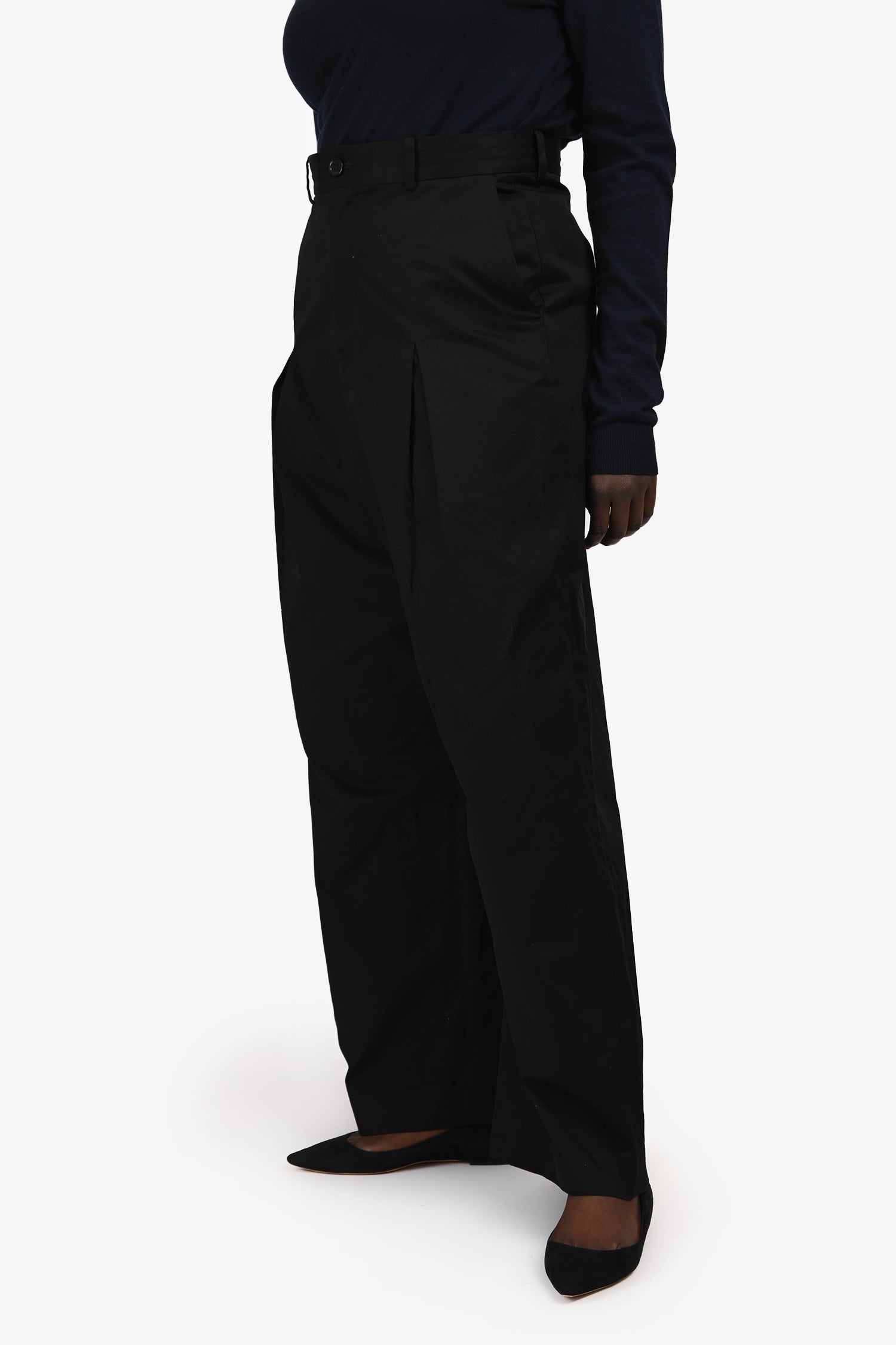 Refresh availabilityLoewe Black Cotton Wide Leg Drop Crotch Trousers. Slip-on. Front zip and button closure. Waistband belt loops. 4 exterior pockets; 2 side slip, 2 rear with fold-over flap and button closure. Tonal stitching.