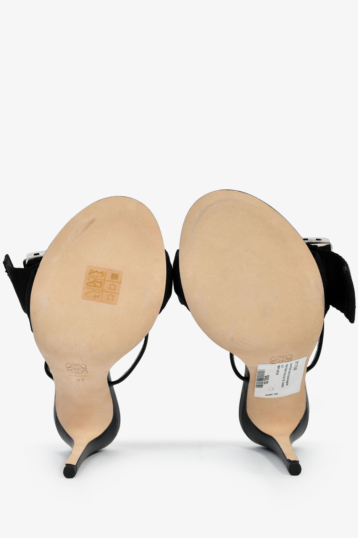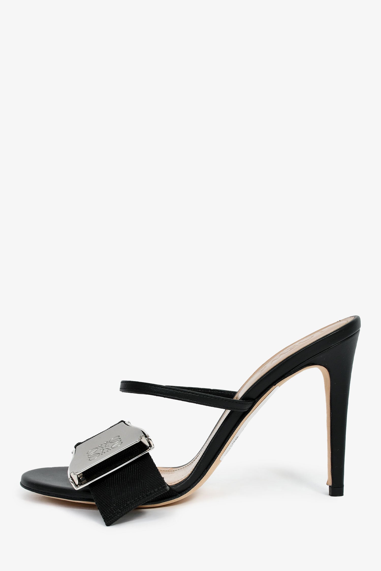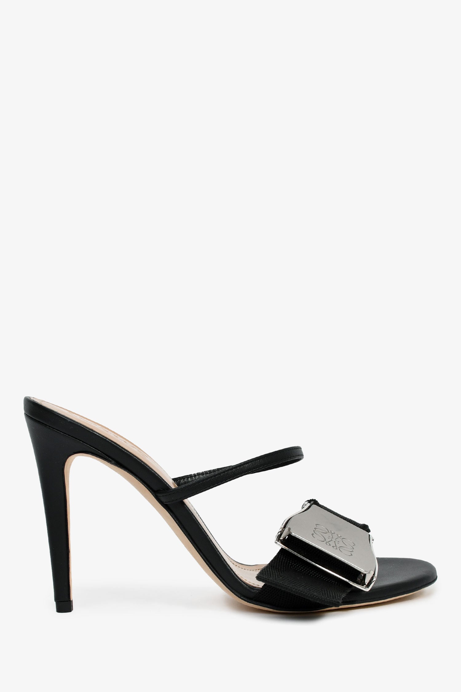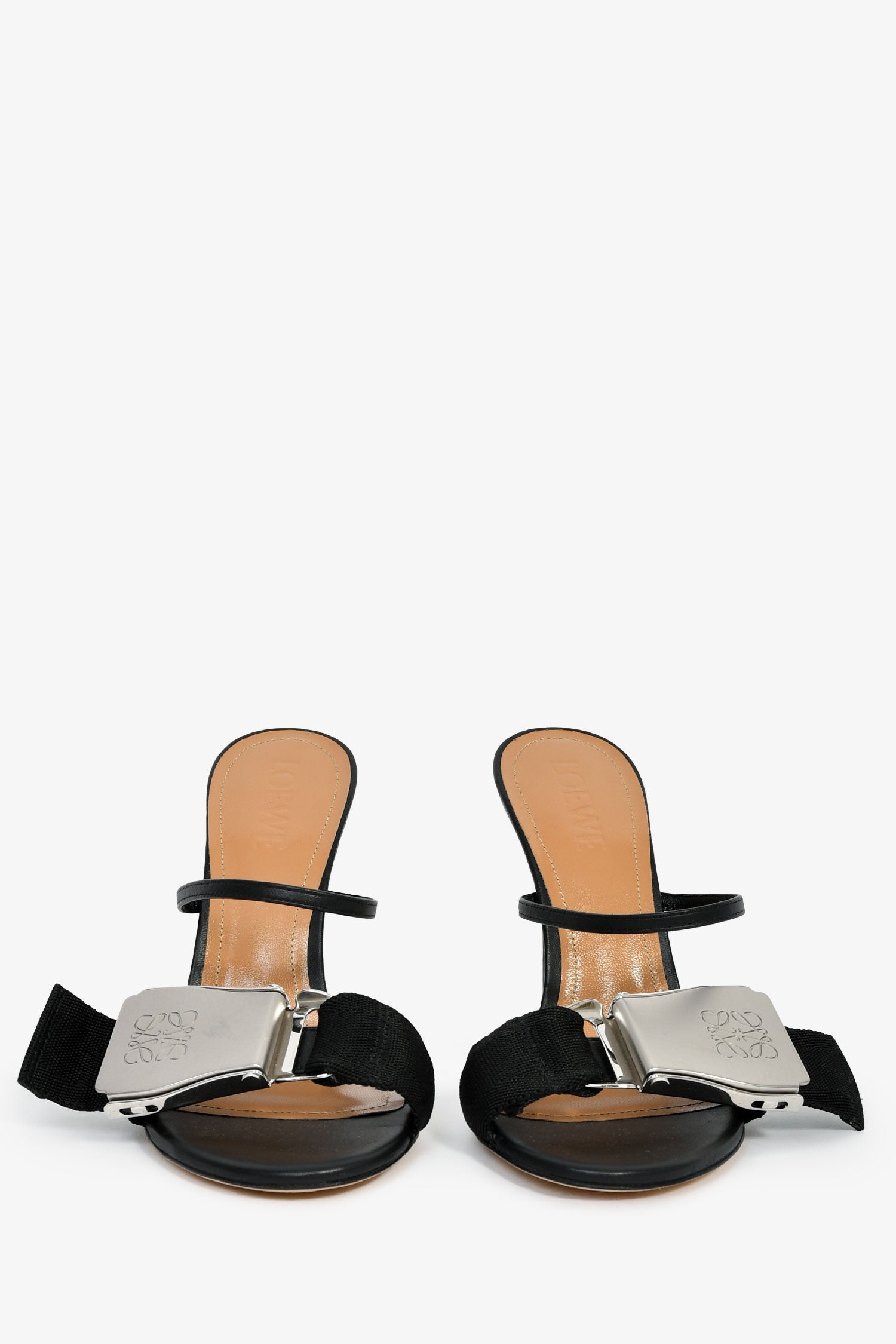 Refresh availabilityLoewe Black Leather Buckle Anagram Detail Heeled 'Safety Belt 100' Sandals. Slip-on. Open toe. Silver-tone hardware. Tonal stitching.