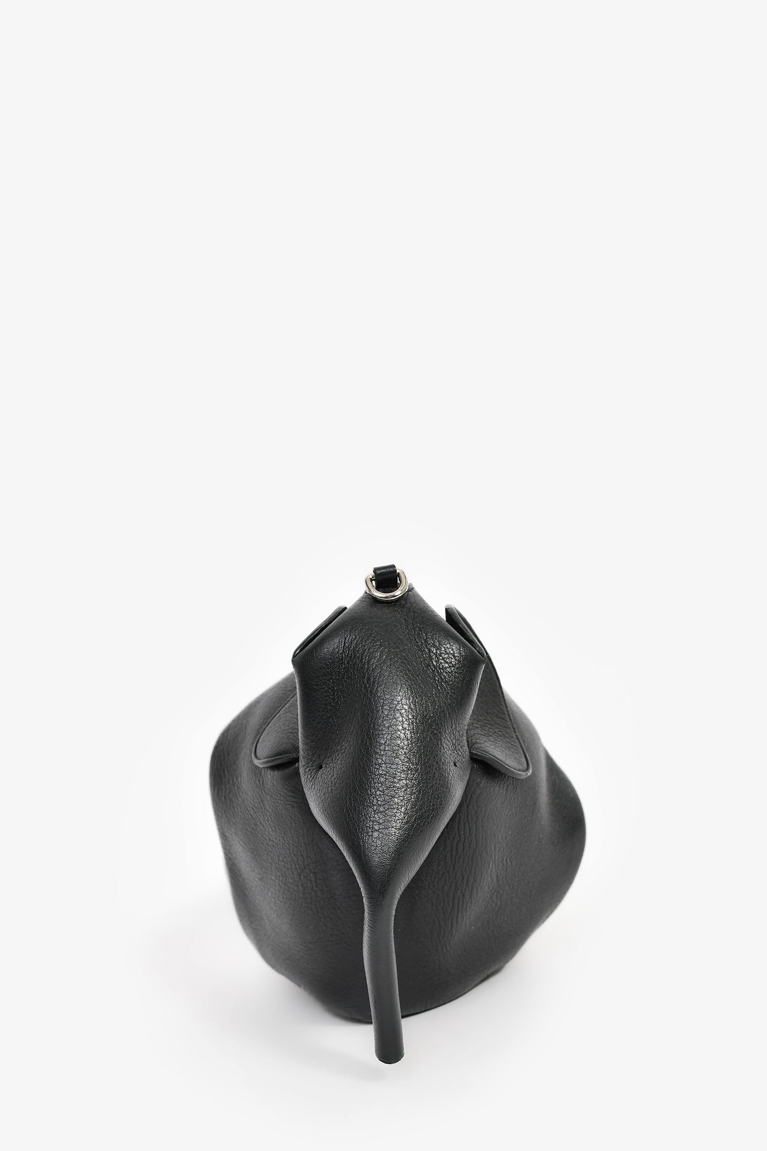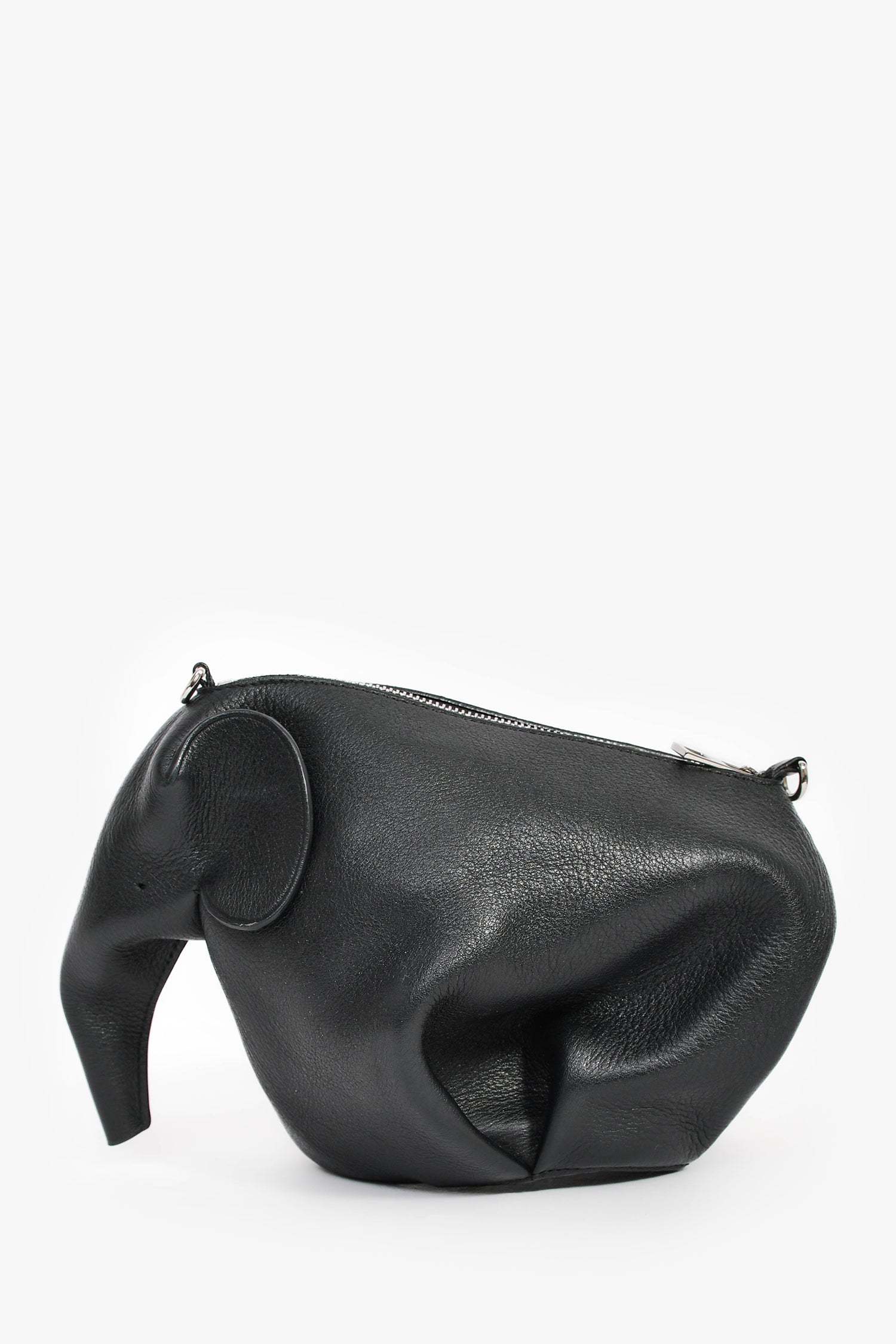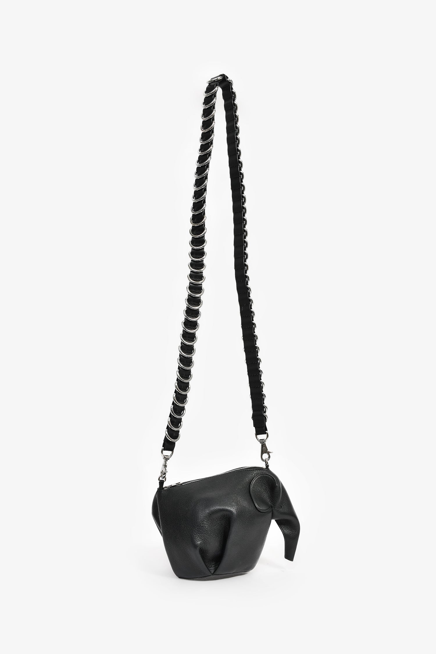 Refresh availabilityLoewe Black Leather Elephant Bag with Strap. Top zip closure. Single interior compartment. Detachable strap and chain. Silver-tone hardware. Tonal stitching.