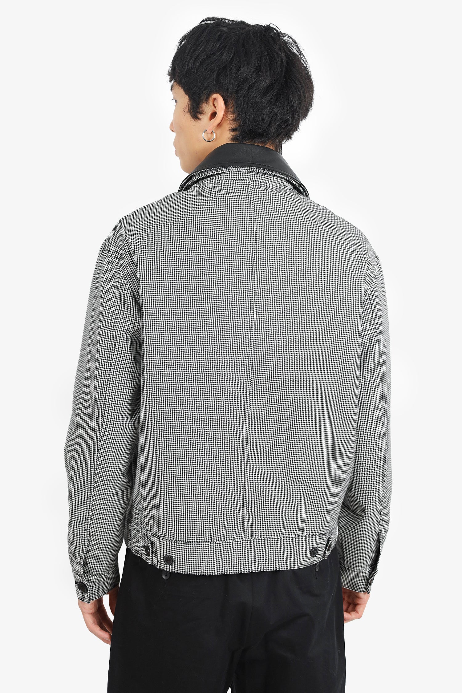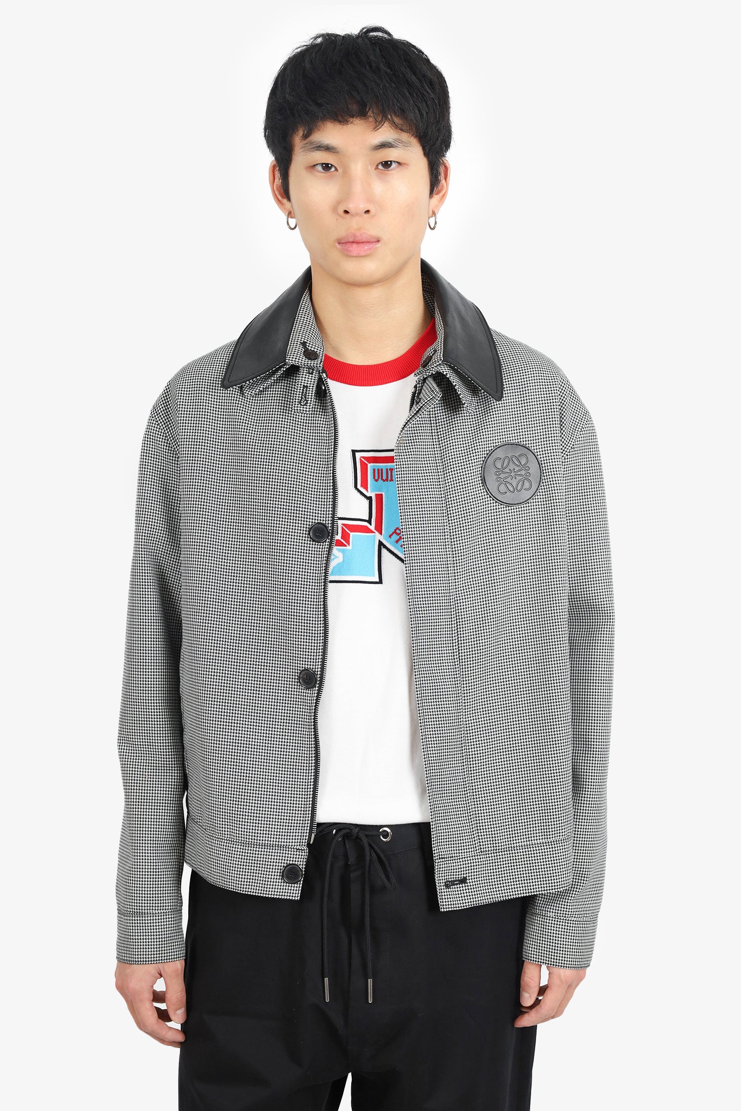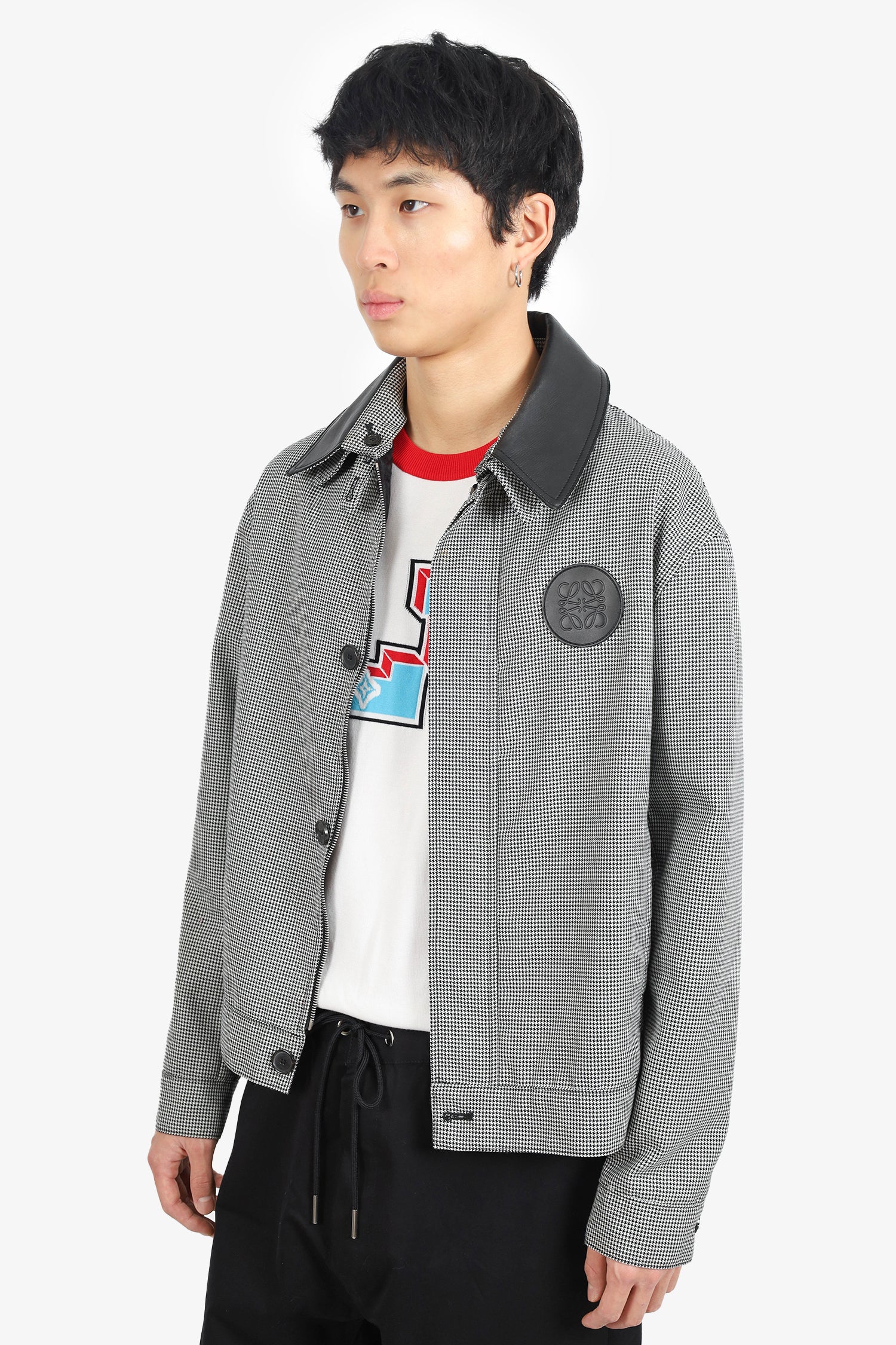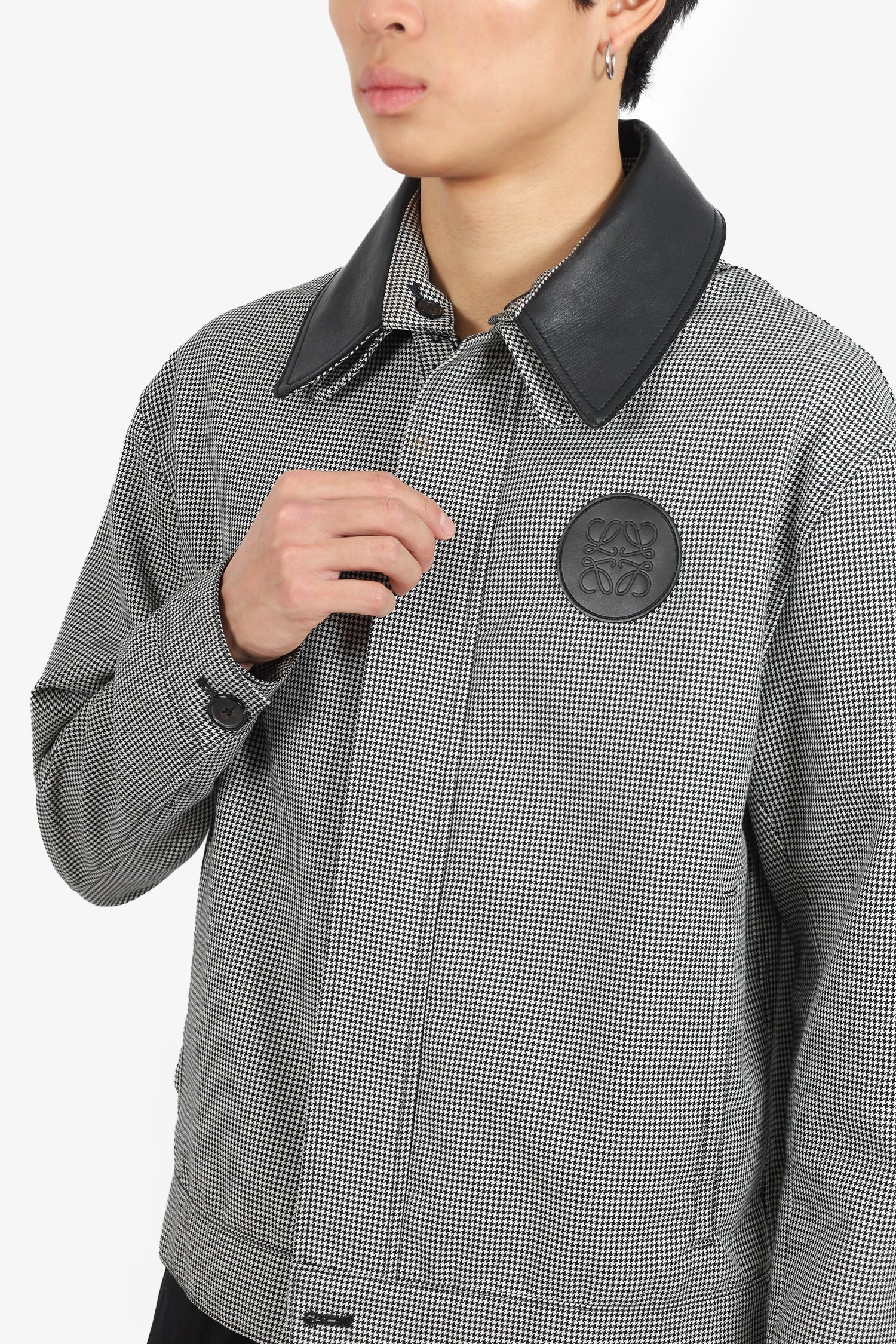 Refresh availabilityLoewe Black/White Houndstooth Zip Jacket with Leather Collar. Removable leather collar. Front zip with button closure. 2 front slip pockets. Button sleeve cuff closure. Leather logo on top left side. Adjustable button strap detail on sides of waist. Lined. Tonal stitching.