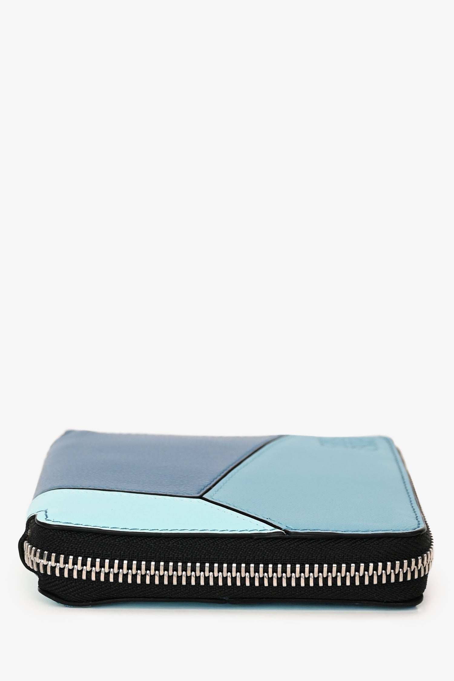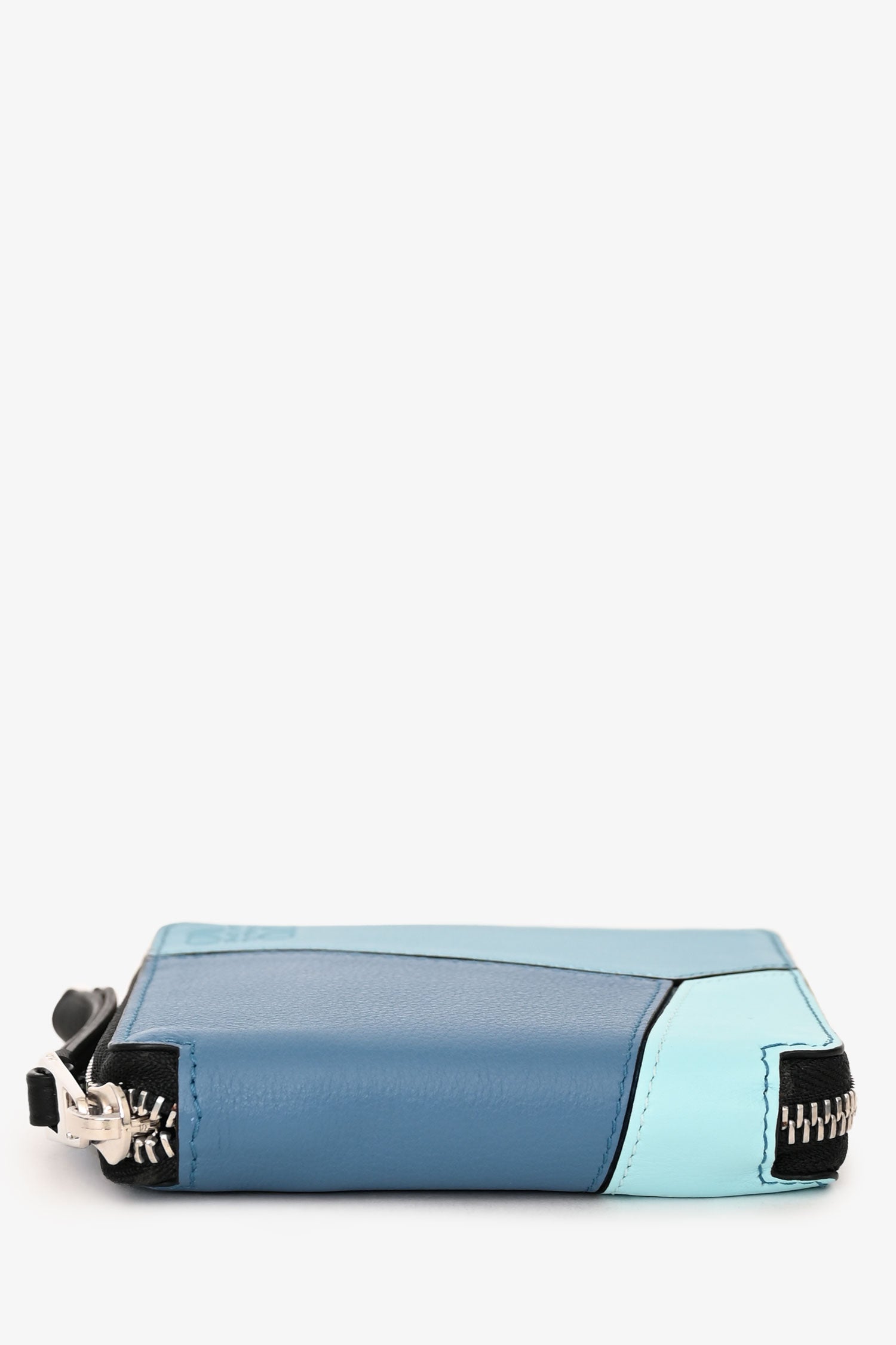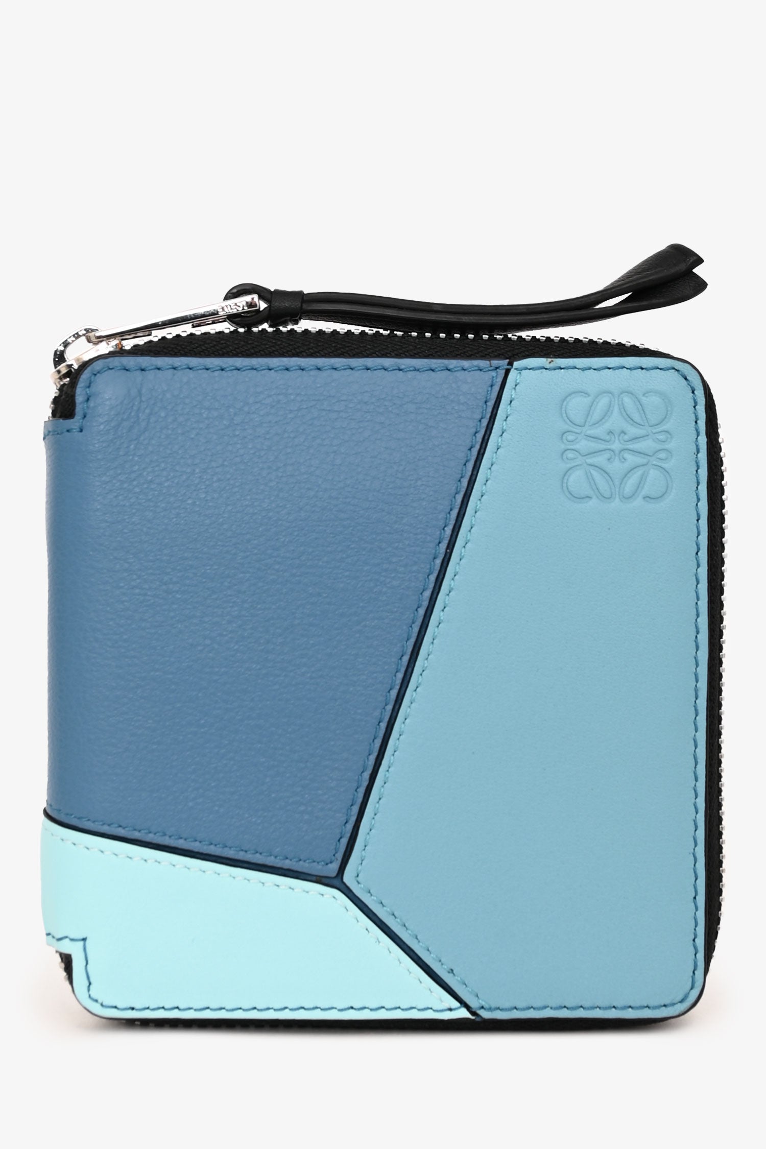 Refresh availabilityLoewe Blue Leather Puzzle Square Zip Wallet. Top zip-around closure. 6 interior pockets; 1 bill compartment, 1 snap coin pocket, and 4 card slots. Silver-tone hardware. Tonal stitching.