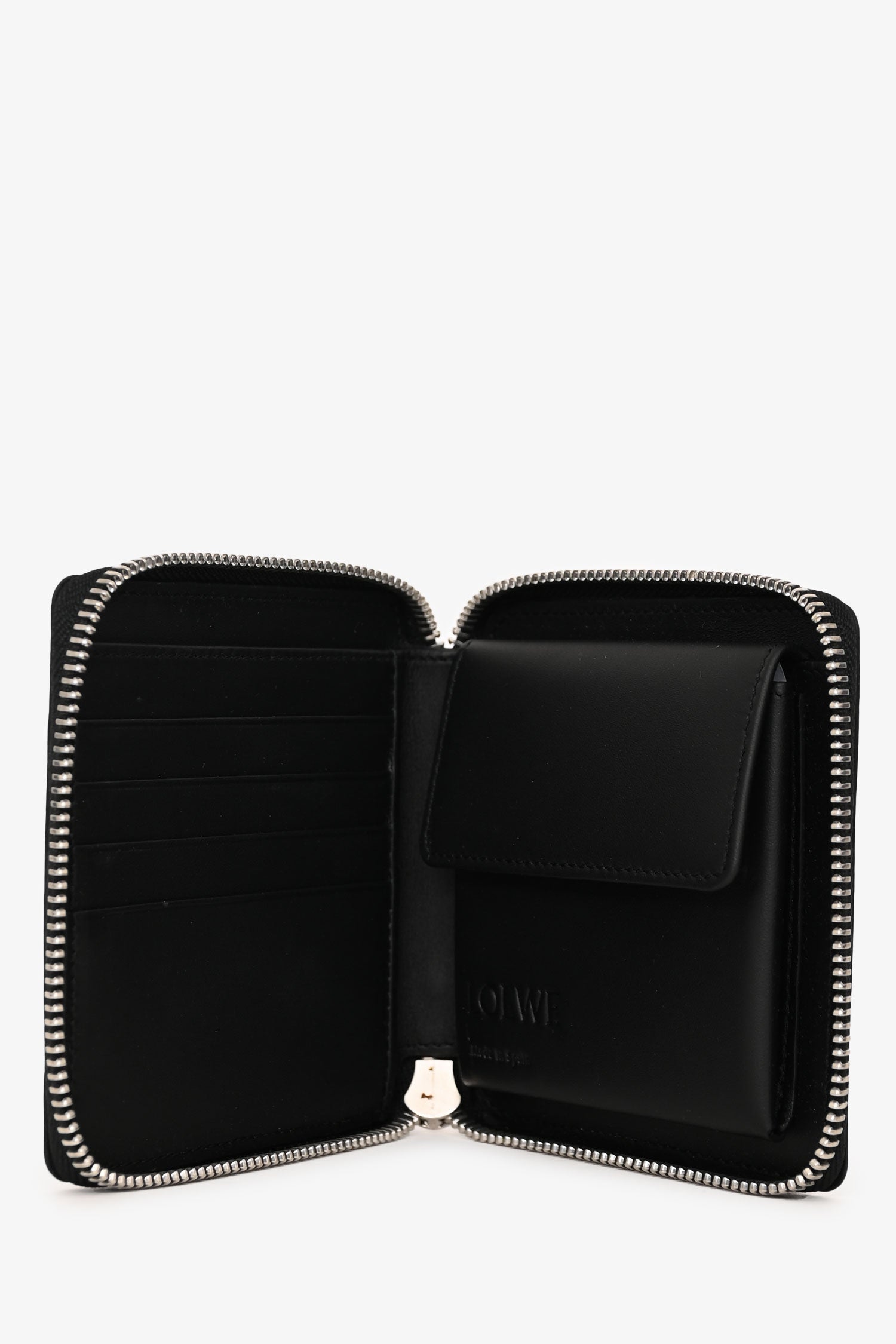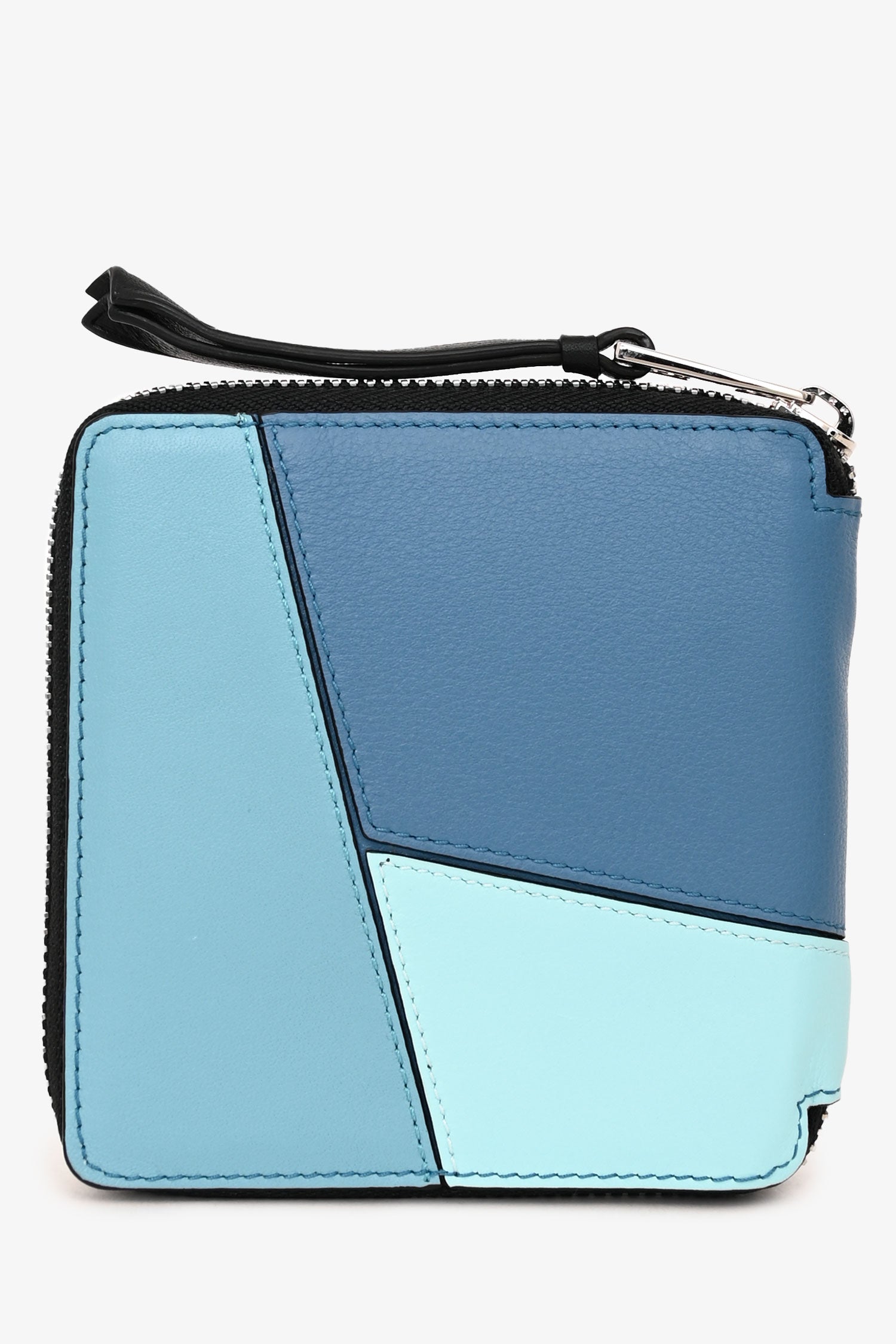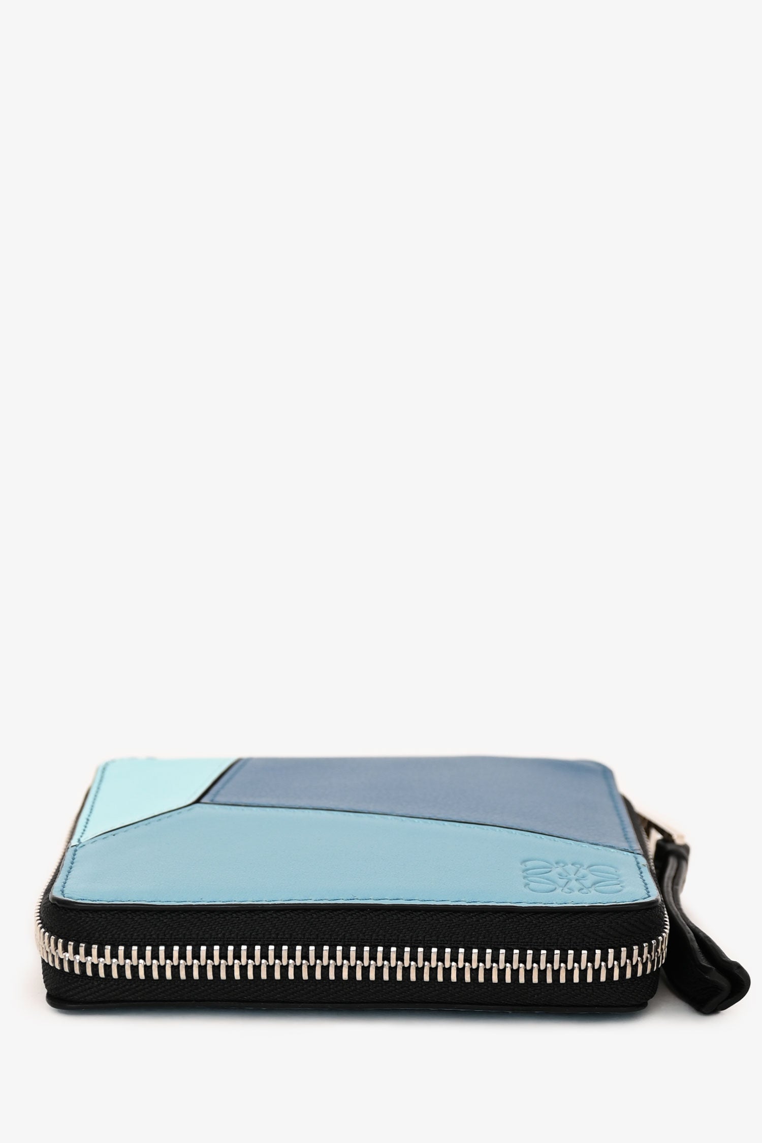 Refresh availabilityLoewe Blue Leather Puzzle Square Zip Wallet. Top zip-around closure. 6 interior pockets; 1 bill compartment, 1 snap coin pocket, and 4 card slots. Silver-tone hardware. Tonal stitching.