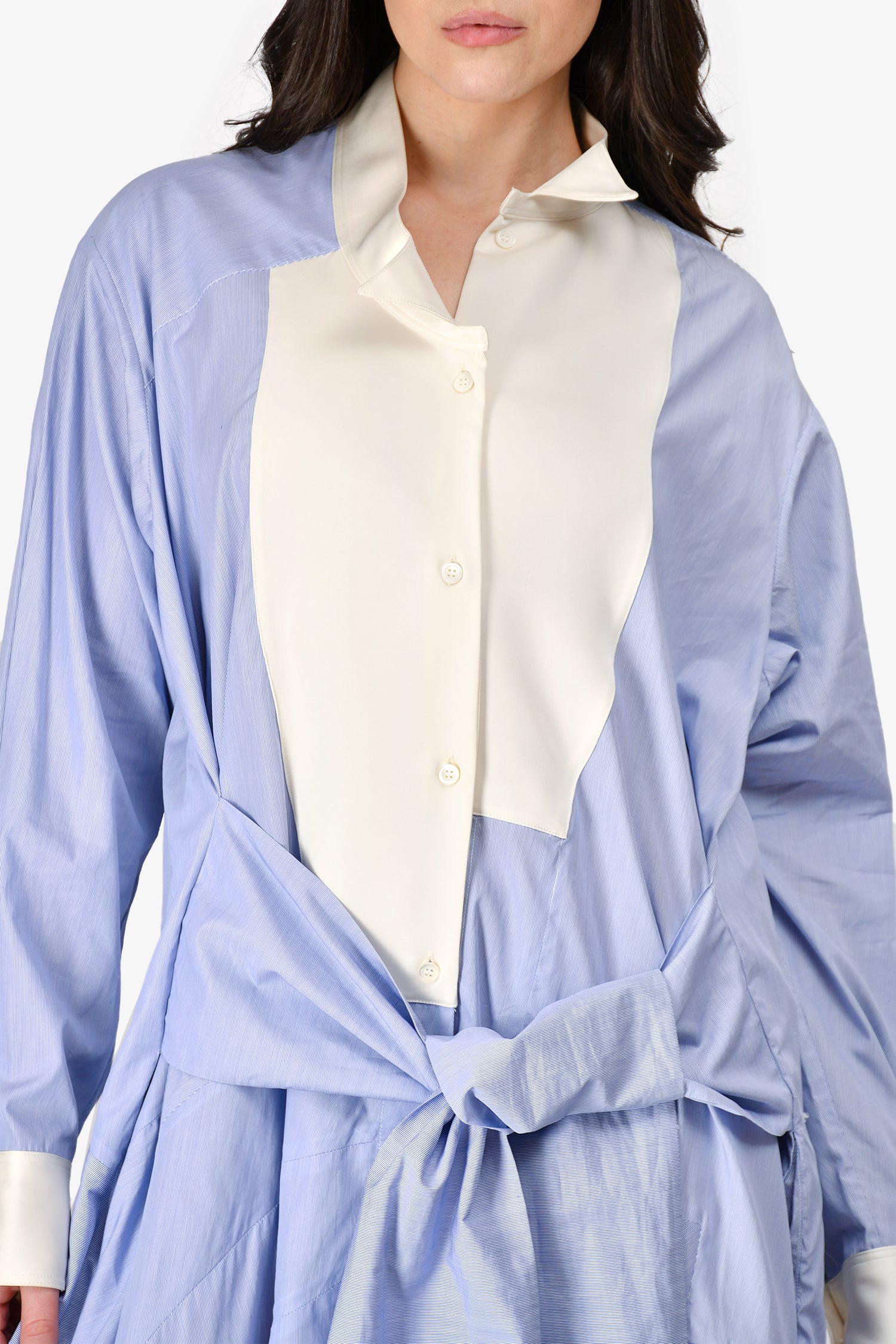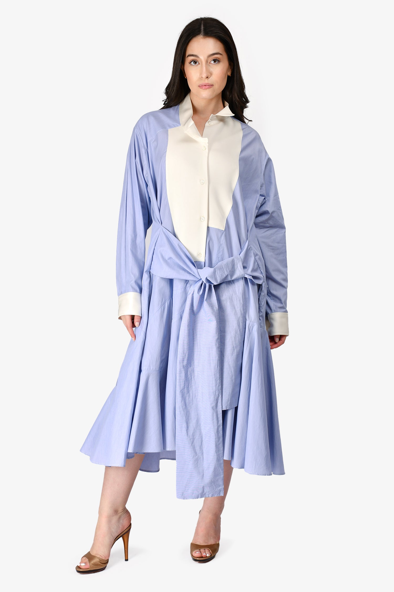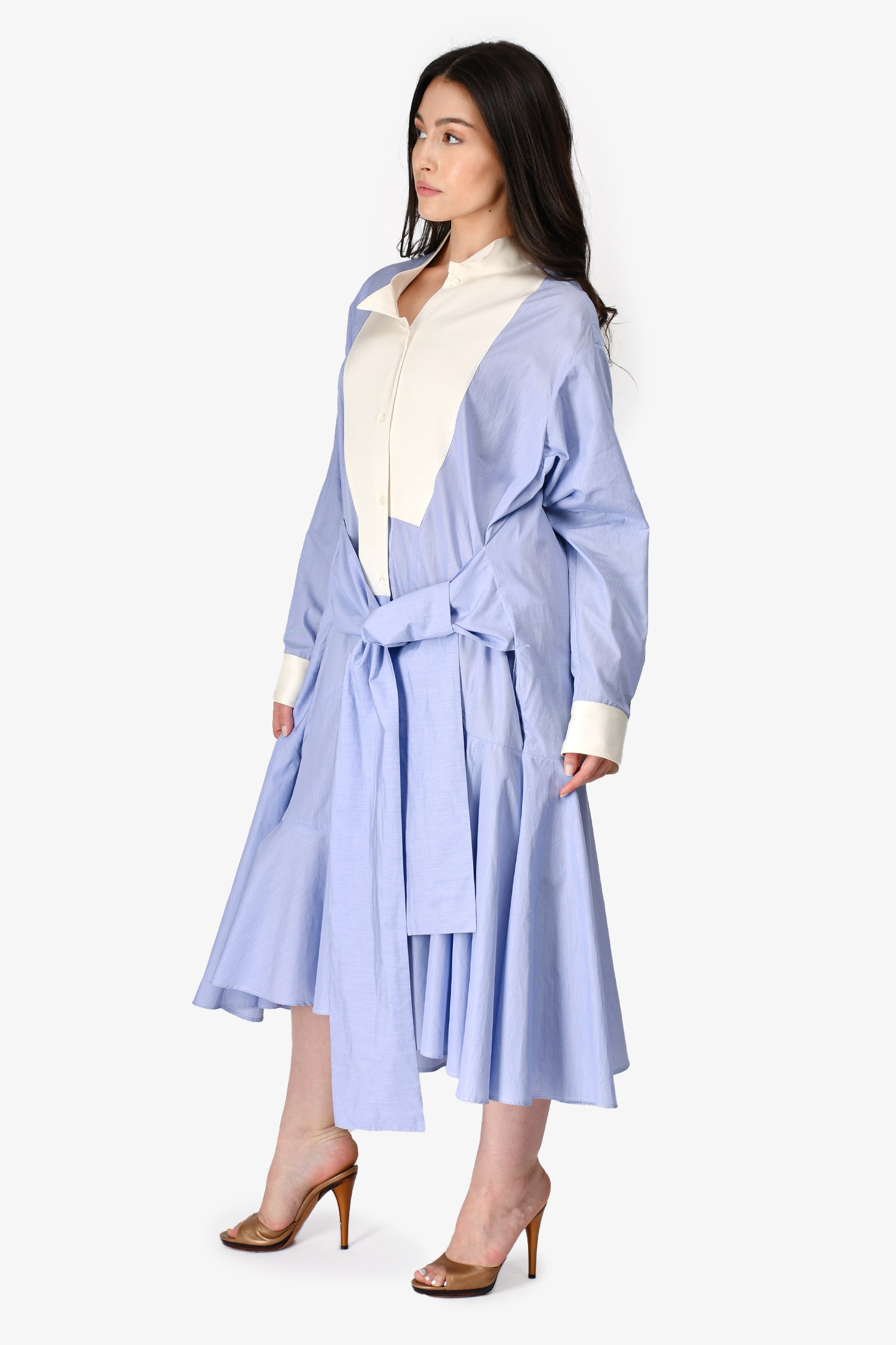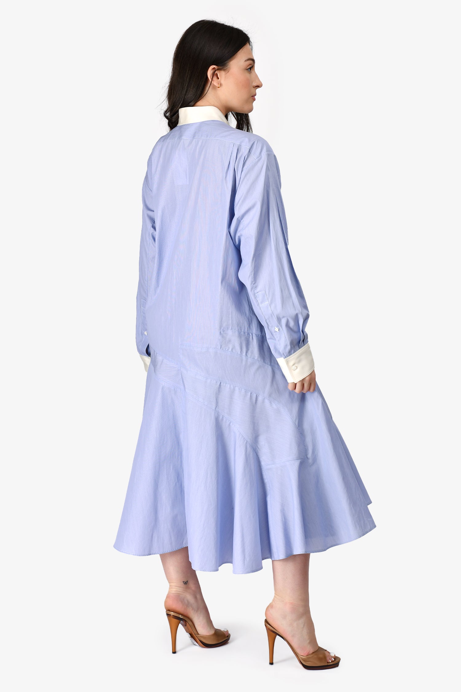 Refresh availabilityLoewe Blue/White Long Sleeve Shirt Dress. Front button-up closure. Two side slip pockets. Features a wide tonal waist strap for styling. Buttoned cuffs. Tonal stitching.