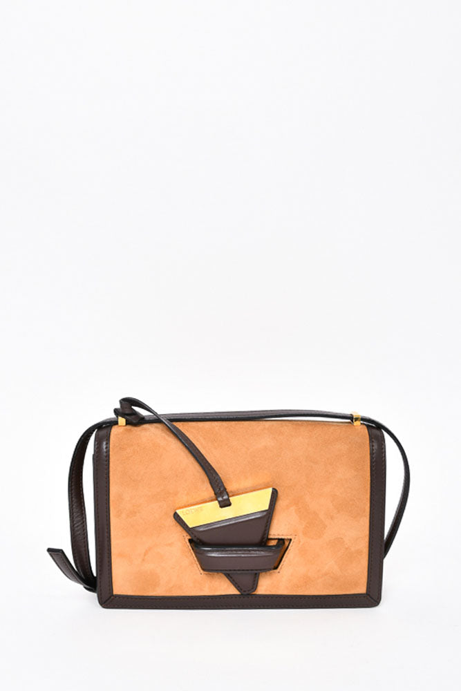Loewe Brown Suede/Leather "Barcelona 24" Shoulder Bag. Front foldover flap with slide-in closure. 3 interior compartments; separated by a divider. Outer rear pocket with snap-button closure. Adjustable strap. Gold-tone hardware. Tonal stitching.