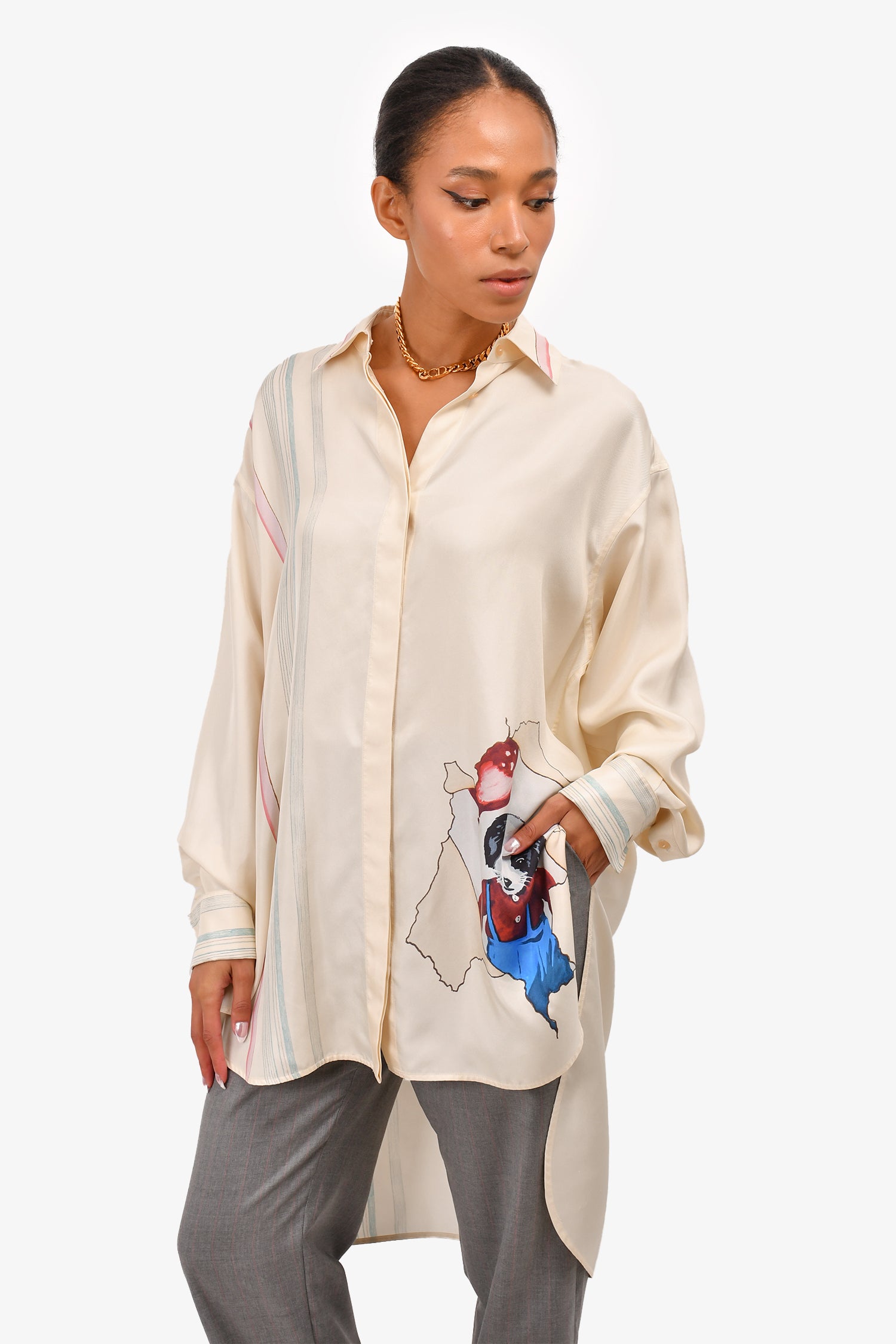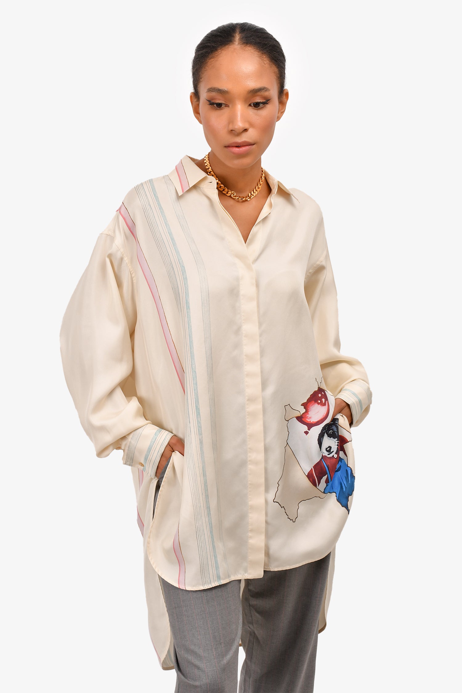 Loewe Cream Puppy Printed Silk Button Down Shirt Dress Size 36
