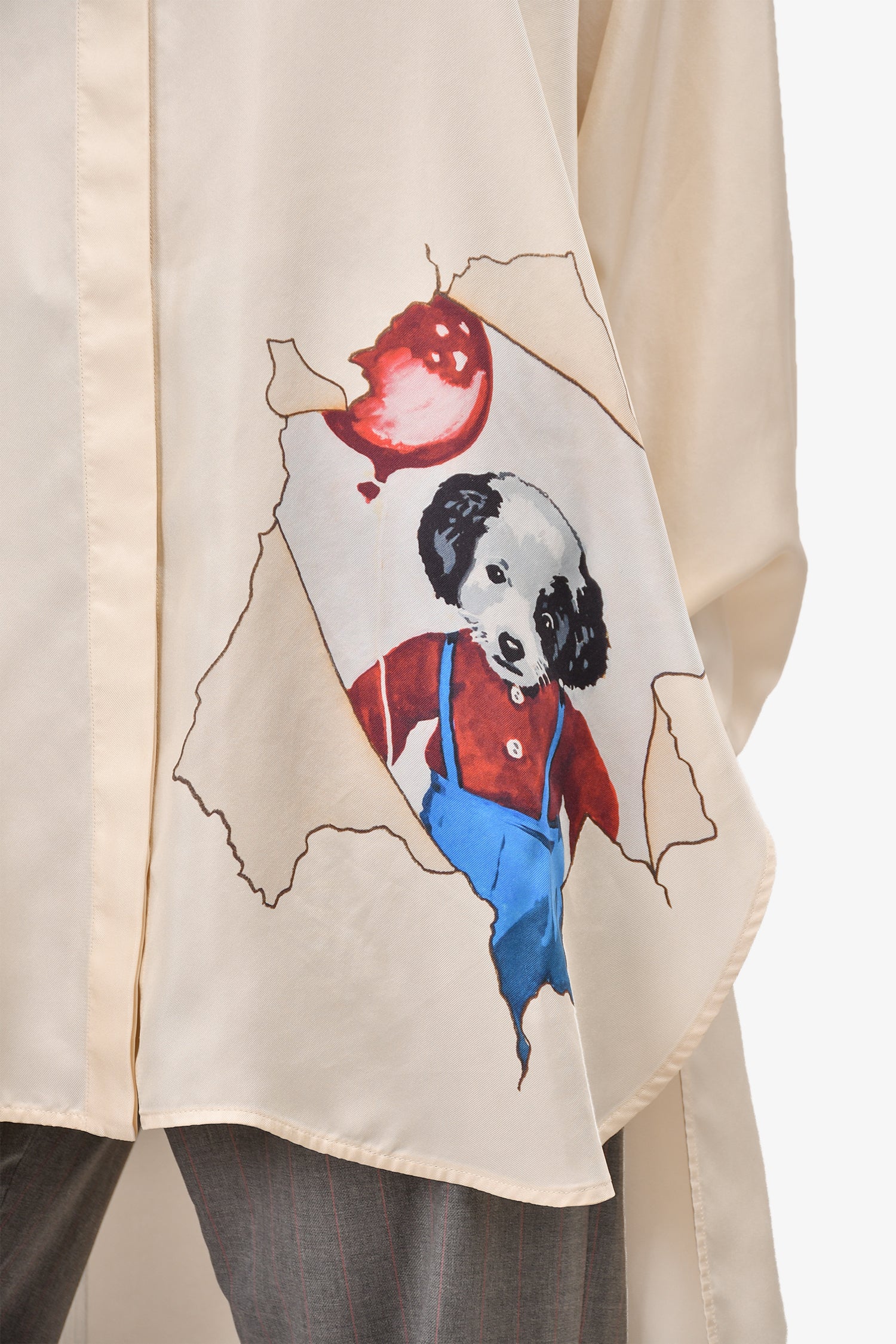 Refresh availabilityLoewe Cream Puppy Printed Silk Button Down Shirt Dress. Hidden button-up closure. Cuffed at the sleeve. Longer at the back. Tonal stitching.