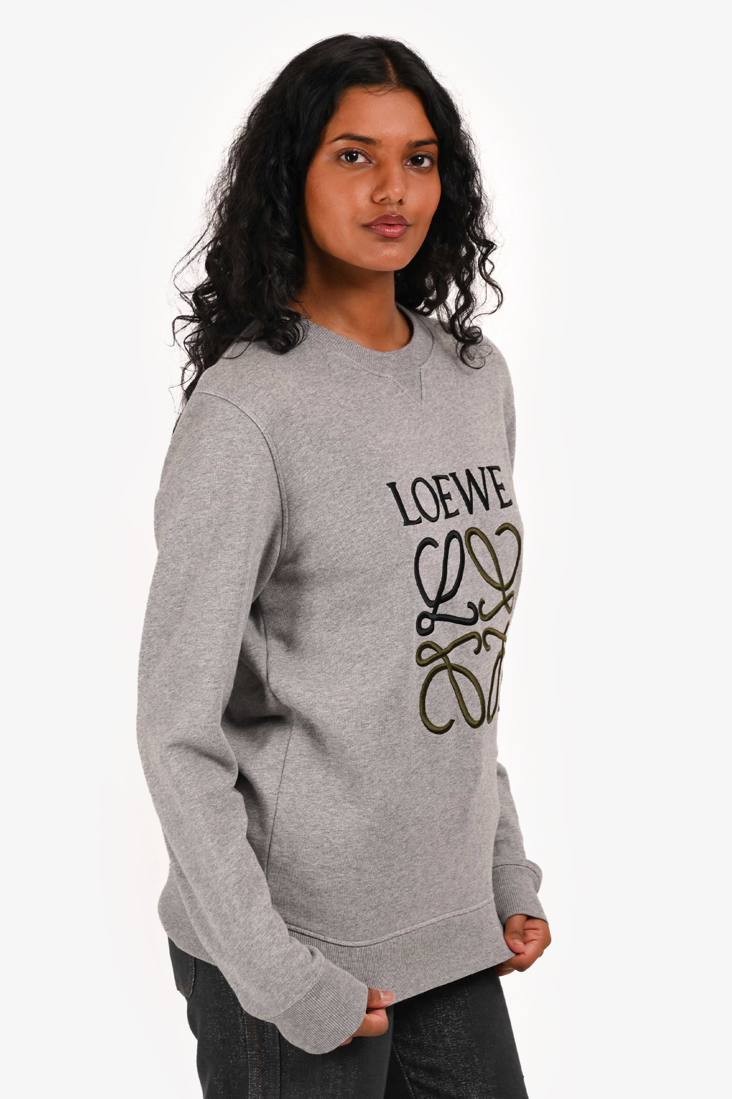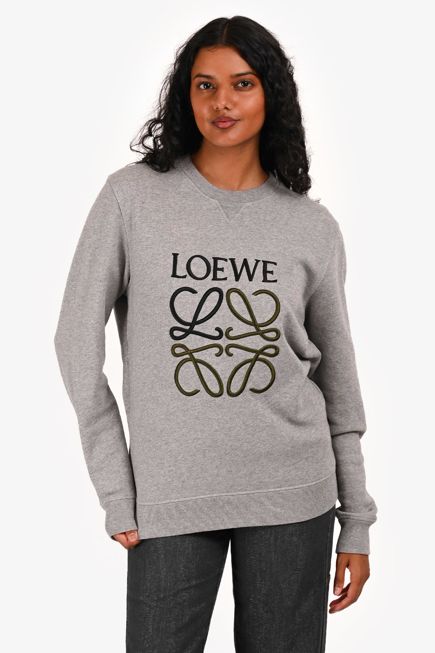 Refresh availabilityLoewe Grey Cotton Black Embroidered Logo Crewneck Sweater. Long sleeves. Rib knit collar, cuffs, and hem. Tonal stitching.