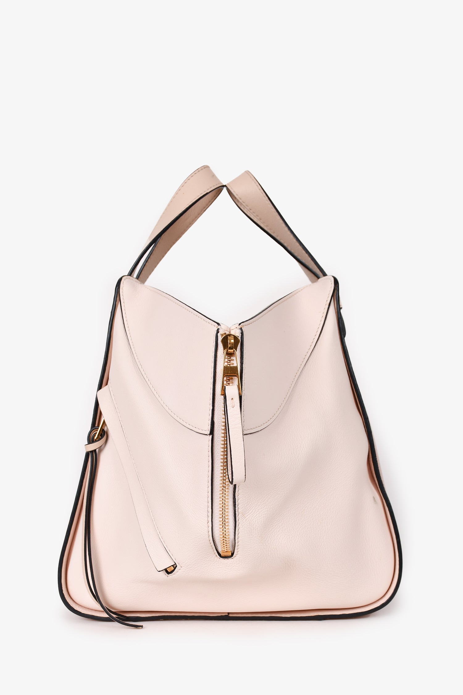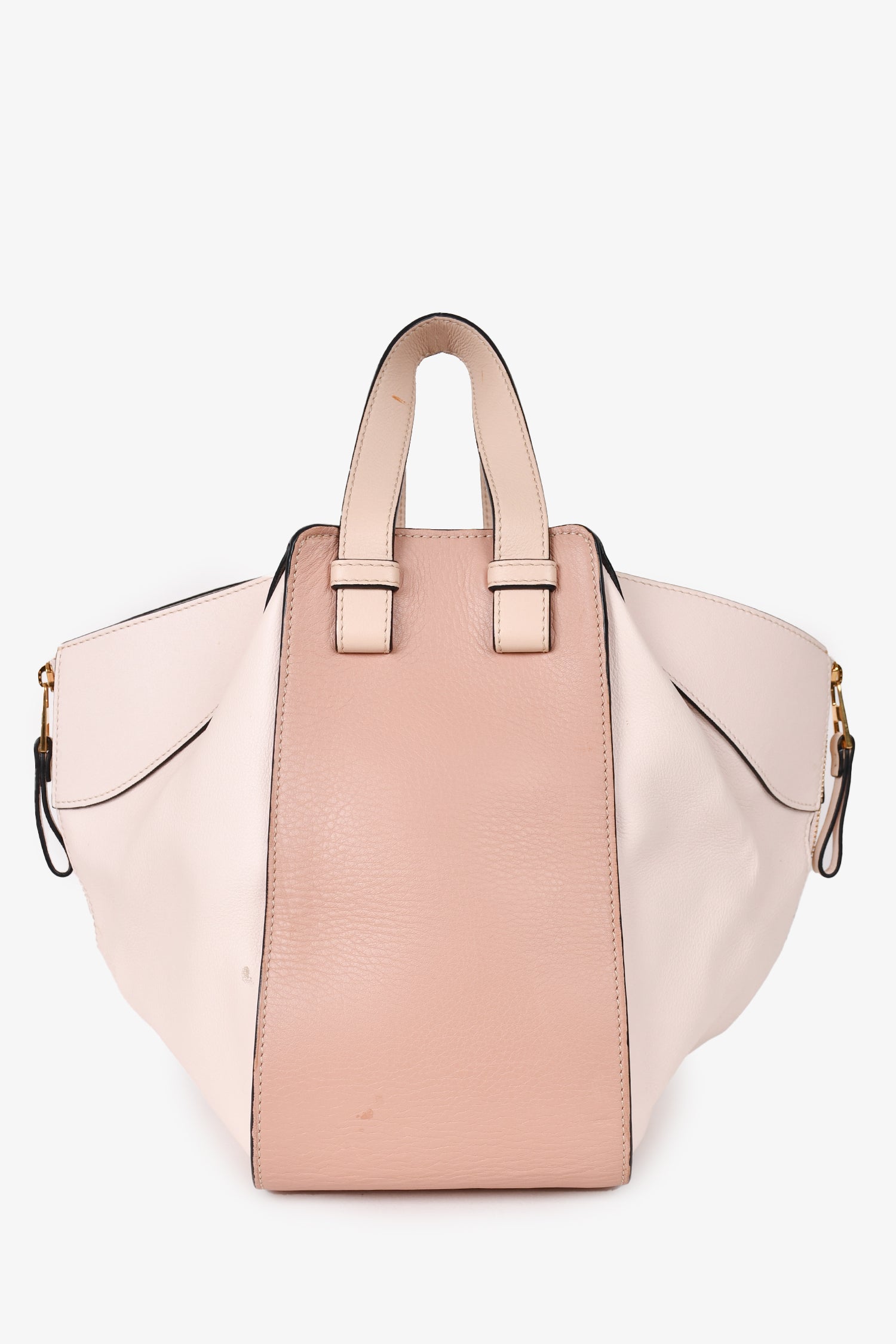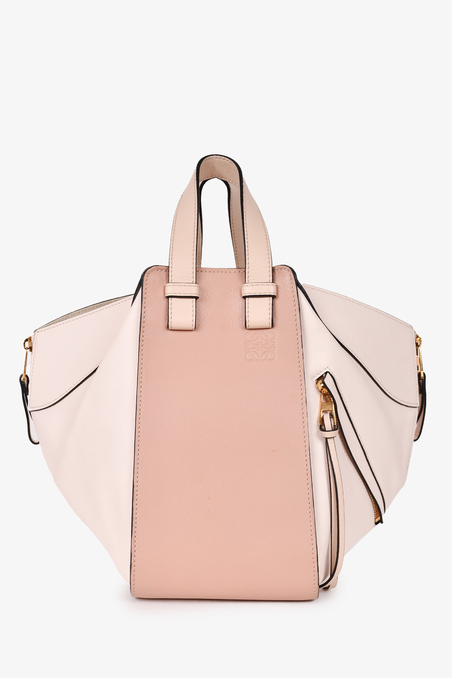 Refresh availabilityLoewe Pink Leather Small Hammock Tote with Strap. Tonal stitching. Leather trimming. Flat top handles. Canvas lined interior. Hook closure in interior. Dual interior pockets. 3 zippered compartments with leather pull tabs.