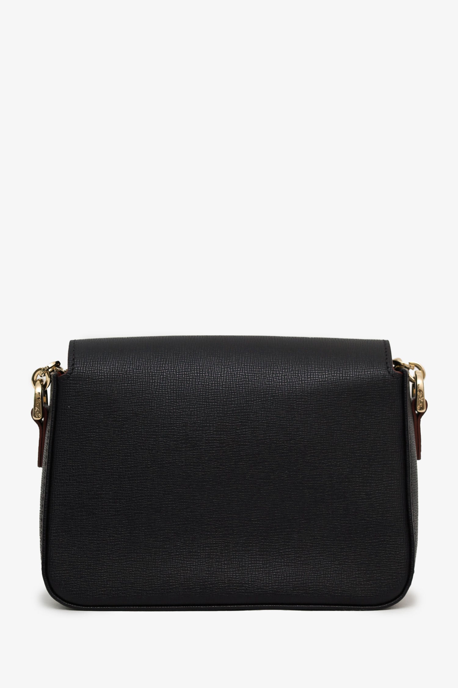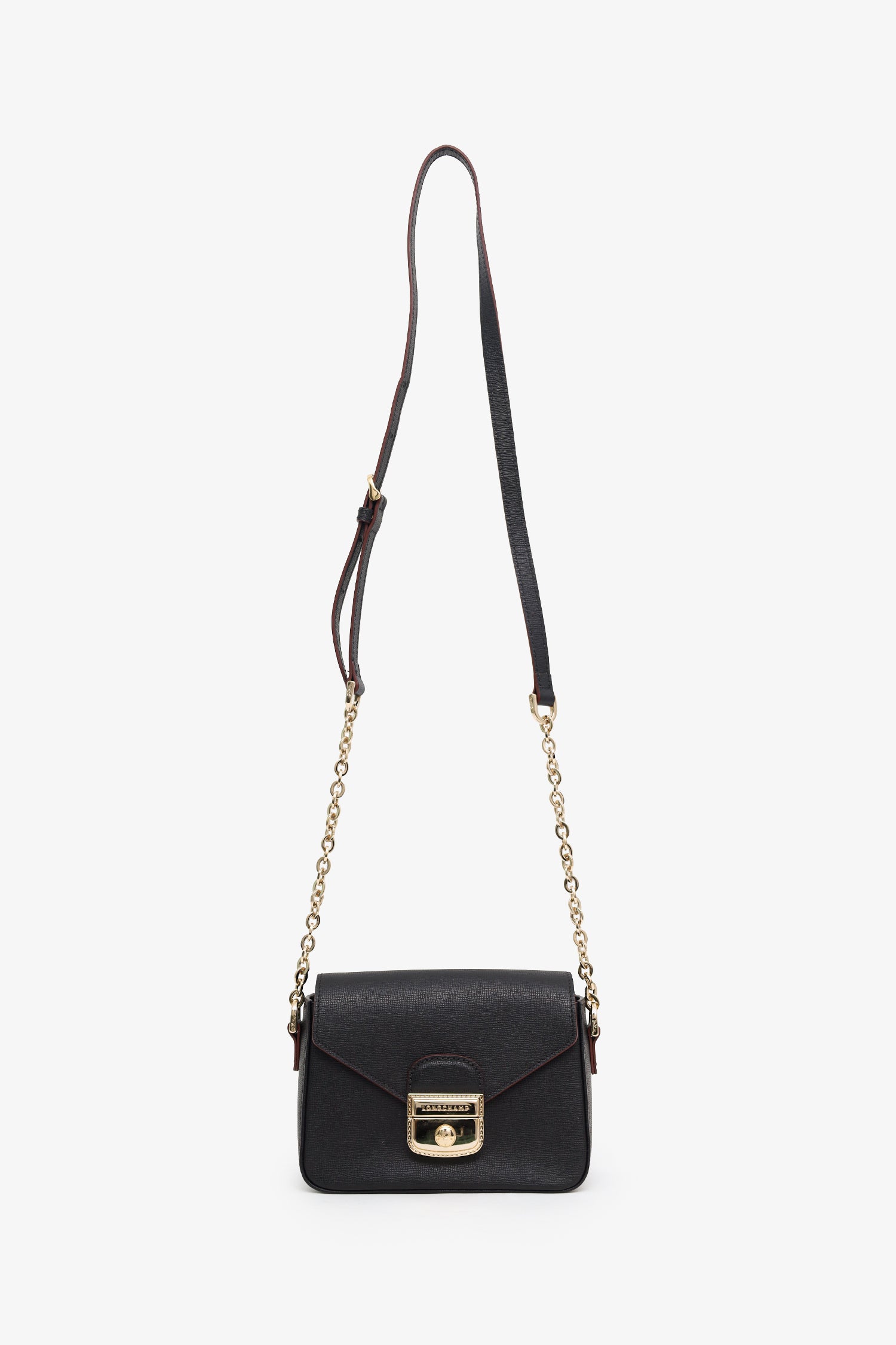 Refresh availabilityLongchamp Black Saffiano Leather Le Pliage Heritage Crossbody Bag. Front fold-over flap with push-lock closure. Chainlink/leather crossbody strap with adjustable buckle closure. Lined interior. 2 interior pockets; 1 zip and 1 slip. Gold-tone hardware. Tonal stitching.
