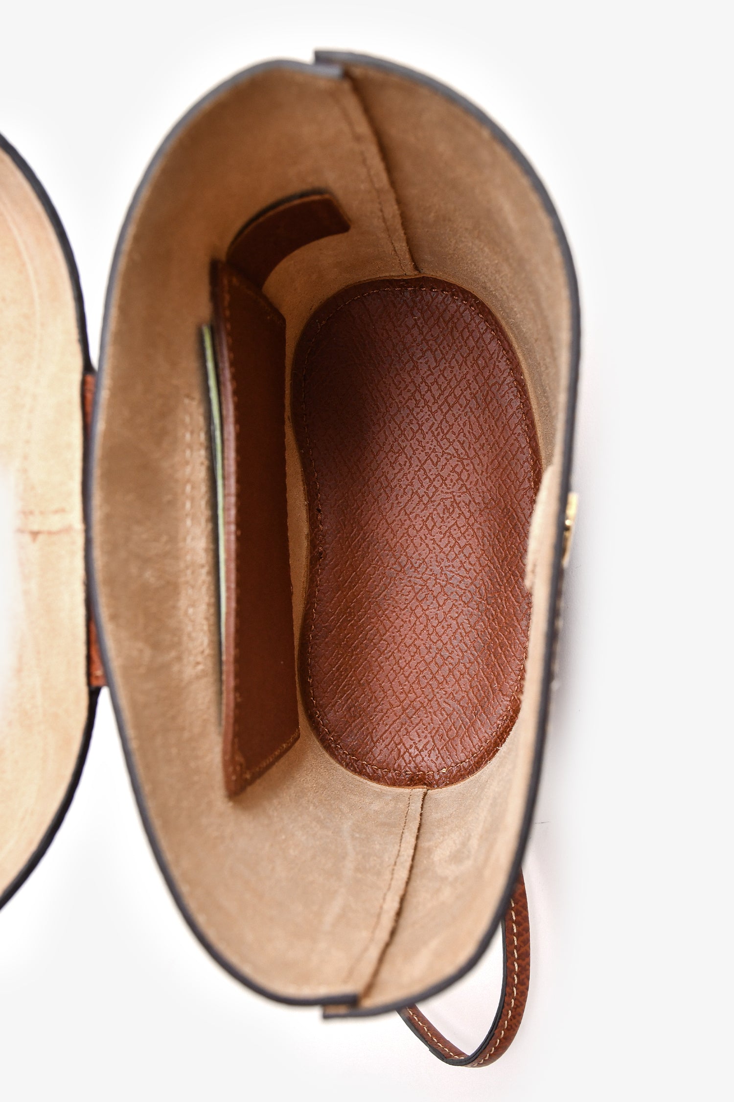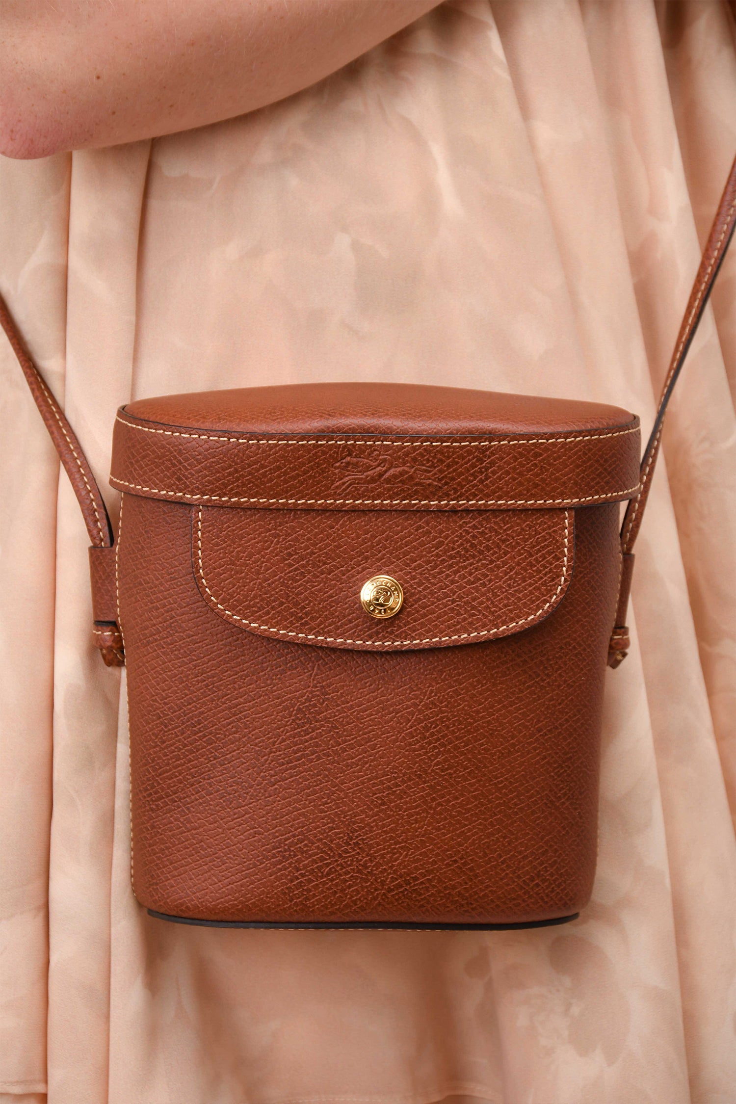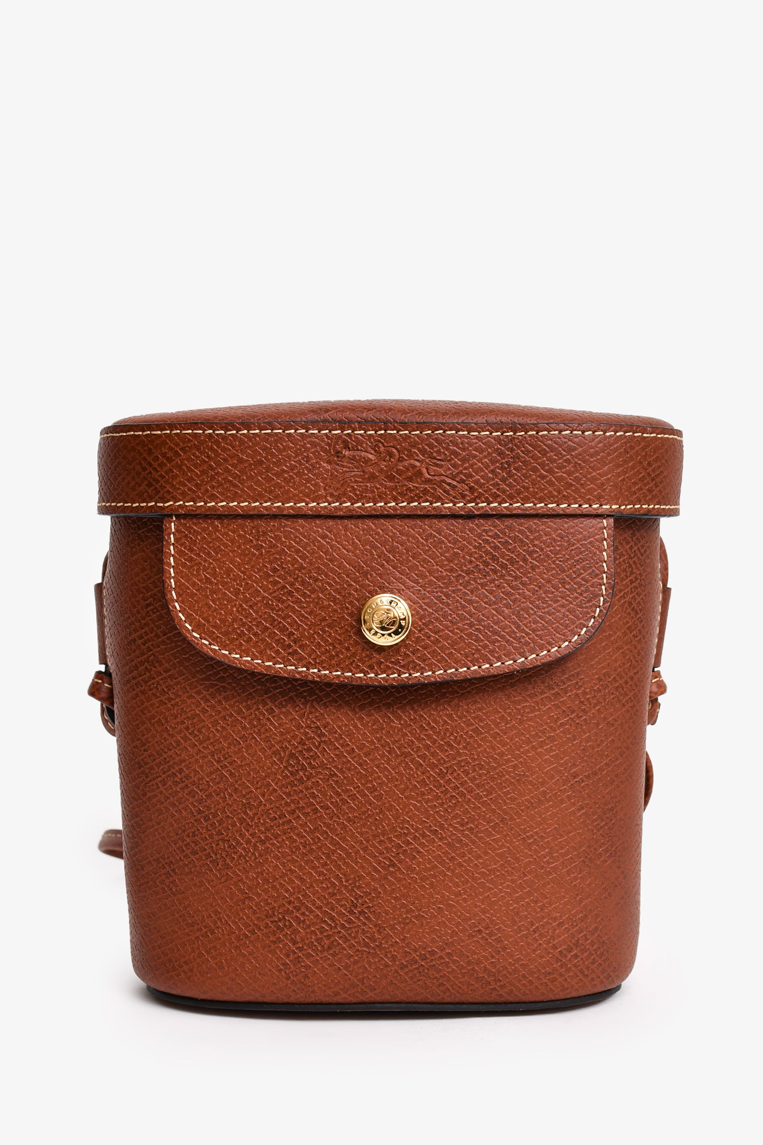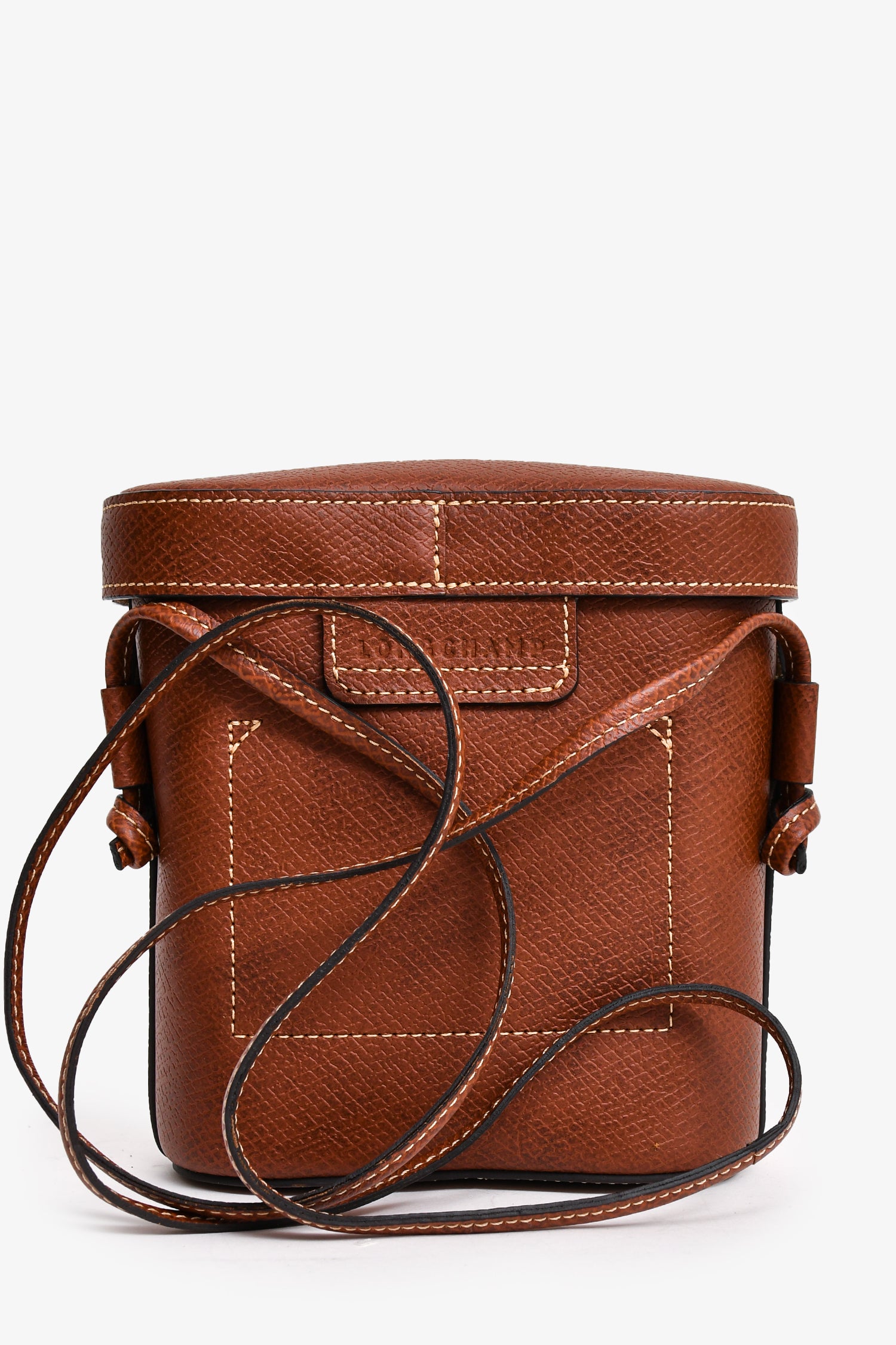 Refresh availabilityLongchamp Brown Leather Crossbody. Contrast stitching. Fold-over lid with a snap closure. Suede-lined interior. Leather trimming. Interior slip pocket. Leather crossbody strap.