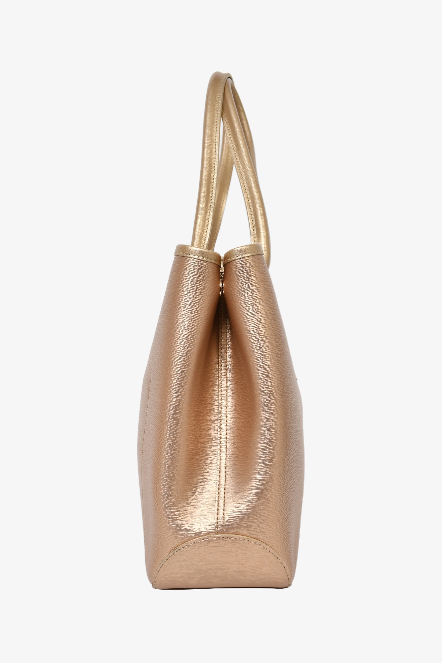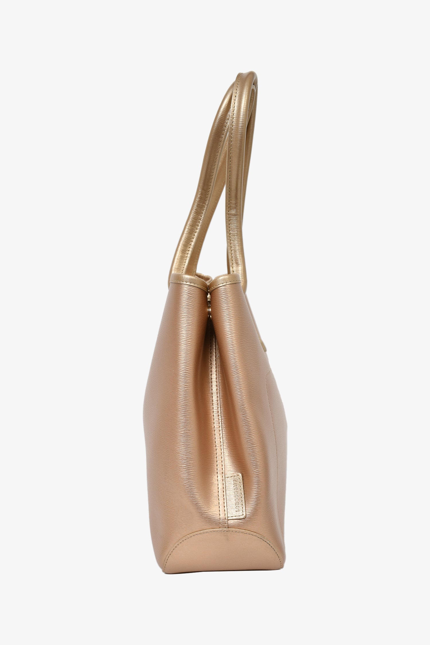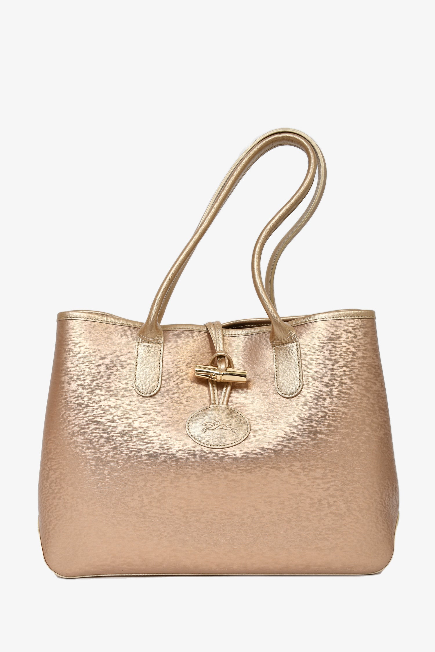 Refresh availabilityLongchamp Rose Gold Leather Tote. Fold-over flap with toggle closure. Pink interior. Single interior pocket with zip closure. Tonal stitching.