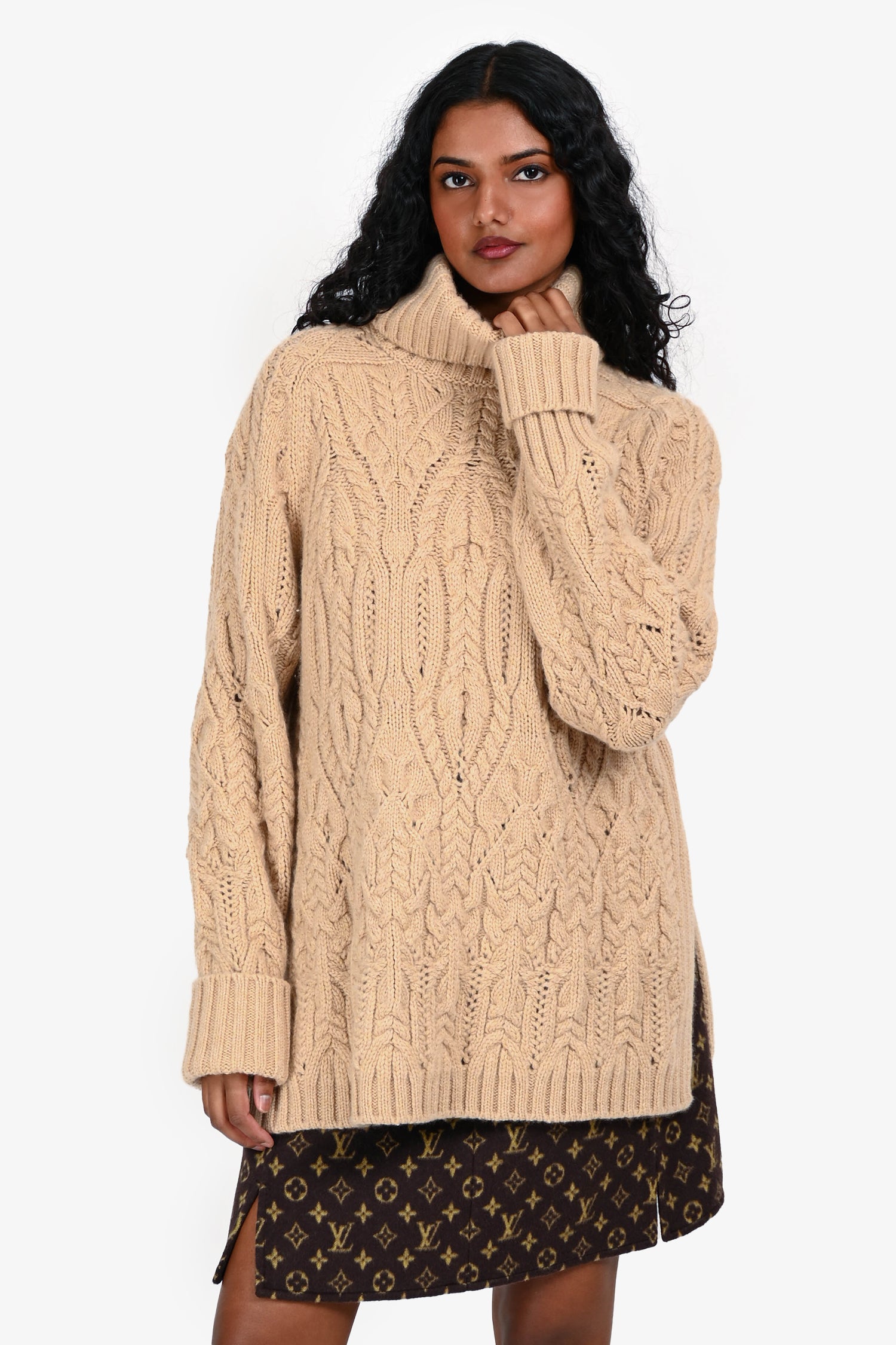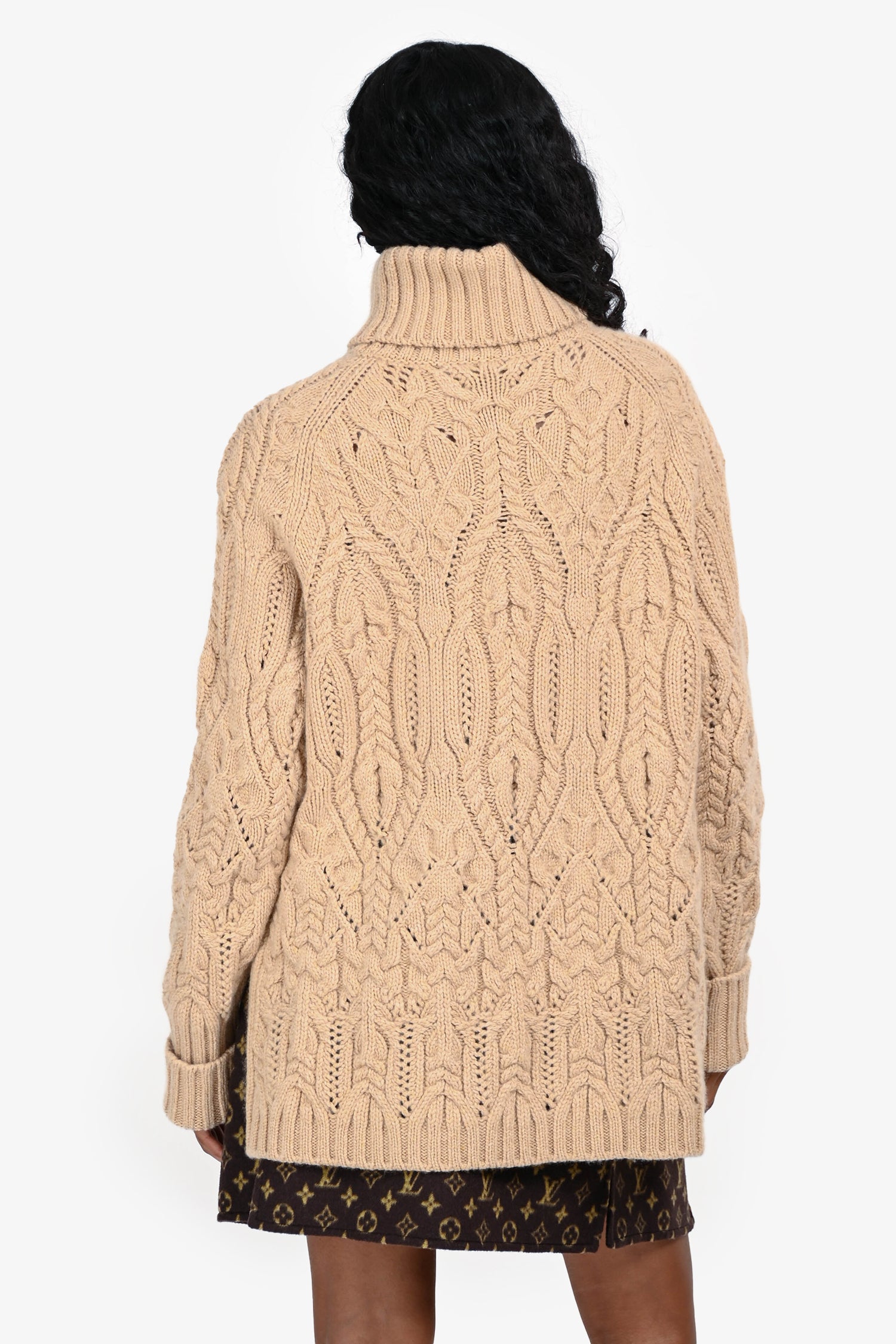 Refresh availabilityLoro Piana Brown Cashmere Cable Knit Turtle Neck Sweater. Ribbed turtleneck, cuffs, and hem. Symmetrical side slit. Pull-on. Tonal stitching.